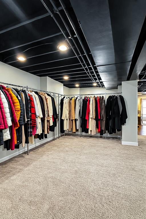 Walk in closet featuring vaulted ceiling, dark wood-style floors, and ceiling fan
