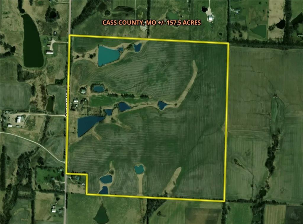 This 157.5± acre property in Cass County, MO, brings a lot to the table. This farm has a combination of productive agricultural ground, numerous ponds for recreation, and multiple potential home sites. The property includes 125± tillable acres with predominantly Class 2 soils, supporting farming operations while also offering flexibility for other uses such as rural living or recreational use. The landscape has gently rolling topography with multiple potential building sites. Elevated areas across the property offer views of the surrounding countryside and overlook several ponds located throughout the tract. Water and electricity are already available on site, which can simplify future planning for a residence, farm headquarters, etc. Water resources are a notable feature of this property. There are a total of ten ponds across the acreage, including two ponds that are approximately two acres each. The remaining ponds vary in size. These ponds may serve agricultural purposes such as livestock watering or irrigation support, while also contributing to the overall landscape and wildlife presence on the property. The waterfowl opportunities on the property are substantial. With 7 +/- acres of water, waterfowl will have plenty of resting and feeding opportunities across the property. The majority of the acreage is currently in tillable production, which can provide a yearly income if desired. Access to the property is provided by a single road running along the west boundary. This limited road frontage helps maintain privacy while still allowing easy access for personal use or farm equipment. In addition to agricultural and recreational considerations, with the utilities on site and varied topography, the property is suitable for those seeking a rural residence. Multiple areas across the tract offer building locations with views of the surrounding land and water features. This is part of a wholesale transaction. Seller has permission to market in this manner.