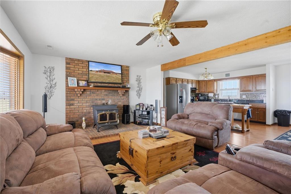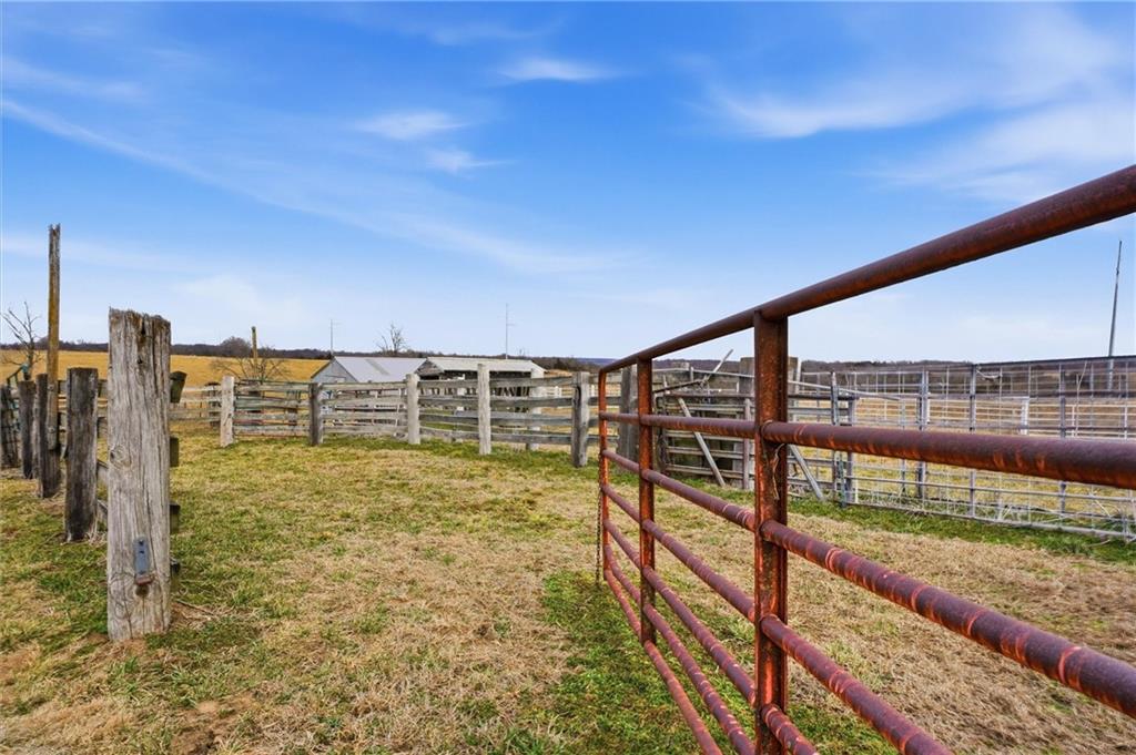 Beautifully maintained ranch home on 19+/- rolling acres featuring 2 main level bedrooms plus 3 non-conforming bedrooms in a fully finished walkout basement complete with a large second kitchen and spacious living room. Meticulously prepped for your comfort and located just 25 minutes from Kansas City, this property delivers the perfect mix of comfort, function, and wide open space. As you drive up, scenic views unfold across your land, buildings, fencing, and stocked pond. The large covered front porch is made for conversations that turn into lasting memories. The main level offers an open concept layout filled with natural light. The kitchen has northern exposure to the property, while the living room features large south-facing windows. Two oversized bedrooms sit on the main floor, including a spacious primary suite with private bath and pond views. A full hallway bath adds convenience. The kitchen includes granite countertops and space for a full size dining table. The walkout basement expands the living space with three additional non-conforming bedrooms and direct outdoor access, ideal for multi-generational living, guests, or entertaining. Formerly a cattle farm, the property is well suited for horses and includes recently painted fencing and gates, refreshed barns, and five total outbuildings. The 40x60 shop with concrete floors and power offers serious workspace. Fencing supports multiple farm animals, including that sought after Highland cow. An additional acreage directly north is available to expand your farm life even more. In the spring, the land comes alive with lush grass and vibrant views. Peaceful country living with city access within minutes. Well cared for. Move in ready. Built for lifestyle and legacy.
