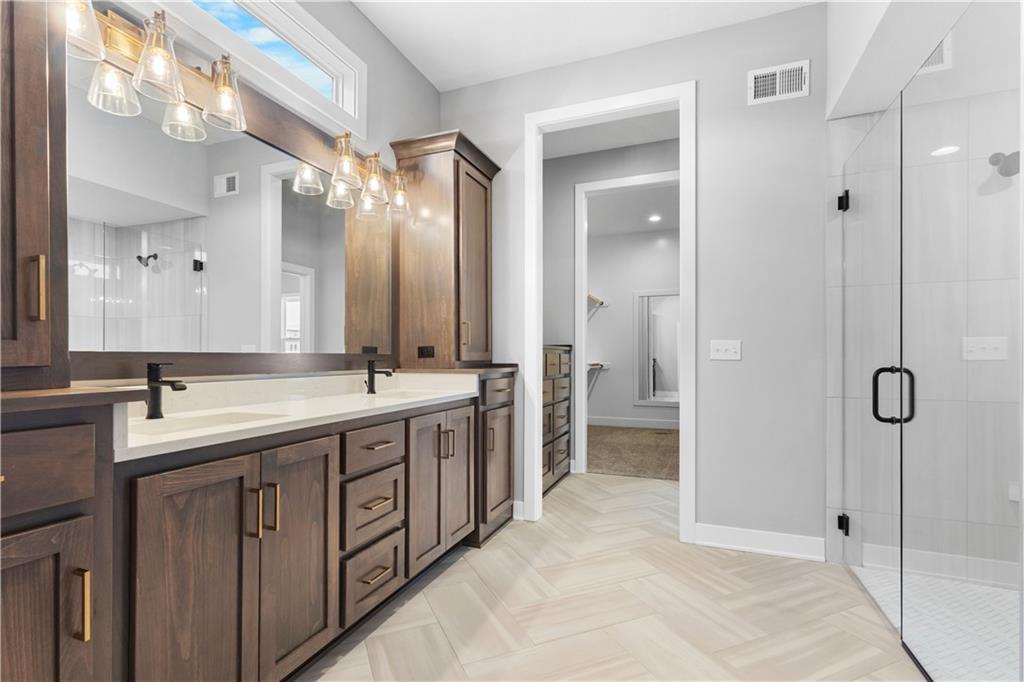 This home will be move in ready April 2026! This incredibly stunning Sonoma reverse 1.5 story offers not one but TWO primary suites on the main level, each with its own private ensuite bathroom! The main primary suite is designed with luxury in mind, featuring a zero-entry shower and a huge walk-in closet with custom shelving. In addition, the home has a gorgeous kitchen with ample storage and counter space, open to the dining area and great room—a perfect gathering spot! The 10-foot ceilings on the main level are highlighted by a stunning stone floor-to-ceiling fireplace in the great room, which also hosts the largest dining area out of any of our home plans. The main level also offers the convenience of having an additional powder room for guests, the laundry room adjacent to the primary bath, and a mudroom off of the garage. And the lower level of the home has the ULTIMATE entertainment area: with an oversized rec room, a modern wet bar, two large bedrooms, and a full bath, the Sonoma has one of the best basements for family and guests to enjoy their own space--or for you to host large parties! And you can enjoy your spacious backyard from your covered patio. Inspired Homes also provides fully irrigated and landscaped yards, garage door openers, tray ceilings, built-in GE appliances, custom trim & accents throughout, and so much more! Also located in the peaceful & sought-after Hilltop Farms neighborhood in Olathe, this property offers a lifestyle characterized by both comfort and convenience. Residents can indulge in community amenities including a zero-entry pool and sun cabanas, a large "tot-tot" playground & gaga ball pit, pickle ball courts, basketball & volleyball courts, local walking trails, & expanses of green space to enjoy. All sports courts are currently in and the pool & playground will be open Spring 2026!
