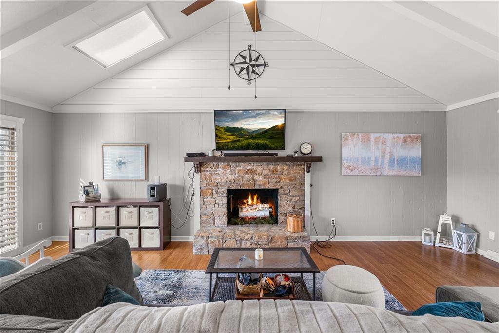 Come live the lake life in this gorgeous 2nd tier home! Enjoy the beautiful view of the lake from the large front porch and relax on the huge, private, treed backyard deck. Plenty of wild life to enjoy around the firepit area. This cozy updated home gives off a lovely beach vibe with adorable ship lap, open floor plan, fireplace, and plenty of storage room in the upstairs attic space. Vaulted ceilings, hardwood and LVP throughout, and the kitchen is a show stopper. Granite, kitchen island and all appliances stay with the home (including the washer and dryer in the oversized laundry room) and a bonus sunroom/office space right off the kitchen with an outstanding view of the backyard. The finished lower level offers a fireplace and full bathroom - could easily be a 4th bedroom area. Roof age 8 years, HVAC 4 years new, hot water tank 3 years new and all suggested foundation work has been completed (see supplements). Completely move-in ready so you can start enjoying the lake life while also enjoying nature in the privacy of your backyard! No dock registered to property but easy access to the lake right down the street.