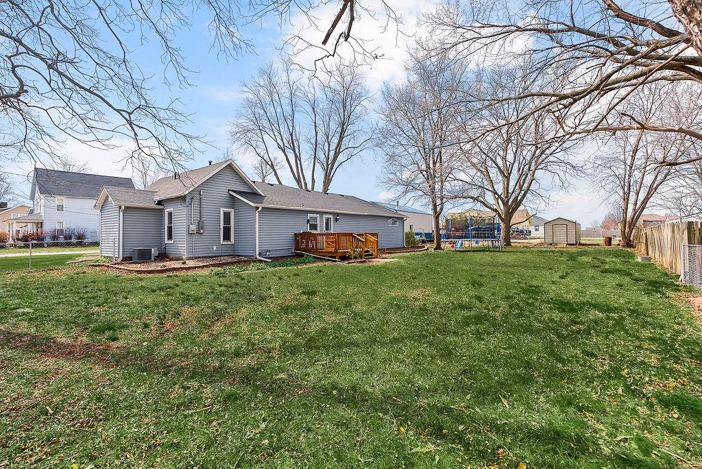 Spacious, easy one-level living at its best! The cozy family room welcomes you with a charming bay window, custom blinds, built-in shelving, and a warm fireplace—perfect for relaxing evenings at home. Entertain with ease in the large formal dining room, featuring classic wainscoting, durable wood-look flooring, and a ceiling fan for added comfort. The open kitchen is a standout with granite countertops, abundant cabinetry, stainless steel appliances, and a pantry for extra storage. The private primary suite is thoughtfully positioned on one side of the home, offering a peaceful retreat with its own ensuite bath and an oversized walk-in closet with stylish barn door. All bedrooms include walk-in closets, ceiling fans, and blinds—plenty of space and comfort for everyone. The third bedroom even offers a bright bonus sitting room or play space filled with natural light. A second full bath features tile flooring and a convenient shower/tub combo. You’ll also love the functional laundry room just off the kitchen, complete with additional pantry space and access to the cellar. Step outside to a HUGE fenced backyard that feels like it goes on forever—ideal for pets, play, or entertaining—plus a spacious deck ready for grilling season. Car enthusiasts, hobbyists, or small business owners will appreciate the attached 1-car garage AND the impressive 768 sq ft workshop next door, complete with a 2-car garage door, electricity, and a 10x10 covered entry. Bonus: Brand new roof! All of this sits on a desirable corner lot—giving you space, flexibility, and room to grow.