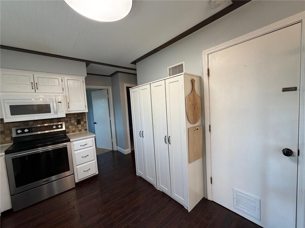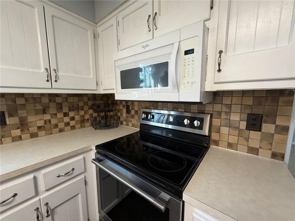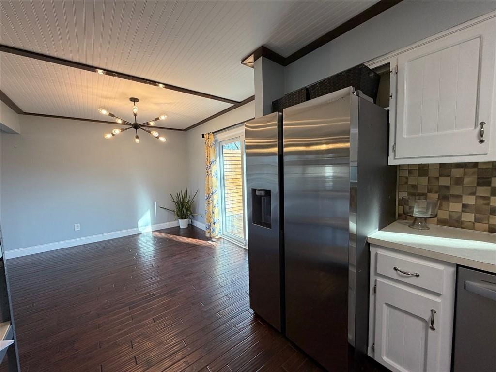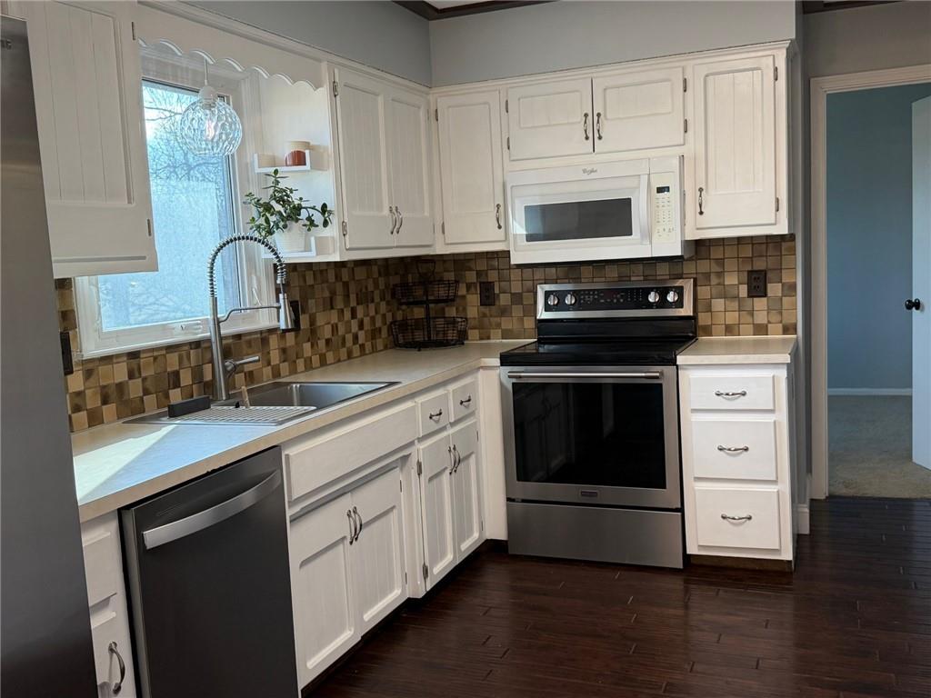 Peaceful cul-de-sac lot allowing for a generous back yard with a beautiful new deck, privacy wall and herringbone laid concrete block patio! Hard to find true 4 bedroom, raised ranch/2 story. Primary bedroom is on the second floor along with a large secondary bedroom and tiled 3/4 bathroom. Both bedrooms have walk-in closets. TWO bedrooms on the main floor with full bathroom. Slider to deck that overlooks the rear entry garage/basketball area. Landscaped fenced rear yard, fire pit area and play area. Farm-house single bowl, stainless steel kitchen sink, white cabinets, built-in microwave, white pantry cabinets and industrial shelves round out the kitchen. Front living room has a large picture window. Finished rec room has projector and pull down screen that will remain with the home. Masonry fireplace. Roof 8 years old. Lennox air conditioner new in 2022. Lennox furnace new in 2016. Rheem water heater new in 2017. Refrigerator to remain with the home.