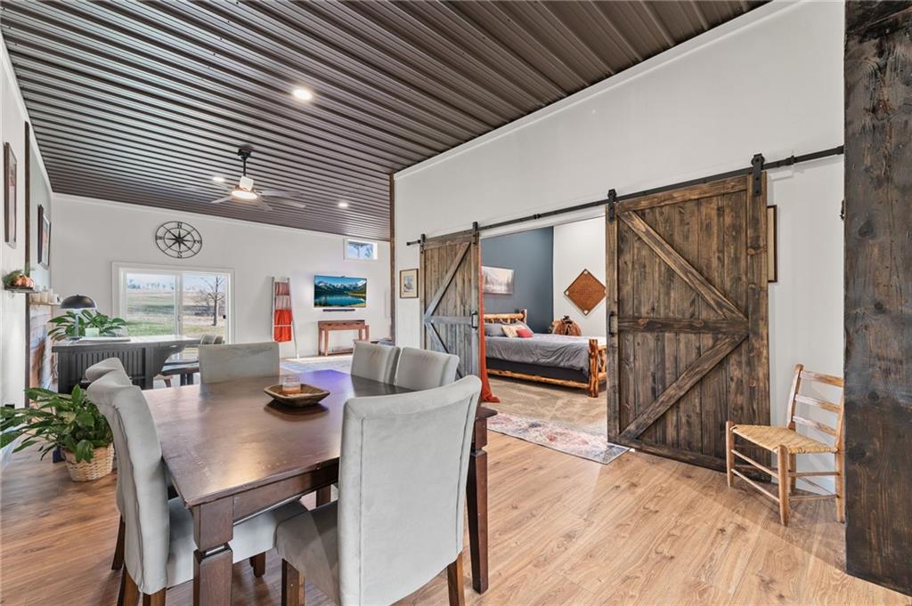 Welcome to your private slice of country paradise! Nestled on over 7.5 acres, this stunning barndominium has been thoughtfully expanded and upgraded to offer the perfect blend of charm, functionality, and wide-open space. Now featuring over 2,100 square feet, the home includes an additional bedroom, living area, and dining space—giving you room to spread out while maintaining that cozy, inviting feel. The newly added space is truly stunning, showcasing rustic lap siding accents, sliding barn doors, and an abundance of natural light pouring in through sliding glass doors that open to peaceful views of the pond. Whether you're sipping coffee at sunrise or unwinding at sunset, this space delivers. Fresh interior paint, brand-new carpet and LVP flooring make the home feel crisp and move-in ready, while the open-concept layout keeps everyday living easy and connected. Outside, the property is ready for your hobby farm dreams with newly added fencing for horses and a charming outbuilding featuring two stalls. With plenty of room to roam, garden, or simply enjoy the quiet countryside, this property offers a lifestyle that’s hard to find. With these thoughtful additions and updates, it truly delivers the best of both worlds: modern comfort paired with peaceful country living. This is more than just a home—it’s a lifestyle.