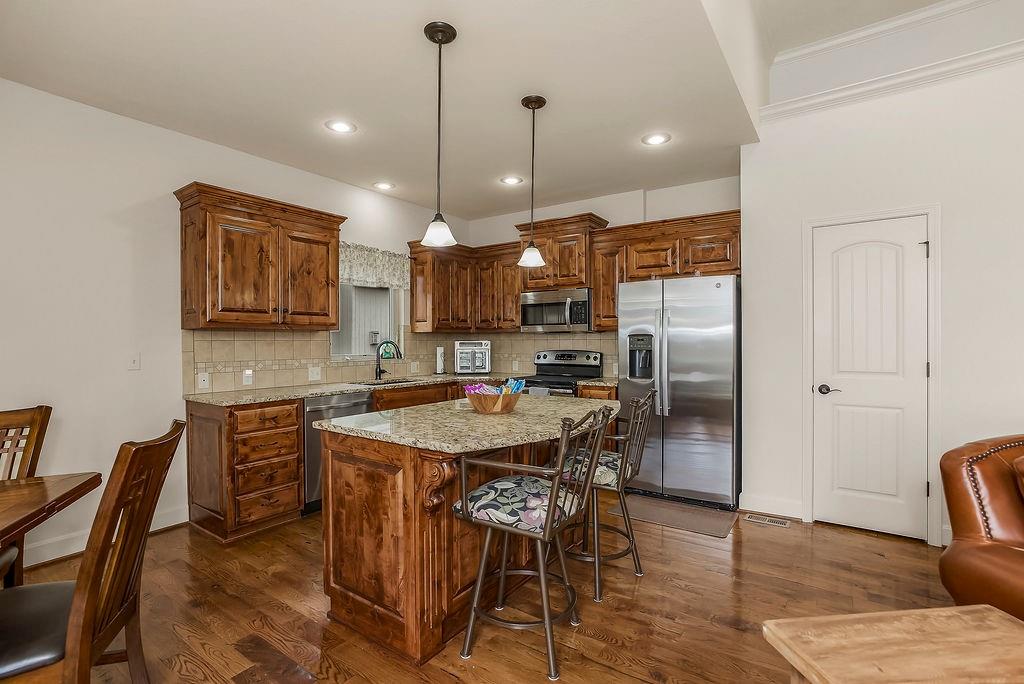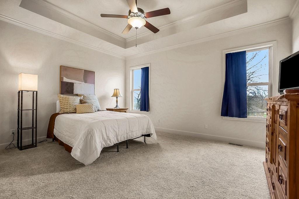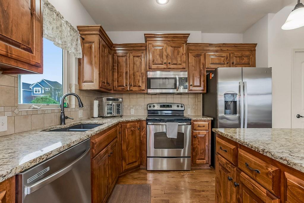 Stunning 4 bedroom, 3 bath reverse 1.5 story nestled on a cul-de-sac, offering a walk-out lower level to a fully fenced backyard. This meticulously maintained home features fresh paint inside and out, new carpet in bedrooms and stairs and newly landscaped grounds — truly move-in ready. The thoughtful layout places the primary suite and a second bedroom and full bath on the main floor, while the lower level offers a second living area, two additional bedrooms, and a third full bath — just the right amount of space for everyone. The open floor plan is packed with modern features and designed for comfortable living and entertaining. At the heart of the home, the kitchen, dining area, and great room flow seamlessly together, anchored by a cozy gas fireplace. The kitchen showcases custom cabinetry, granite countertops, a large island, and a pantry for ample storage. A wall of windows floods the great room with natural light and frames beautiful views of the backyard. Step into the sunroom, an additional 110 sq feet, is just off the dining area — the perfect spot for your morning coffee or evening wind-down, with more serene backyard views. The lower level recreational room walks out to a patio and the fenced backyard, and the property extends beyond the fenced area for added space. Conveniently located near highways, retail, dining, and entertainment — this home truly has it all!
