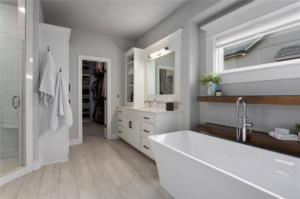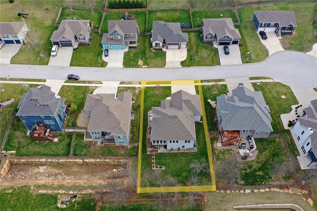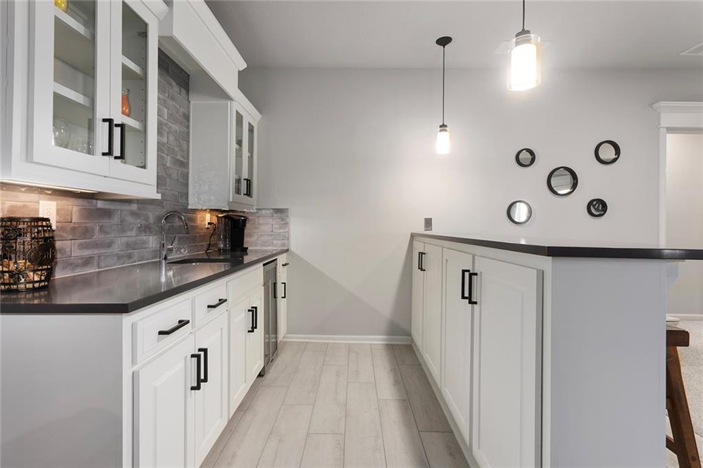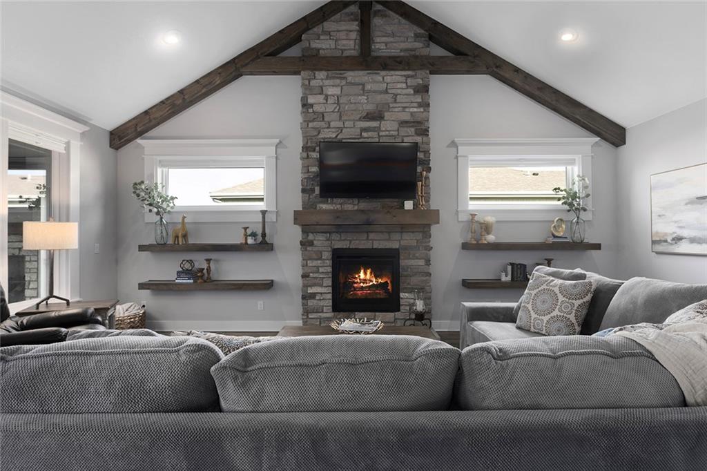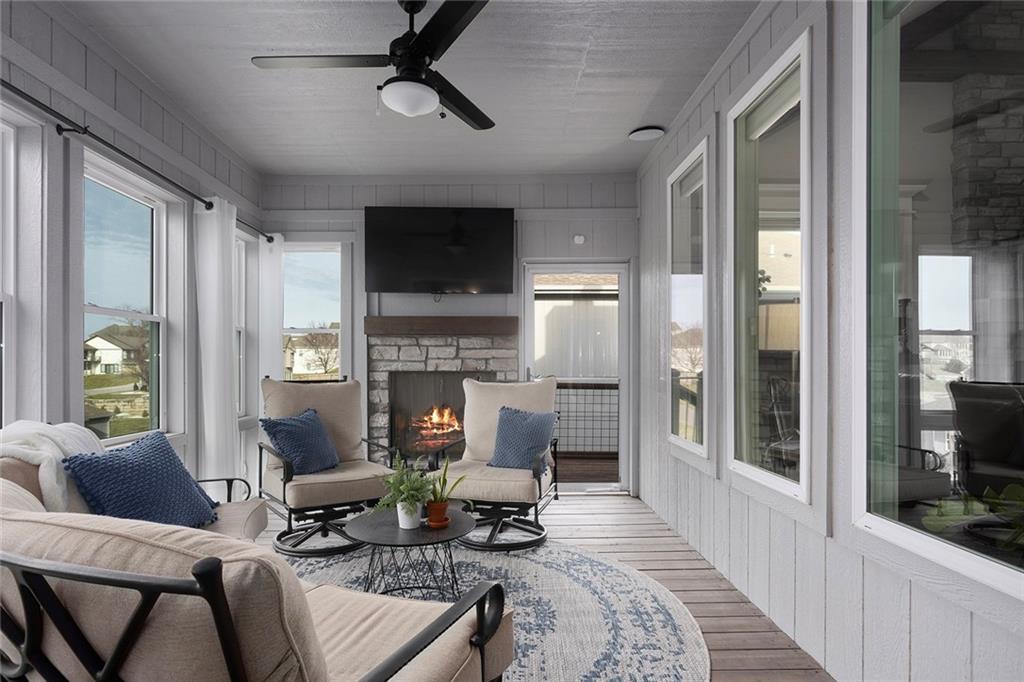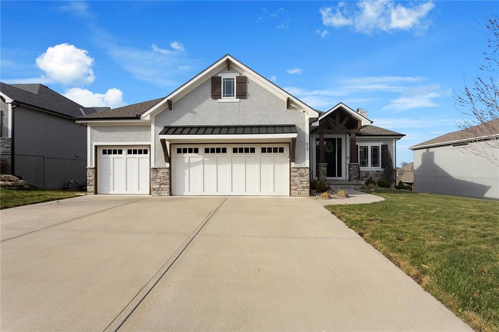 Upgrades throughout this reverse ranch deliver everything expected in a new home and much more. Custom window coverings, established landscaping, and a 3-season sunroom with an outdoor fireplace complete the finishes not typically included with a new home. The main floor half bath is great for guests. A large contrasting island anchors the open kitchen with custom-painted cabinetry and quartz countertops. The touch faucet and pot filler above the gas cooktop offer exceptional convenience and a walk-in pantry puts everything within arms reach. Bags and coats are easily accessed in the drop zone and the adjacent walk-through laundry room. The extended third garage bay offers space for lawn equipment or a work area and includes an electric car charging port. Have breakfast at the island seating or enjoy meals in the adjoining dining room. Take in gorgeous Missouri evenings in the 3-season sun room while you cozy up by the outdoor fireplace. The main-level primary suite has an en-stuite bath with a walk-in shower, soaking tub, and dual comfort-height vanities. Heated floors and a heated towel rack create a spa experience at home. A large walk-in closet conveniently connects to the walk-through laundry room so putting away laundry is a breeze. The lower level is designed for entertaining, complete with a wet bar, beverage fridge, half bath, and a walk-out to a covered patio. Two additional bedrooms share a Jack-and-Jill bath. Integrated ceiling speakers connect to the Sonos amp and security technology features allow home monitoring and often opens up reduced cost insurance benefits. Situated on a premium lot on a cul-de-sac street, you'll love the thoughtful design and beautiful features throughout this home. Get in just in time to enjoy the community pool and park this summer.