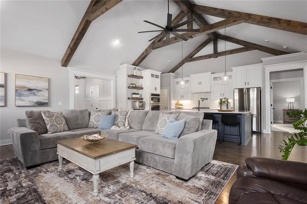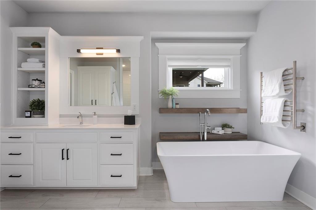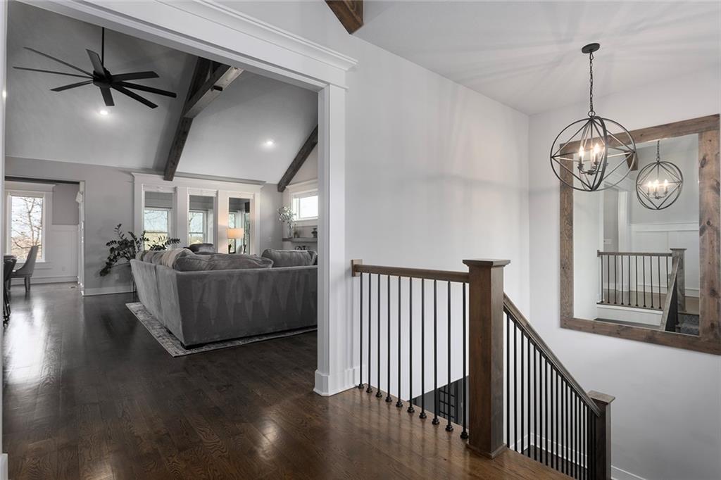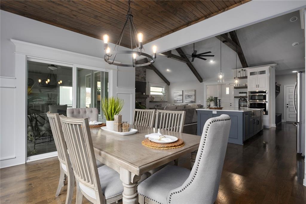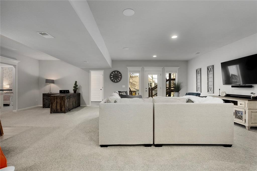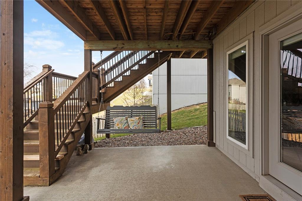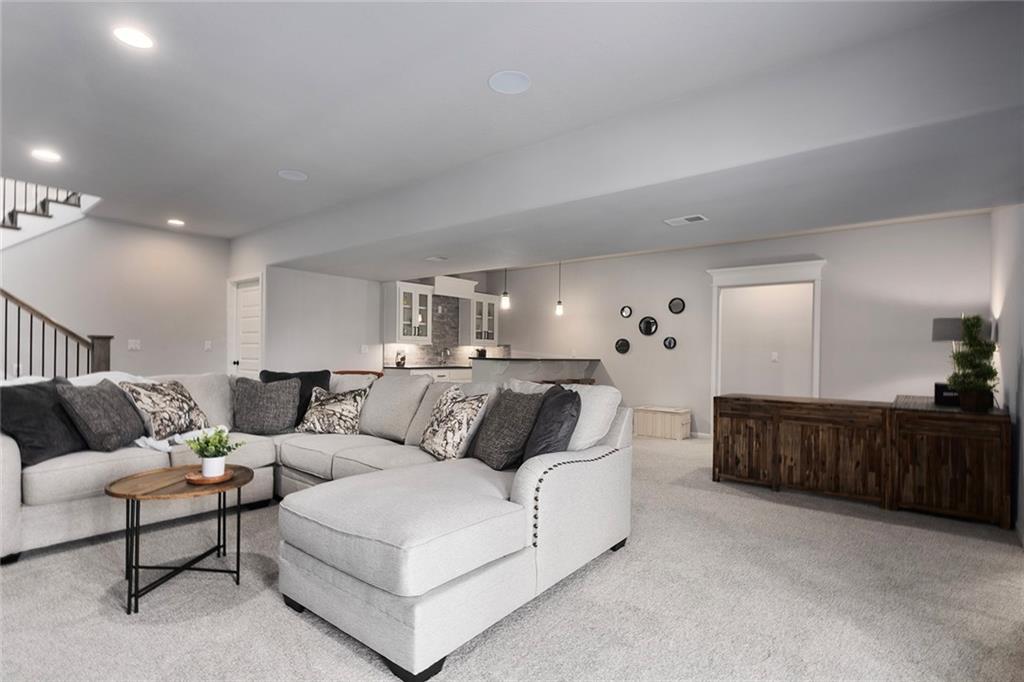 Upgrades throughout this reverse ranch deliver everything expected in a new home and much more. Custom window coverings, established landscaping, and a 3-season sunroom with an outdoor fireplace complete the finishes not typically included with a new home. The main floor half bath is great for guests. A large contrasting island anchors the open kitchen with custom-painted cabinetry and quartz countertops. The touch faucet and pot filler above the gas cooktop offer exceptional convenience and a walk-in pantry puts everything within arms reach. Bags and coats are easily accessed in the drop zone and the adjacent walk-through laundry room. The extended third garage bay offers space for lawn equipment or a work area and includes an electric car charging port. Have breakfast at the island seating or enjoy meals in the adjoining dining room. Take in gorgeous Missouri evenings in the 3-season sun room while you cozy up by the outdoor fireplace. The main-level primary suite has an en-stuite bath with a walk-in shower, soaking tub, and dual comfort-height vanities. Heated floors and a heated towel rack create a spa experience at home. A large walk-in closet conveniently connects to the walk-through laundry room so putting away laundry is a breeze. The lower level is designed for entertaining, complete with a wet bar, beverage fridge, half bath, and a walk-out to a covered patio. Two additional bedrooms share a Jack-and-Jill bath. Integrated ceiling speakers connect to the Sonos amp and security technology features allow home monitoring and often opens up reduced cost insurance benefits. Situated on a premium lot on a cul-de-sac street, you'll love the thoughtful design and beautiful features throughout this home. Get in just in time to enjoy the community pool and park this summer.