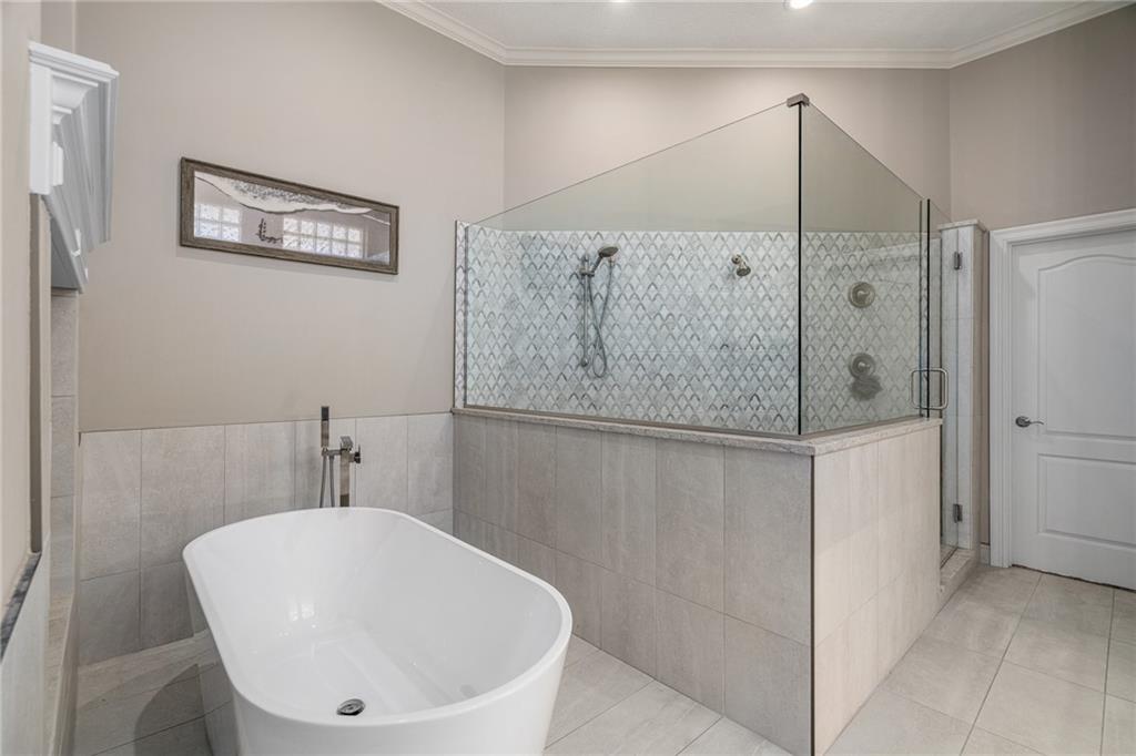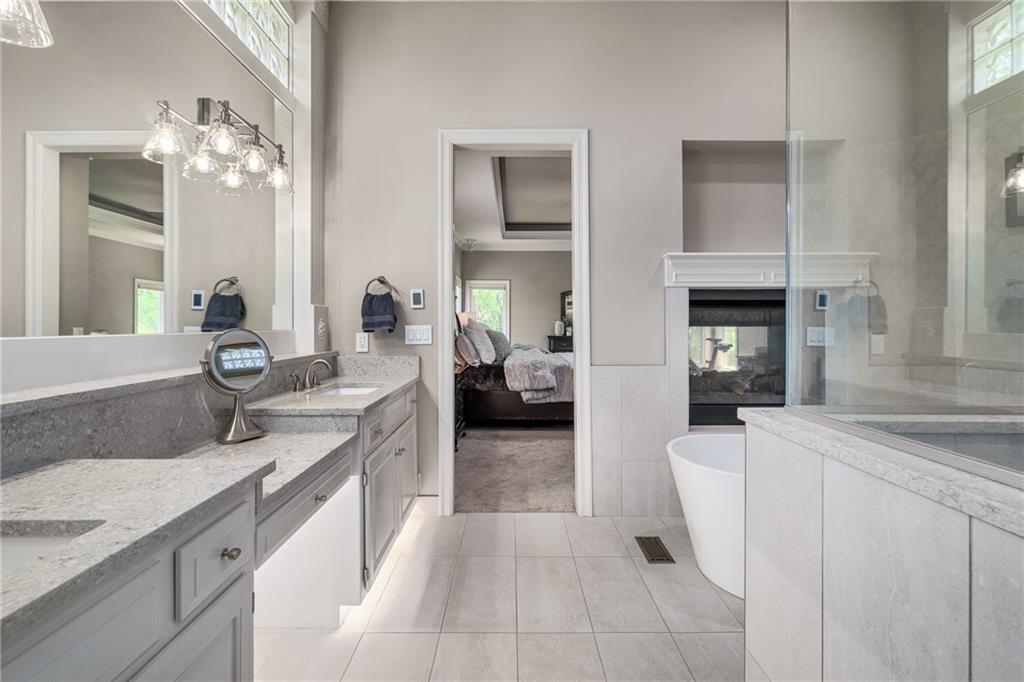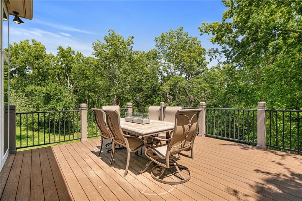 Welcome home to this stunning Don Julian reverse 1.5-story tucked on a wooded half-acre at the end of a quiet cul-de-sac in Woodland Reserve. Soaring ceilings and oversized windows frame peaceful, tree-filled views and fill every room with natural light. The main level offers formal dining, a living room with see-through fireplace, hearth room, home office, and a well-appointed kitchen with custom cabinetry, quartz counters, stainless appliances, double ovens, and walk-in pantry. A four-season sunroom opens to the deck. The primary suite features a tray ceiling, built-ins, and a two-way fireplace into a luxurious en suite bath with heated tile floors, dual vanities, soaking tub, oversized shower, and walk-in closet. A second main floor bedroom with private bath, powder room, and laundry round out the main level. The finished walkout basement includes three additional bedrooms, two with private baths, a family room with fireplace and wet bar, media room, second powder room, and second laundry. The climate-controlled 4-car garage is a dream for hobbyists and car enthusiasts alike. A built-in shed adds even more storage. Enjoy the pool, pond, walking trails, play area, and beautifully maintained common spaces this community has to offer. Tranquil setting just minutes to Oak Park Mall, Lenexa City Center, Shawnee Mission Park, K-7 and I-435.Buyer/Buyer's Agent to verify square footage.