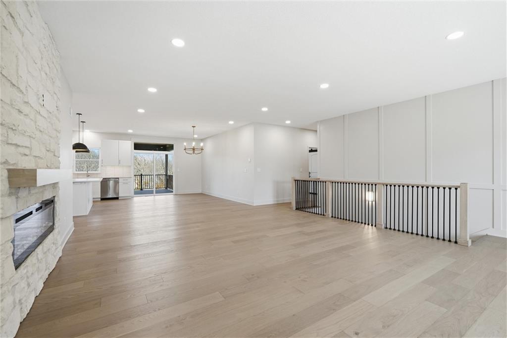 Stunning reverse 1.5 story NEW BUILD located in the desirable Fritchie Bluffs neighborhood featuring an open floor plan and thoughtful design. The main level offers two bedrooms including the spacious primary suite with spa like bathroom featuring soaking tub and an oversized walk-in closet accessible to the laundry room. Second main level bedroom could also serve as the perfect office with tons of natural light. Convenient mud room located off the three-car garage for an ideal drop zone for bags and shoes. The living room with stone fireplace opens up to the dining area and kitchen showcasing an 8-foot island, large walk-in working pantry with floating shelves, and a dedicated coffee bar. Three additional bedrooms and two full baths are located on the lower level all featuring HUGE walk-in closets, perfect for families or multigenerational living. The bright and inviting lower level features a wall of massive windows and is an entertainers dream with endless opportunities to make additional spaces into a theatre room, gym, or game room. Lower level also offers a dry bar area making entertaining a breeze! Walk out to your HUGE covered deck off each level thoughtfully constructed with maintenance free composite decking which overlooks a private, tree-lined backyard with stunning panoramic treetop views, perfect for relaxing in your quiet personal retreat. Additional highlights include a flat driveway, south-facing orientation, and a prime location close to award winning Lee's Summit schools, shopping, parks/trails, and Legacy Park Fields and Community Center! This is truly a rare opportunity to own a new construction home at an exceptional value for the area!