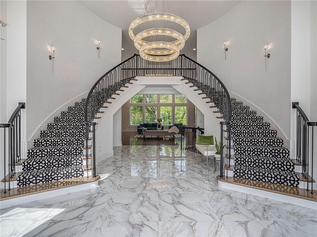 STUNNING. ELEGANT. EXTRAORDINARY. This nearly new Timber Rock Community showpiece is a true custom luxury build! A grand dual staircase and 3-tier custom crystal chandelier set the tone the moment you walk in, leading into a modern, light-filled living area with an 8-by-18-foot porcelain marble feature wall and a breathtaking 2-tier crystal chandelier. The chef-inspired kitchen is an entertainer’s dream, with a 5x10 leathered granite island, JennAir Pro appliances, a separate prep kitchen, and a huge pantry flowing seamlessly to an oversized crystal-lit dining area and covered lanai with a stone fireplace—perfect for unforgettable dinner parties, game days, and holidays. Your main-floor primary retreat feels like a five-star spa, offering an indulgent bath with oversized dual shower, soaking tub, and an expansive custom closet. Exquisite tilework, custom dual vanities, 5-foot circular mirrors, and crystal chandeliers create a jaw-dropping sanctuary, completed by a large 3-tier closet with two built-in chests. Upstairs, three spacious bedrooms with designer accent wallpaper—each with its own ensuite bath—ensure every guest or family member enjoys a private, boutique-hotel experience. The newly finished lower level is an entertainer’s paradise, with a wide-open living area, dedicated dining space, and a wet bar, all illuminated by a wall of windows overlooking green space; two extra-large bedrooms (ideal for an exercise room or private office) share a beautifully tiled full bath, and a generous wine room becomes the centerpiece for tastings and celebrations. Sliding doors lead to a large patio and lush green space expanding your living area outdoors, ideal for morning coffee and casual evenings. An oversized angled 4-car garage, large mudroom, and extra-spacious laundry loaded with custom cabinets and counters provide the everyday functionality that makes luxury living effortless. Buyer’s agent to verify square footage, schools, and taxes.