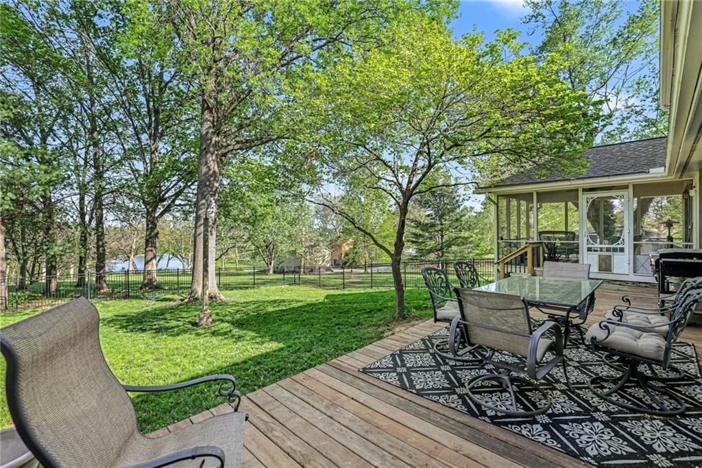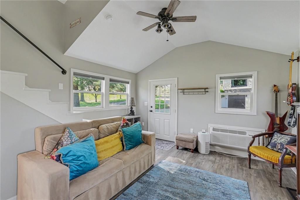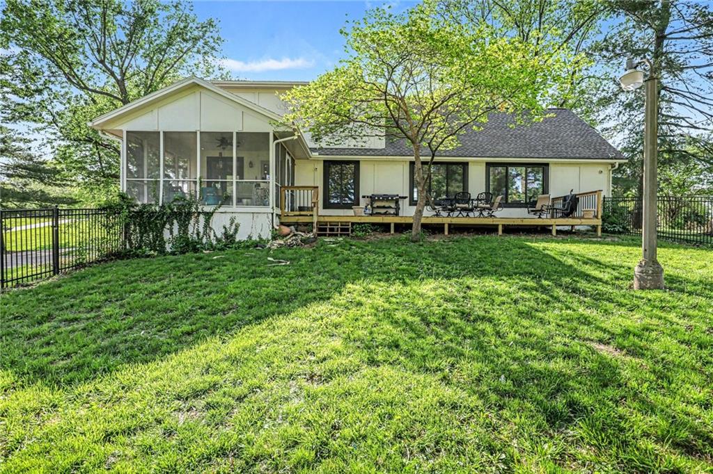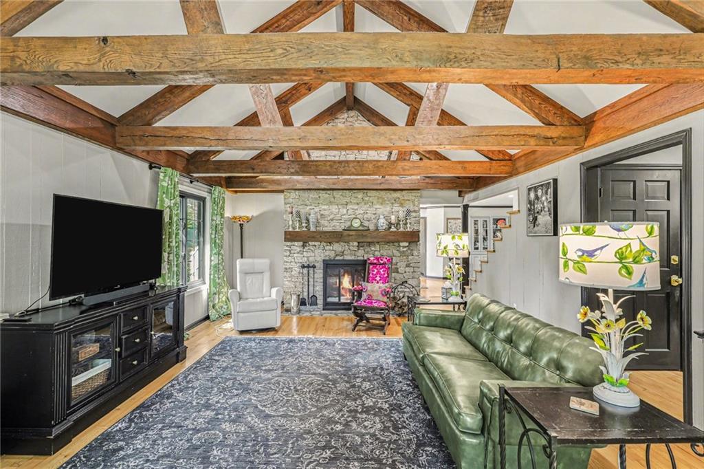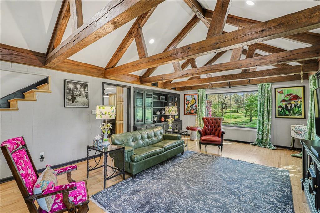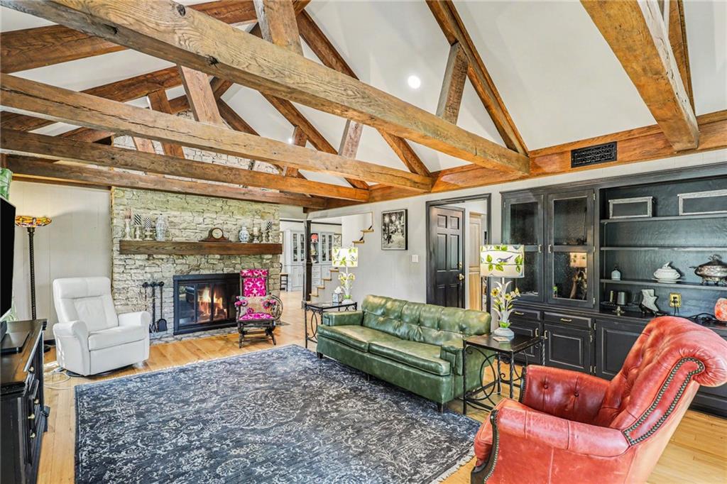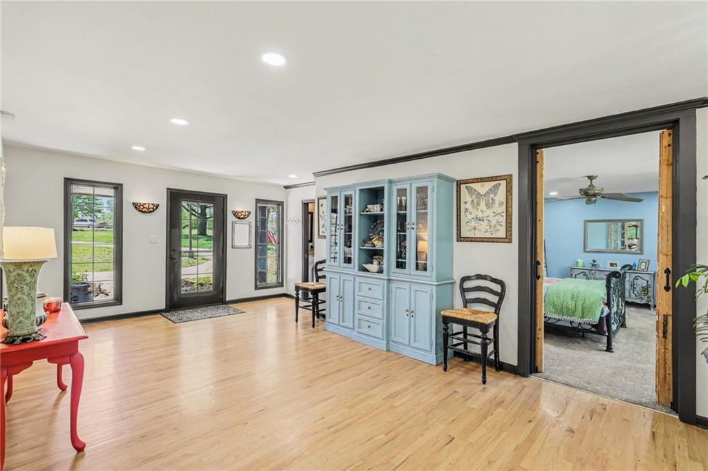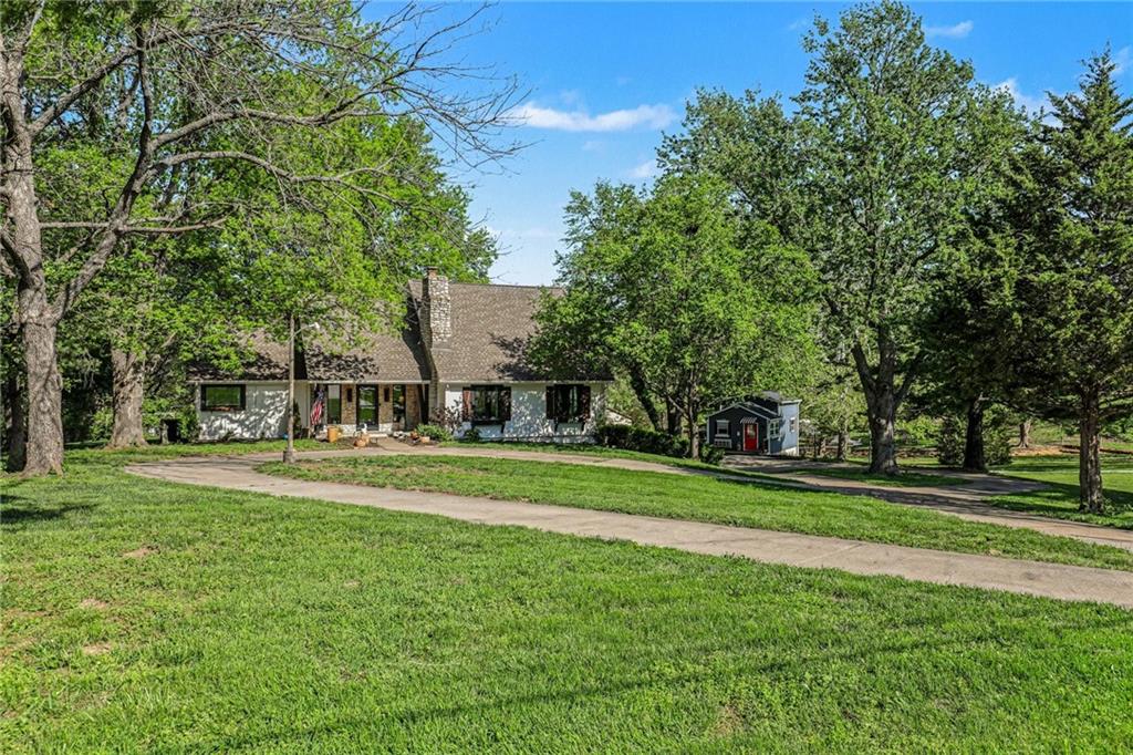 A rare opportunity to enjoy tranquil acreage living within city limits, this beautifully maintained 1.5-story home sits on nearly 5 acres with a shared pond, offering peaceful water views and endless outdoor enjoyment. Featuring 3 bedrooms, 3 bathrooms, and a 4-car tandem garage, this property blends space, functionality, and lifestyle in one unique setting. Step inside to a warm and inviting main level highlighted by vaulted ceilings with exposed wood beams, rich hardwood floors, and a stunning stone fireplace with a gas starter in the living room. The kitchen is designed for both everyday living, featuring custom hickory cabinetry, an oversized island, and abundant storage with convenient pull out shelves. Just off the kitchen, the screened-in porch or the NEW deck both provide the perfect place to relax while overlooking the pond and expansive backyard. The main-level primary suite is a true retreat, positioned to capture beautiful sunrise views over the water with NEW windows. The updated en-suite bathroom features a double vanity with quartz countertops, a fully tiled walk-in shower, and an oversized clawfoot tub and laundry. Upstairs, you’ll find two spacious bedrooms, a full hall bath with updated tile and custom inserts for shower convenience, and an additional flex room ideal for a home office or extra storage.The lower level offers additional storage, full bath, pet spa, mudroom, second laundry, access to the garage and workshop areas. Outdoor living is just as impressive, with open acreage, fruit trees, garden beds, and multiple storage sheds. The shared pond adds to the charm, perfect for fishing. Enjoy the partial NEW fence in the yard perfect for pets. Adding exceptional value, the accessory dwelling unit offers a fully functional space ideal for guests, extended family, or rental income potential. With its combination of scenic views, flexible living spaces, and income opportunity, this property offers comfort, privacy, and convenience all in one.