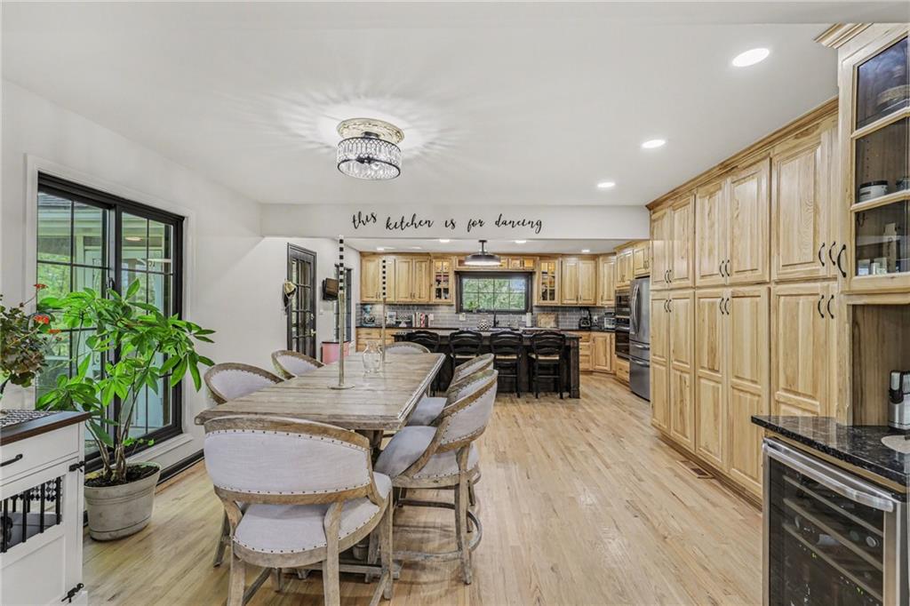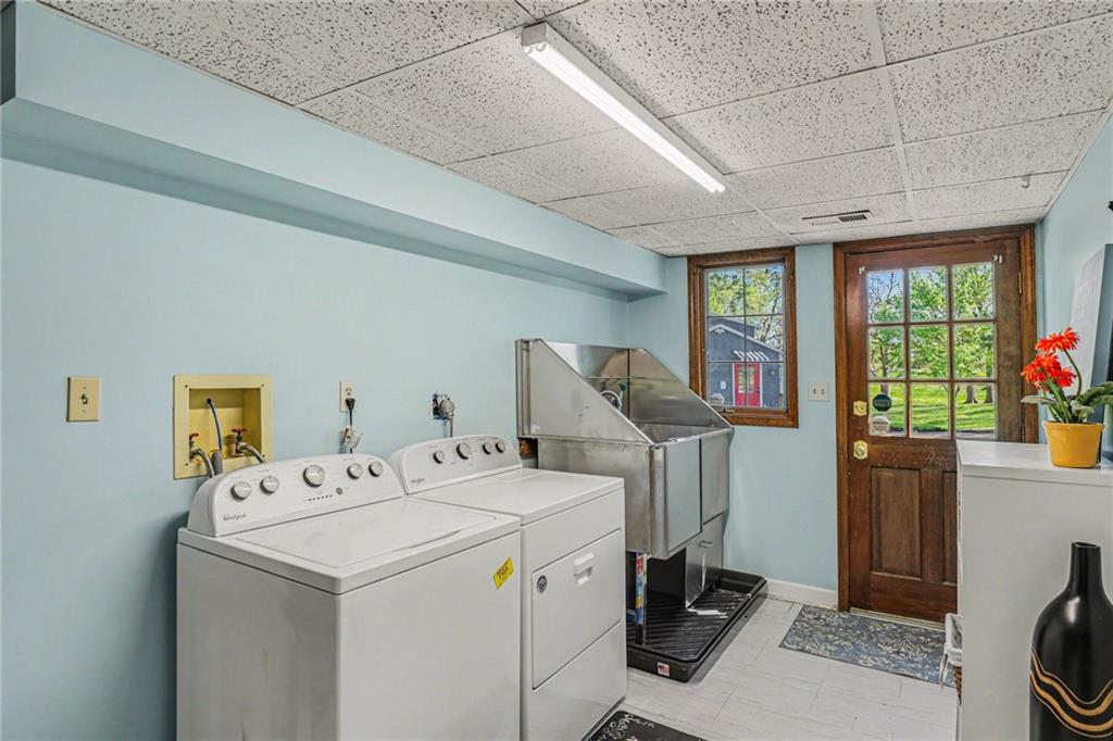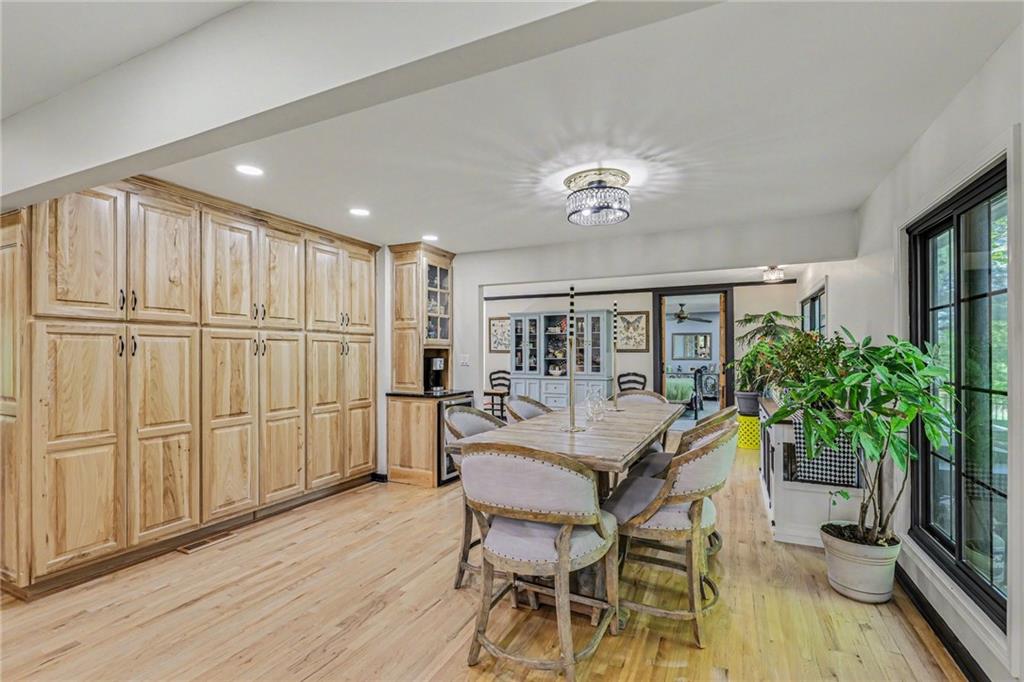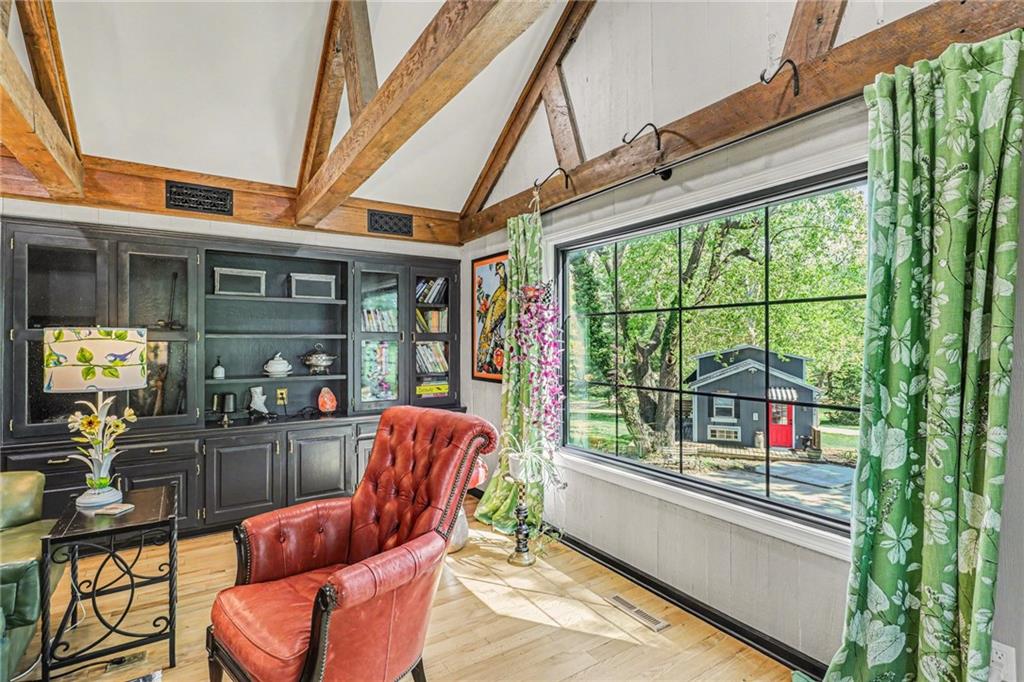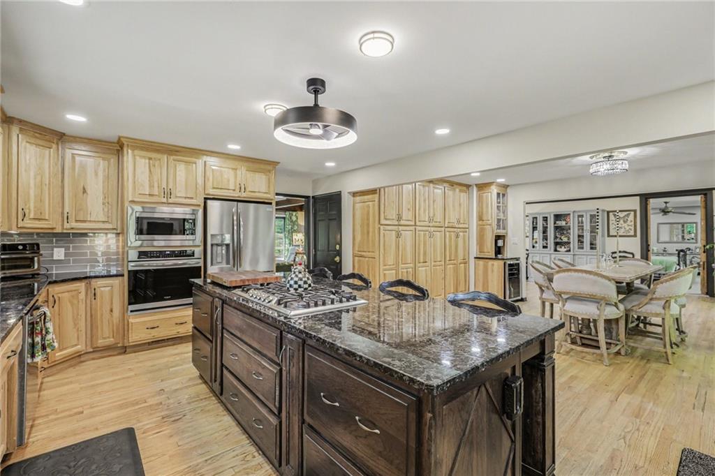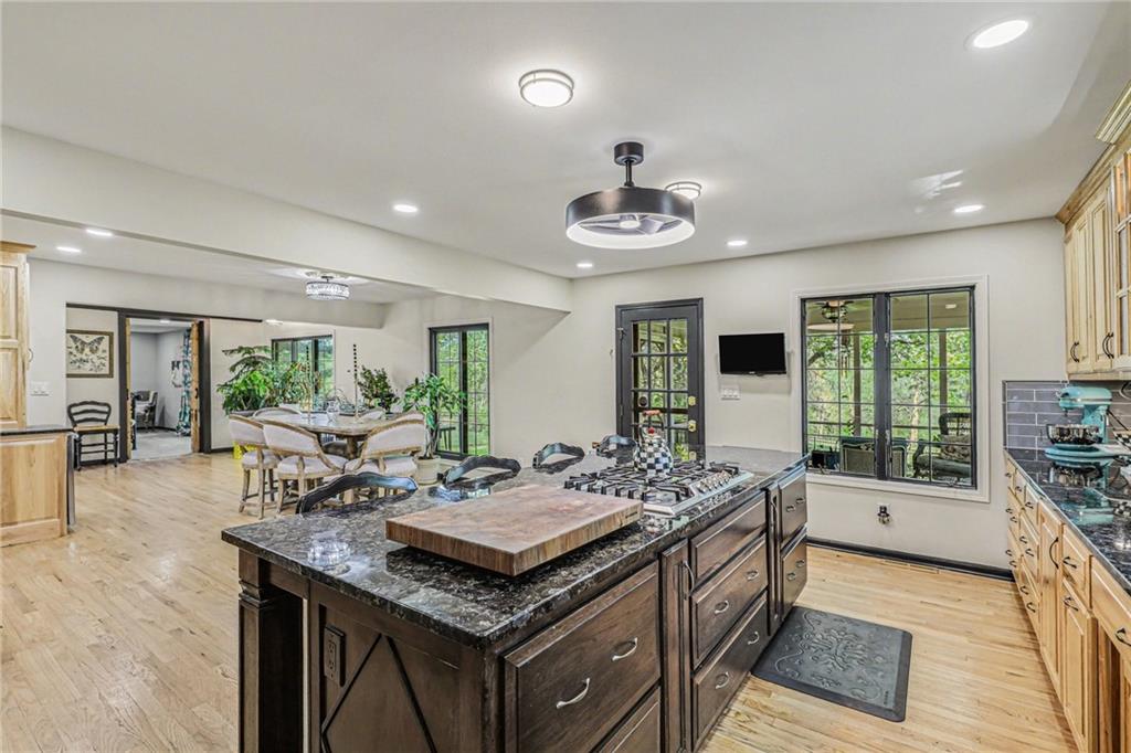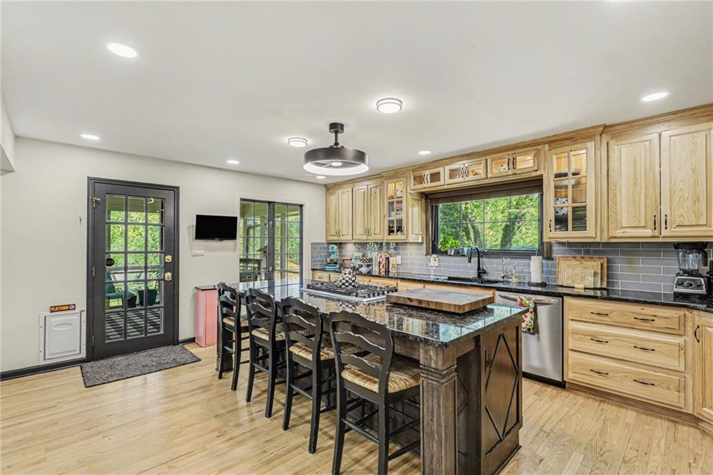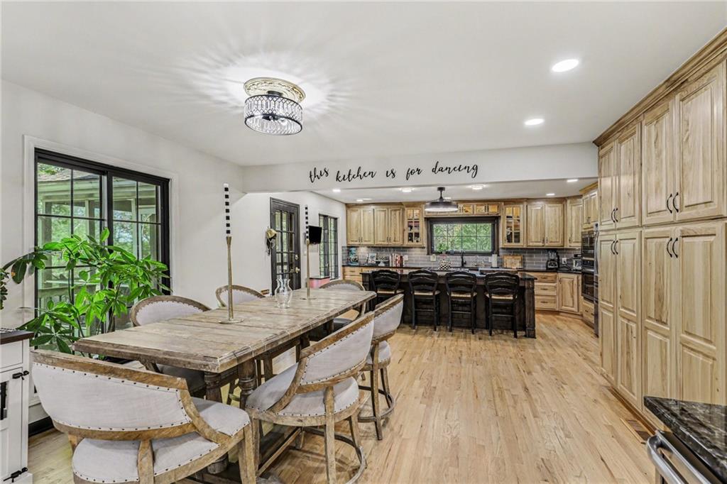A rare opportunity to enjoy tranquil acreage living within city limits, this beautifully maintained 1.5-story home sits on nearly 5 acres with a shared pond, offering peaceful water views and endless outdoor enjoyment. Featuring 3 bedrooms, 3 bathrooms, and a 4-car tandem garage, this property blends space, functionality, and lifestyle in one unique setting. Step inside to a warm and inviting main level highlighted by vaulted ceilings with exposed wood beams, rich hardwood floors, and a stunning stone fireplace with a gas starter in the living room. The kitchen is designed for both everyday living, featuring custom hickory cabinetry, an oversized island, and abundant storage with convenient pull out shelves. Just off the kitchen, the screened-in porch or the NEW deck both provide the perfect place to relax while overlooking the pond and expansive backyard. The main-level primary suite is a true retreat, positioned to capture beautiful sunrise views over the water with NEW windows. The updated en-suite bathroom features a double vanity with quartz countertops, a fully tiled walk-in shower, and an oversized clawfoot tub and laundry. Upstairs, you’ll find two spacious bedrooms, a full hall bath with updated tile and custom inserts for shower convenience, and an additional flex room ideal for a home office or extra storage.The lower level offers additional storage, full bath, pet spa, mudroom, second laundry, access to the garage and workshop areas. Outdoor living is just as impressive, with open acreage, fruit trees, garden beds, and multiple storage sheds. The shared pond adds to the charm, perfect for fishing. Enjoy the partial NEW fence in the yard perfect for pets. Adding exceptional value, the accessory dwelling unit offers a fully functional space ideal for guests, extended family, or rental income potential. With its combination of scenic views, flexible living spaces, and income opportunity, this property offers comfort, privacy, and convenience all in one.