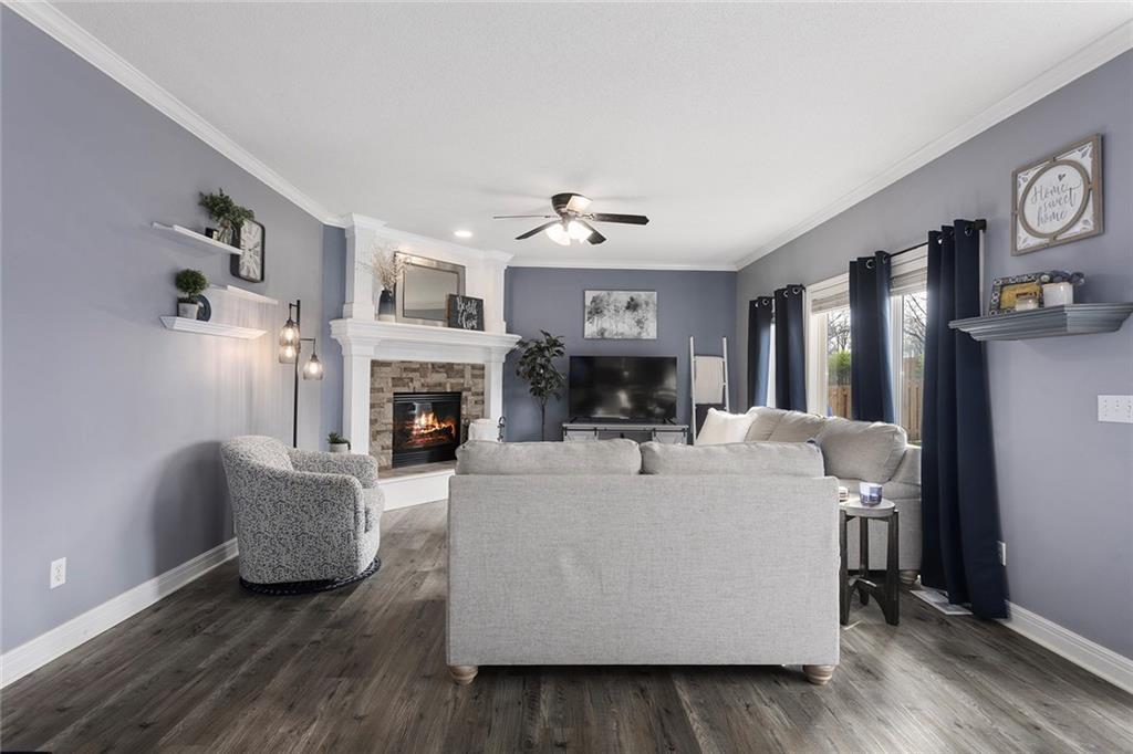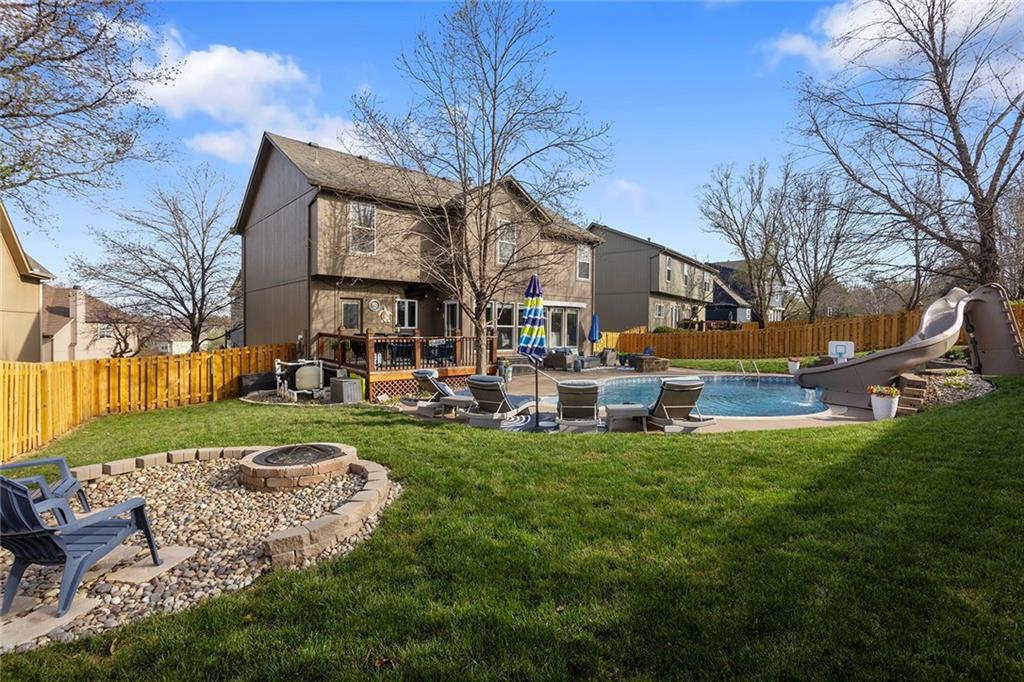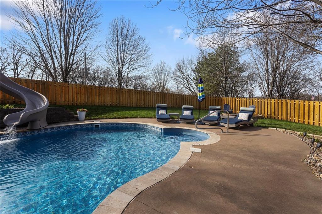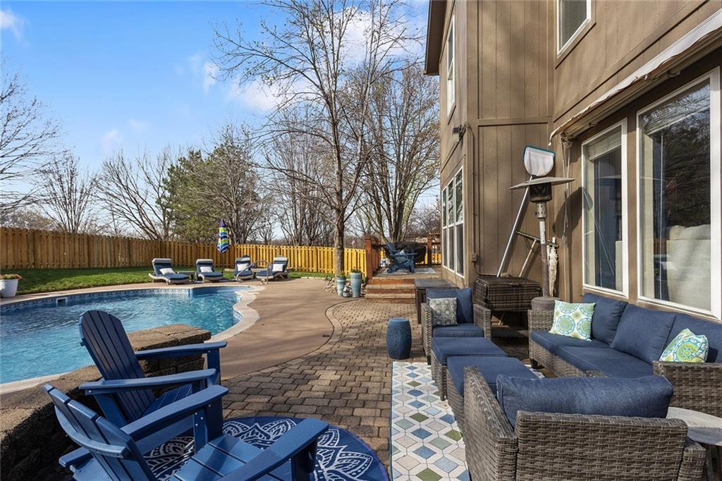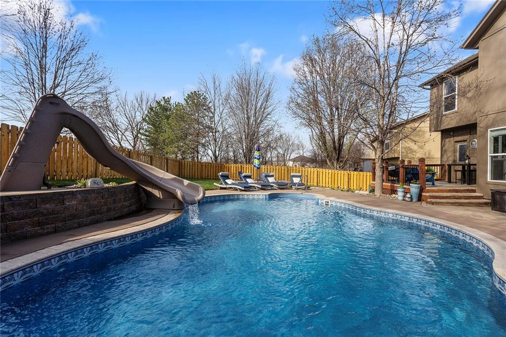 Welcome to this exceptional Shawnee residence with heated saltwater pool. The home is ideally situated on a cul-de-sac. Inside, the home showcases soaring ceilings, quality craftsmanship, and a thoughtfully designed floor plan suited for everyday living and hosting. Luxury vinyl plank flooring extends throughout the main level. A formal dining room and light-filled living room which features a striking masonry fireplace. The kitchen is well-appointed with a large island, granite countertops, and a pantry, offering both functionality and style. The half bath provides secondary access to the back deck and pool. The spacious primary suite serves as a private retreat, complete with a bath featuring a soaking tub, walk-in shower, dual vanities, and an expansive walk-in closet with access to additional out of sight storage areas. The second level also includes generously sized secondary bedrooms which include ample closet spaces; two with walk-in closets and one with dual closets. A full bath and conveniently located laundry room complete the upper level. The finished lower level is designed for versatility and entertainment, offering a large recreation area, additional space for a game table and another area for fitness equipment or future bar. A fifth non-conforming bedroom with a private full bath completes the lower level. The backyard is a private retreat, surrounded by a fully fenced yard. Outdoor living is enhanced by a wood deck, an expansive paver patio, and a dedicated firepit area; perfect for both relaxation and entertaining. Recent updates include newer fence, pool liner (1 year old), HVAC system and water heater (2 years old). Ideally located near three De Soto schools and scenic walking trails, this home combines comfort, style, and convenience in a highly desirable setting.