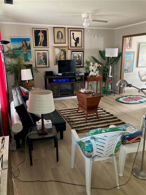 Living area with light wood finished floors, ornamental molding, and ceiling fan