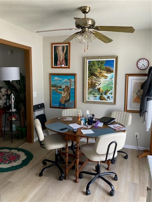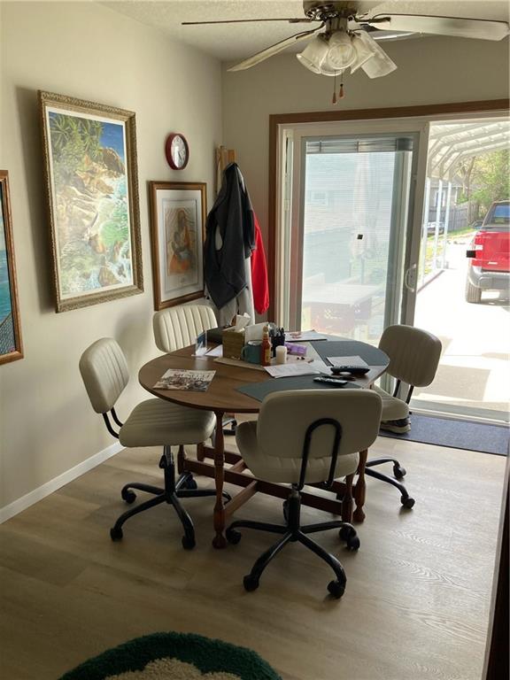 Dining room with wood finished floors and ceiling fan
