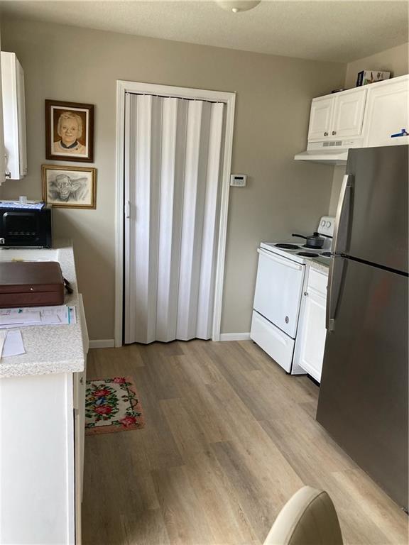 Kitchen featuring white cabinetry, freestanding refrigerator, white electric range oven, light wood-style flooring, and light countertops