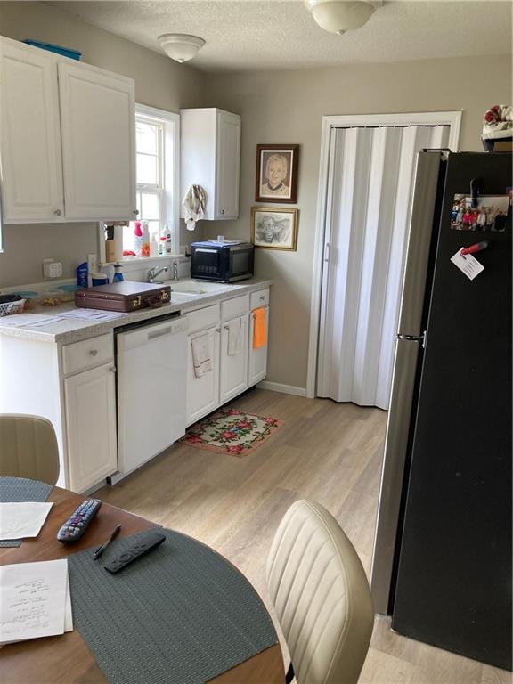 Kitchen featuring freestanding refrigerator, light countertops, white cabinetry, a textured ceiling, and white dishwasher