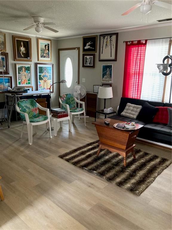 Living room featuring ceiling fan, a textured ceiling, light wood-style flooring, and crown molding