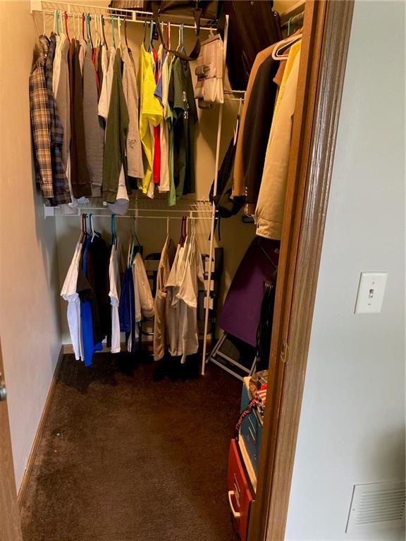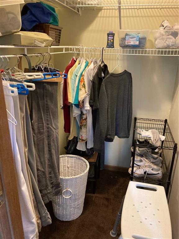 Walk in closet featuring dark colored carpet