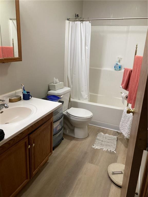 Full bathroom featuring vanity, light wood-type flooring, and shower / bath combination with curtain