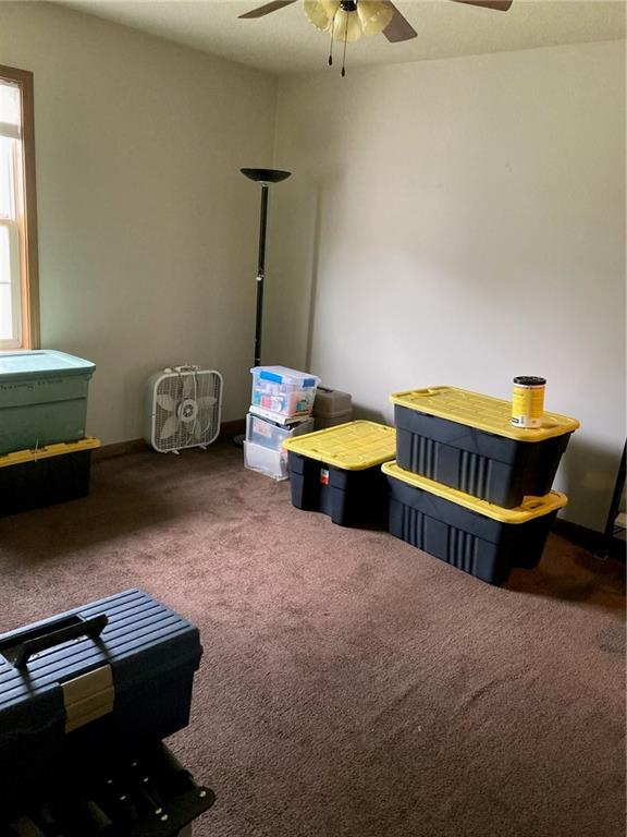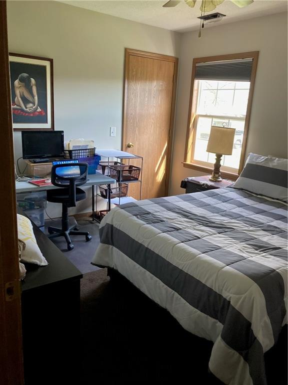 Bedroom featuring a closet, a desk, ceiling fan, and dark carpet