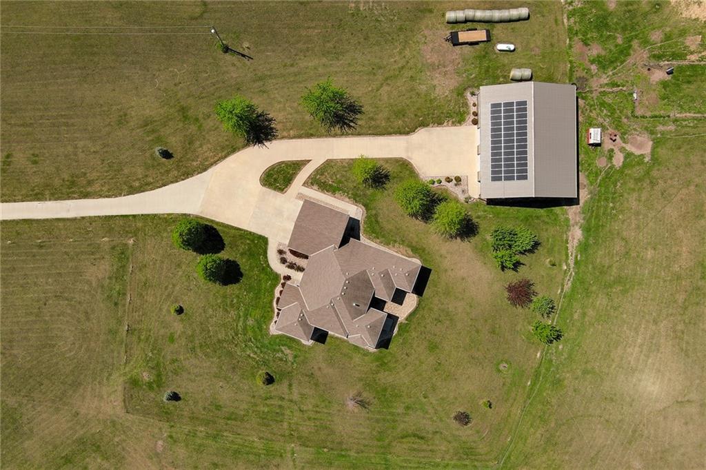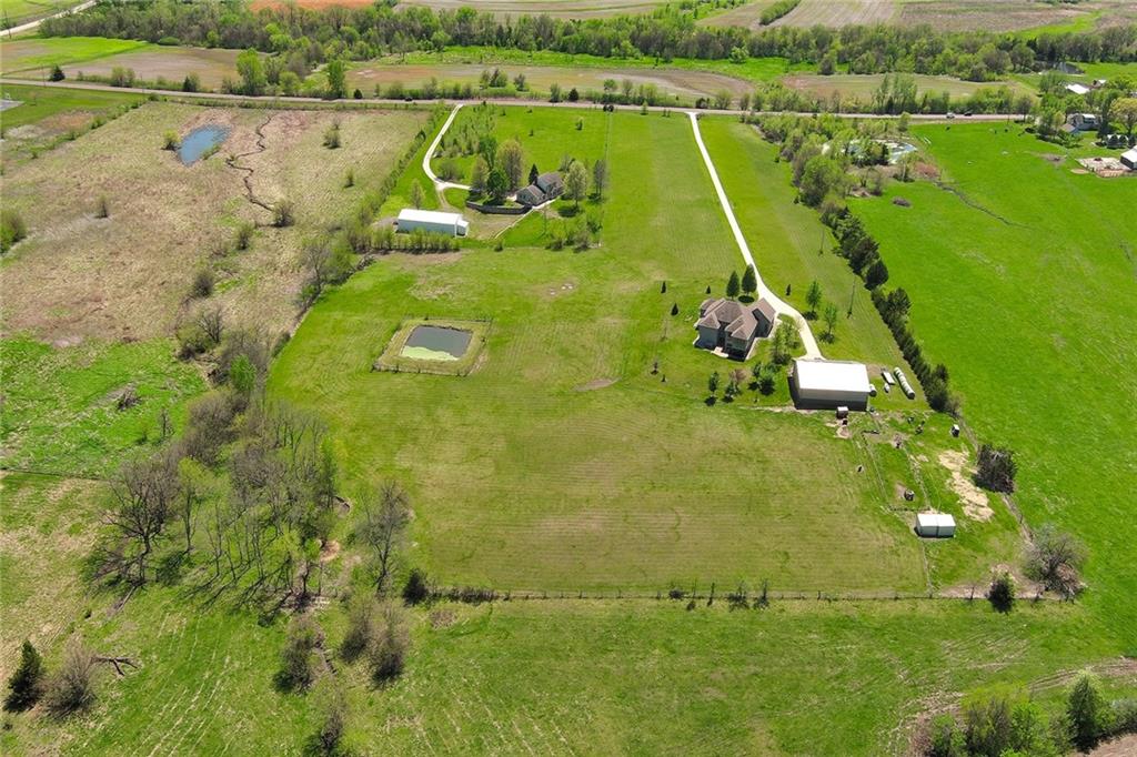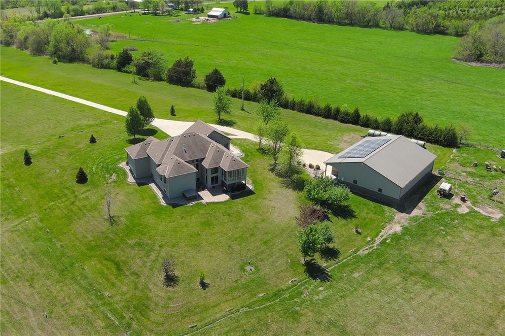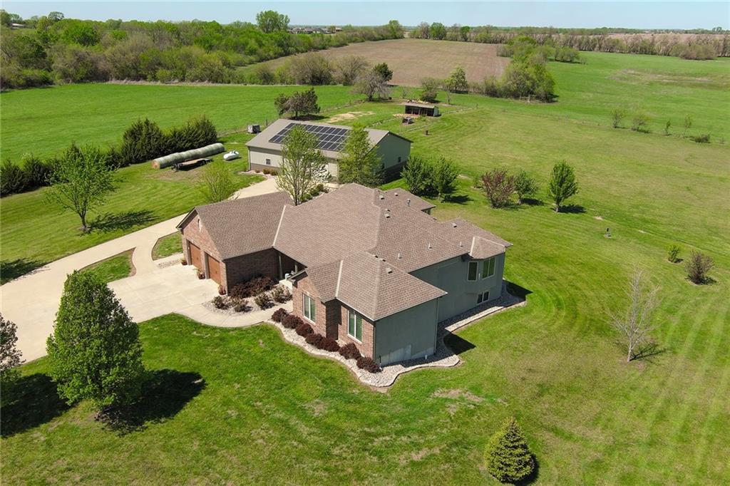 This stunning custom-built all-brick ranch sits majestically atop a hill, offering breathtaking views and the perfect blend of luxury and functionality. Designed for true main-level living, the home features three spacious bedrooms on the main floor. Two secondary bedrooms provide excellent flexibility for guests, family, or a home office—complete with abundant natural light and beautiful wood flooring. The expansive primary suite is a true retreat, easily accommodating large furniture and complemented by a spa-like ensuite featuring a walk-in shower, jetted soaking tub, double vanities, and an impressive walk-in closet. Enjoy both formal and casual living with a dedicated dining room and an open-concept kitchen equipped with a cooktop, granite countertops, stained wood cabinetry, and a large pantry. The kitchen flows seamlessly into the great room, where a striking stone fireplace and walls of windows showcase the property’s scenic surroundings. An enclosed four-season sunroom extends the living space, perfect for relaxing or entertaining year-round. Additional main-level conveniences include a drop zone off the garage, and a second laundry option in the pantry. The partially finished walk-out basement adds even more versatility with a fourth bedroom, full bathroom, family room, and a second laundry area. There is ample opportunity to expand, with space for two additional bedrooms and a fourth bathroom—featuring daylight windows for added comfort and value. Outside, the property truly shines with approximately 12 acres of agricultural land, plus an additional 2 acres surrounding the home. A massive 2,900 sq ft utility building includes solar power that saves tons on utility bills, ideal for a variety of uses. The property is fully fenced and secured with a grand electric entry gate. Enjoy the best of both worlds—peaceful country living with a prime location offering convenient access to everything the Kansas City area has to offer.