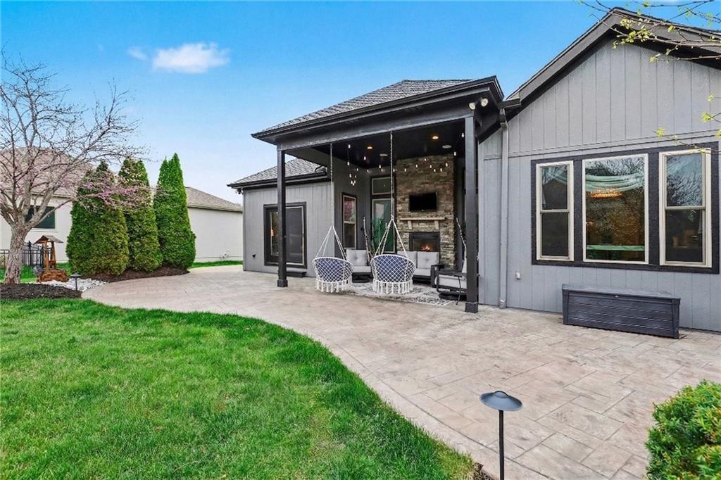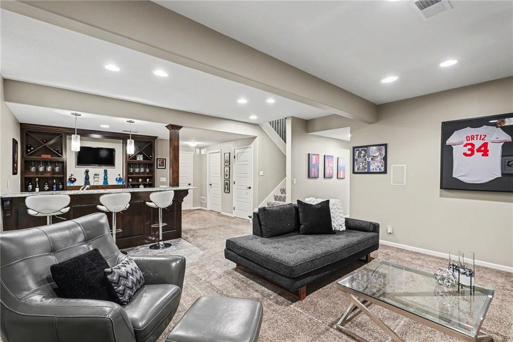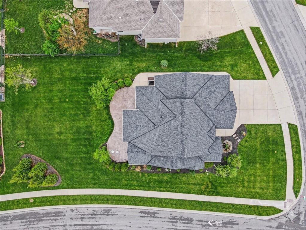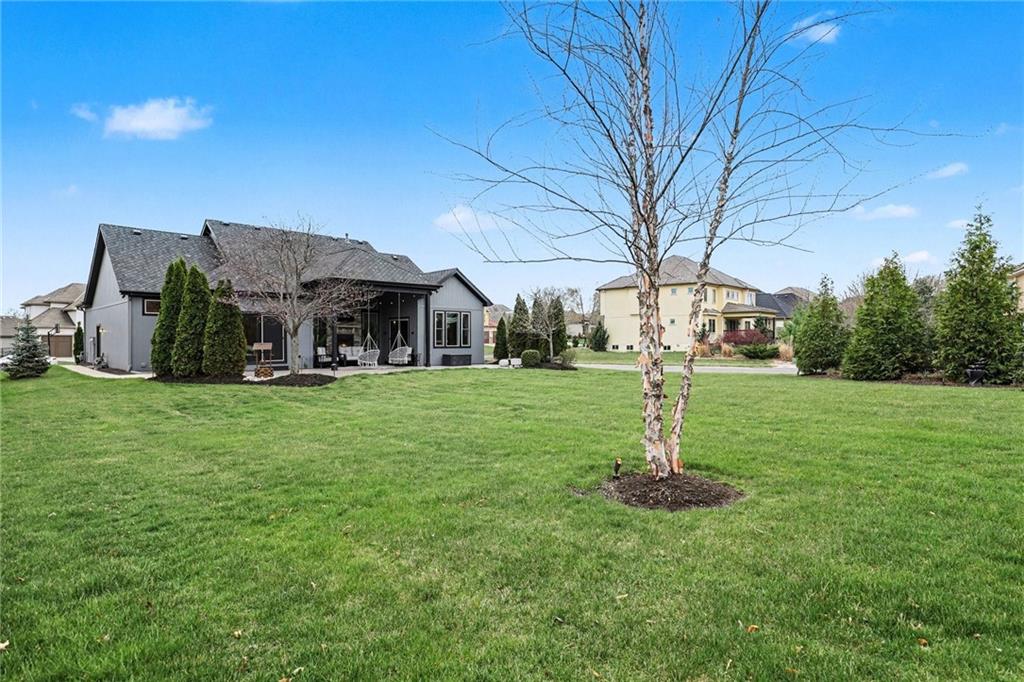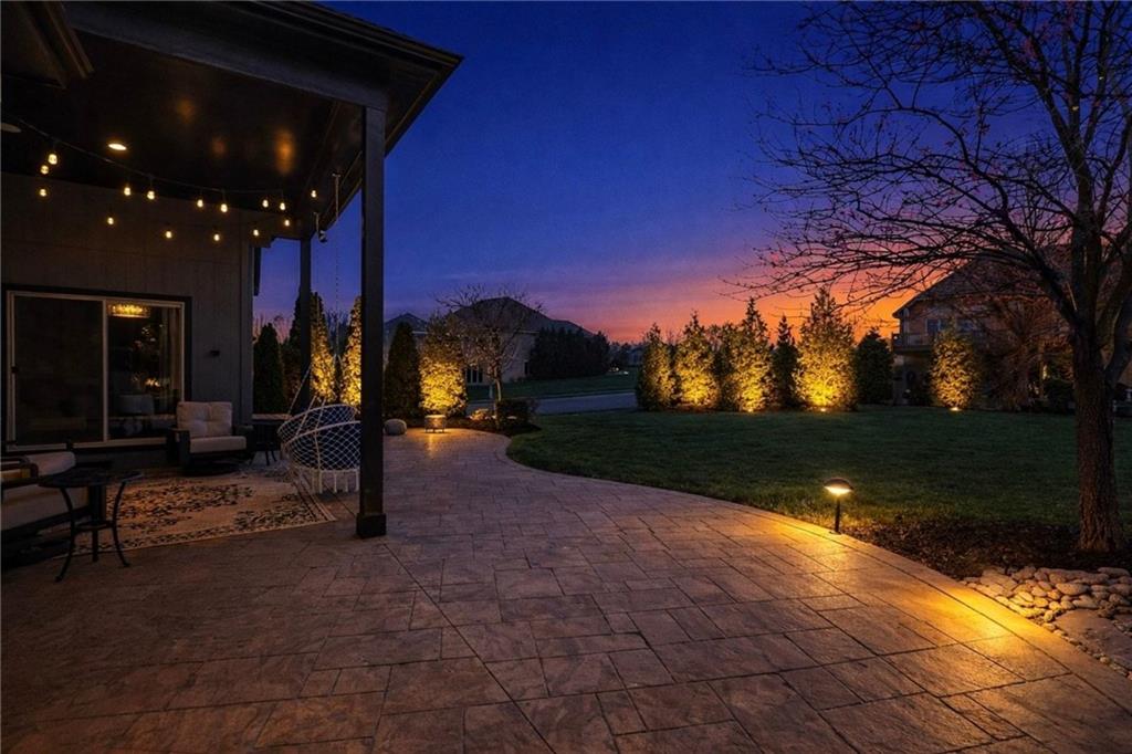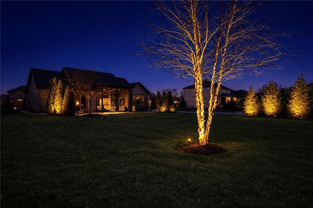 Custom built, upgraded and exceptionally well maintained by the original owner, this Reverse 1.5 Story is impressive. Every inch and finish was thoughtfully curated for the owners enjoyment, comfort and security. Fresh exterior paint, brand new roof, backlit address, up lit landscaping and a water feature provide the ultimate curb appeal. Drawn inside by the vaulted ceilings, stacked stone fireplace highlighted by a 110 piece blown glass fixture by Seth Parks and dimmed for entertaining in the open concept main level. Smart sound system throughout main, lower and exterior living spaces. Upgraded kitchen with thoughtfully planned pantry space, opens to a vaulted dining space. Beautiful landscaping and lighting pulls the outdoors in from every vantage point. Accessible from both the dining area and the primary suite, enjoy the backyard from the covered or uncovered stamped concrete patio space and yard large enough to easily add a pool! Finished lower level entertainment space offers recreation room with wet-bar, 2 additional bedrooms with ensuite bathrooms. Plus plenty of storage in 2 fully insulated unfinished spaces- including a storm shelter! Extra tall and deep finished garage will impress the large truck owners. Be sure to see the full list of upgrades because there are too many to list here!