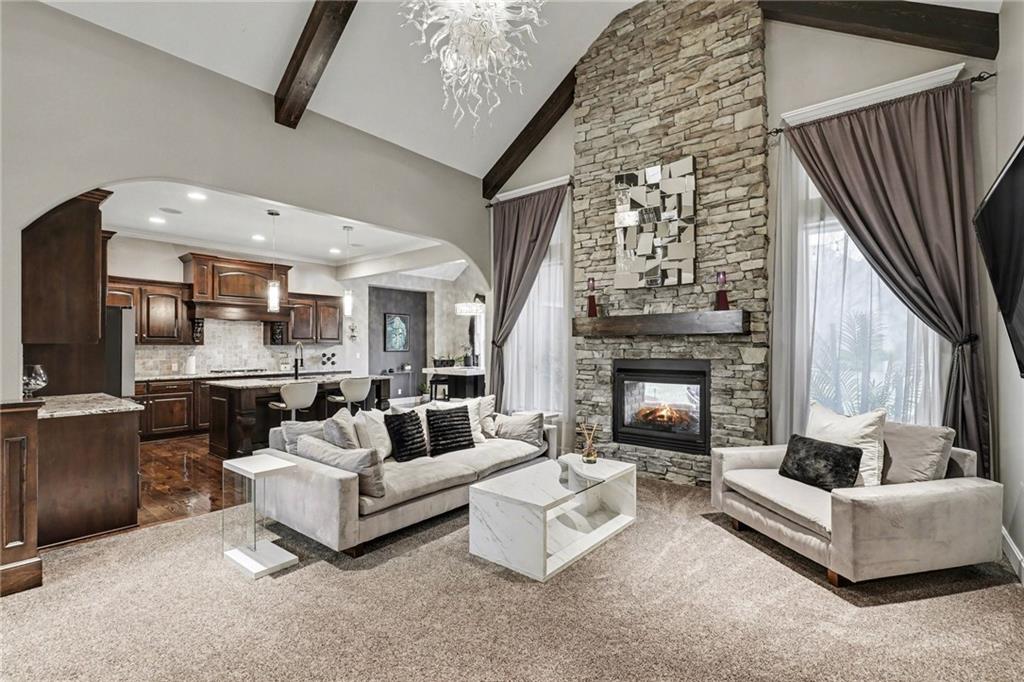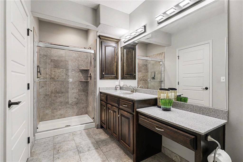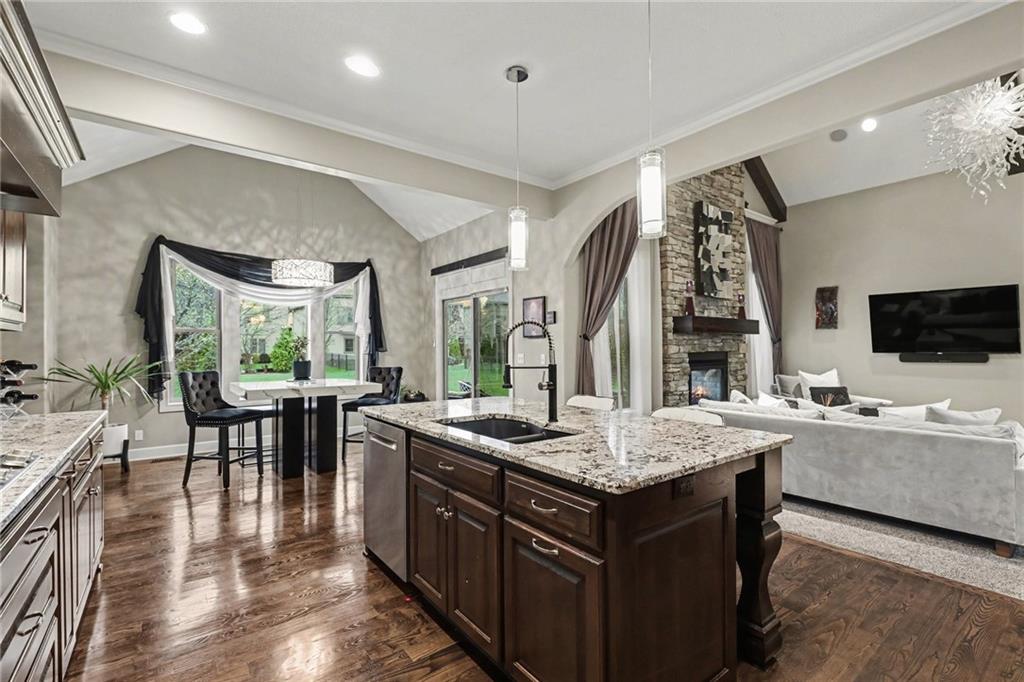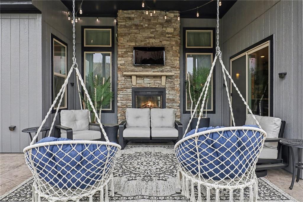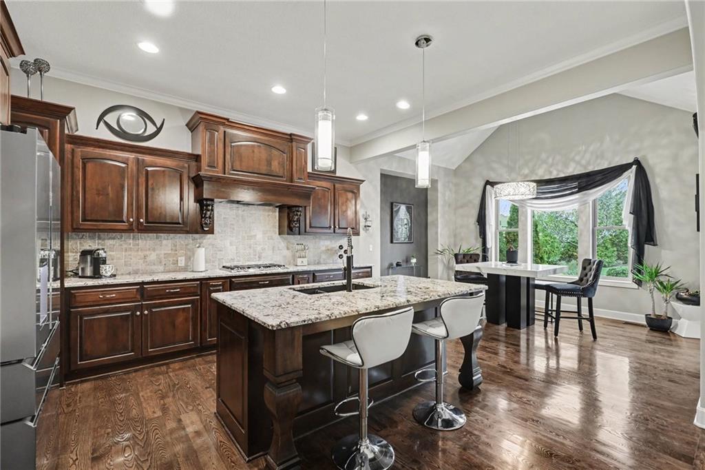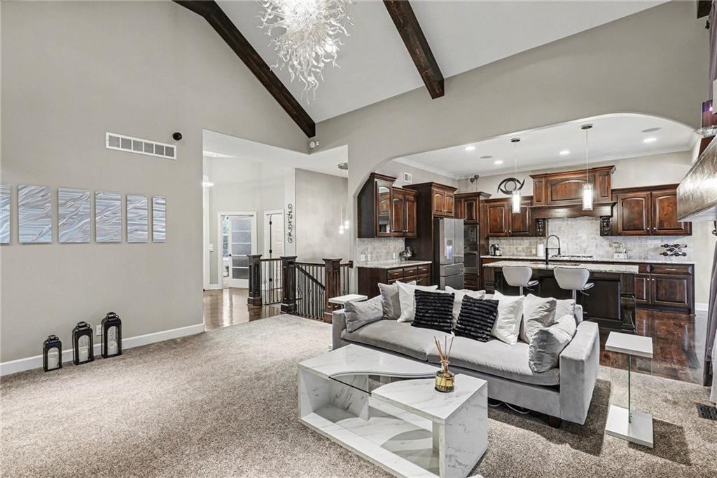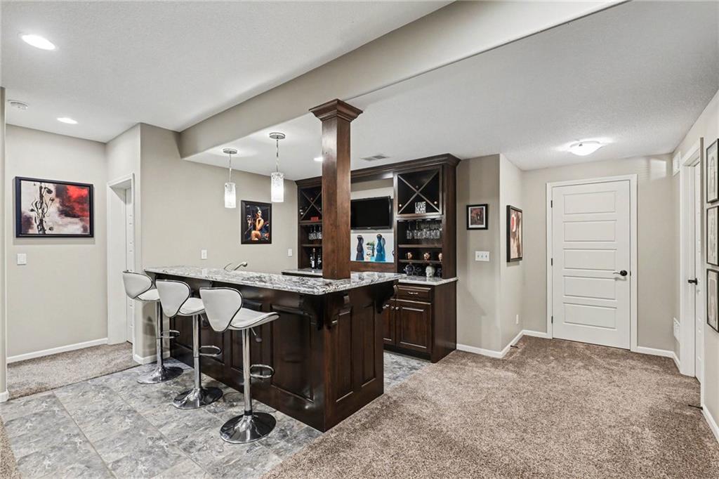 Custom built, upgraded and exceptionally well maintained by the original owner, this Reverse 1.5 Story is impressive. Every inch and finish was thoughtfully curated for the owners enjoyment, comfort and security. Fresh exterior paint, brand new roof, backlit address, up lit landscaping and a water feature provide the ultimate curb appeal. Drawn inside by the vaulted ceilings, stacked stone fireplace highlighted by a 110 piece blown glass fixture by Seth Parks and dimmed for entertaining in the open concept main level. Smart sound system throughout main, lower and exterior living spaces. Upgraded kitchen with thoughtfully planned pantry space, opens to a vaulted dining space. Beautiful landscaping and lighting pulls the outdoors in from every vantage point. Accessible from both the dining area and the primary suite, enjoy the backyard from the covered or uncovered stamped concrete patio space and yard large enough to easily add a pool! Finished lower level entertainment space offers recreation room with wet-bar, 2 additional bedrooms with ensuite bathrooms. Plus plenty of storage in 2 fully insulated unfinished spaces- including a storm shelter! Extra tall and deep finished garage will impress the large truck owners. Be sure to see the full list of upgrades because there are too many to list here!
