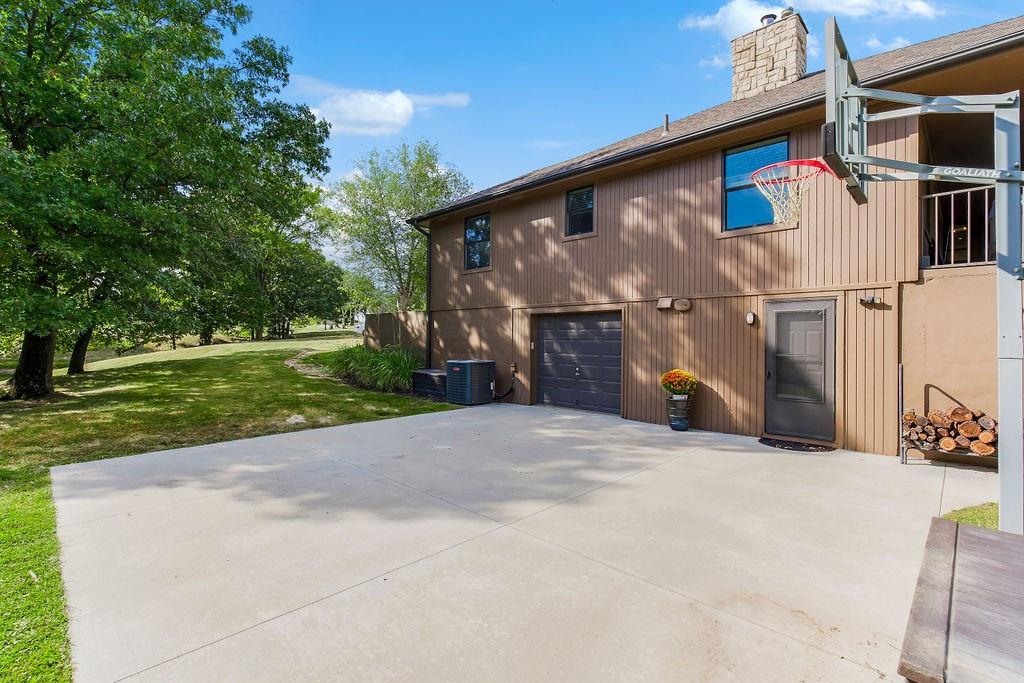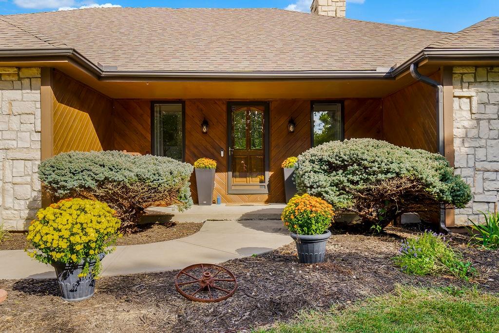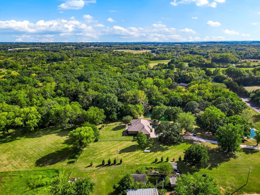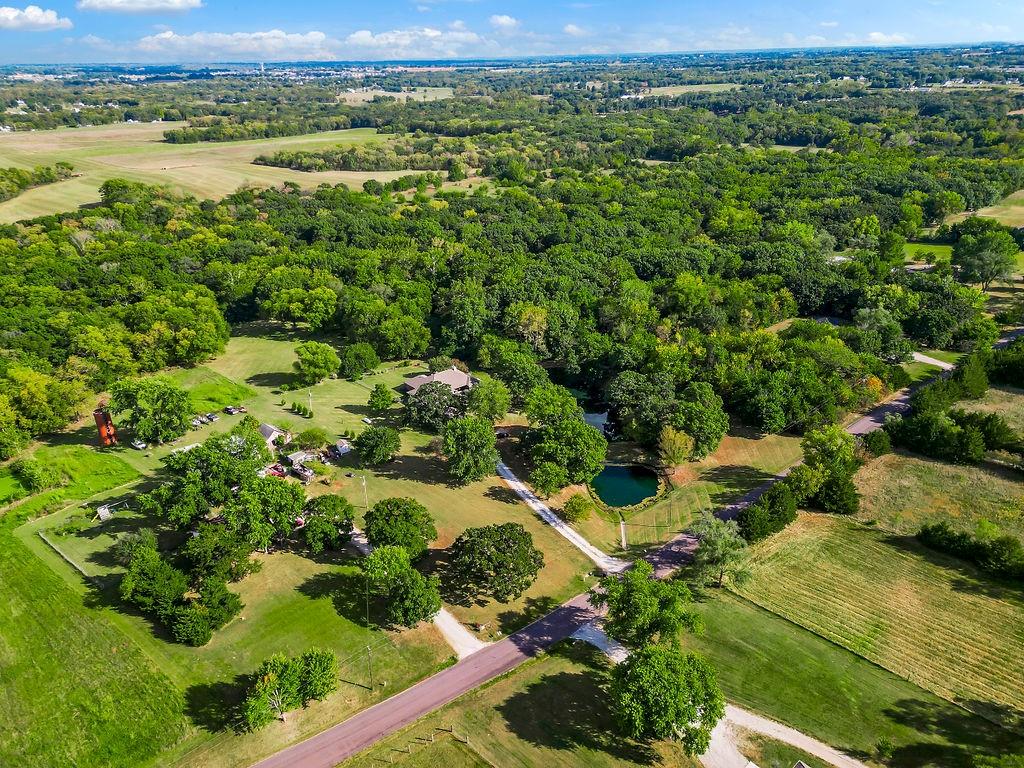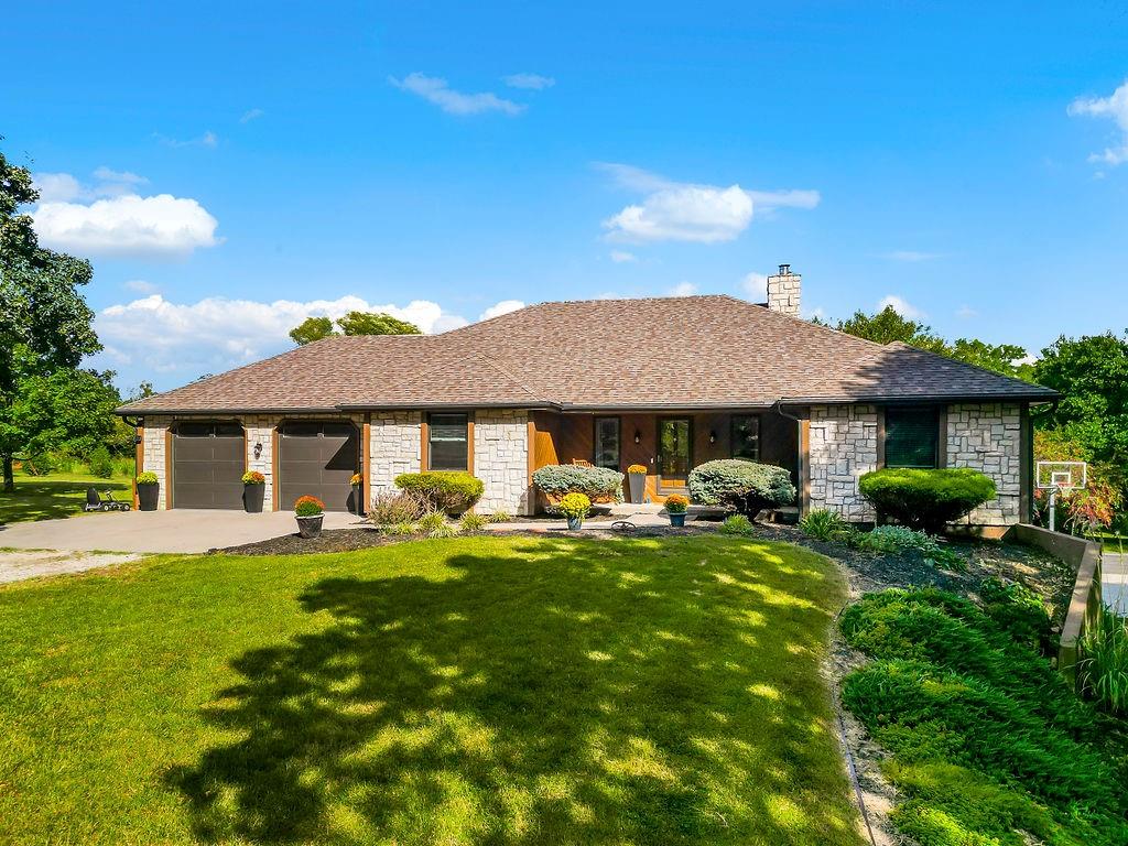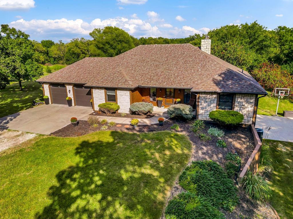 With over $50,000 in updates over the past several years and priced $15,000 UNDER a November 2025 appraisal value, this exquisitely renovated true ranch home set on 17.35 acres is a DREAM! Located within the Basehor-Linwood School District, this property is a nature lover's paradise, featuring abundant wildlife, two stocked ponds, scenic trails, and a creek with a bridge. The main level showcases a formal dining room, a spacious living room with beamed ceilings and a wood-burning fireplace, an updated kitchen with quartz countertops, new backsplash, updated flooring, new stainless-steel appliances, a pantry, and a cozy breakfast nook. Adjacent to the kitchen is the master suite with a walk-in closet, dual vanities, shower, and laundry room. For added privacy, there are two additional bedrooms and a full updated bath on the opposite side of the house. The lower level includes a family room, 4th bedroom, and half bath, with access to the garage/workshop, making it ideal for potential separate living quarters. The lower tandem garage workshop is equipped with AC and can accommodate 3 cars (additional 2-car garage on main level), with ample storage space available. The fenced backyard features a generously sized covered patio perfect for entertaining, relaxing in the hot tub, and enjoying the company of hummingbirds. With custom finishes throughout and recent updates that include a freshly painted interior, scraped ceilings, flooring, kitchen renovations, fixtures, and electrical/lighting, this home offers an absolutely tranquil setting just outside the city limits, where you can revel in the soothing sounds of nature.
