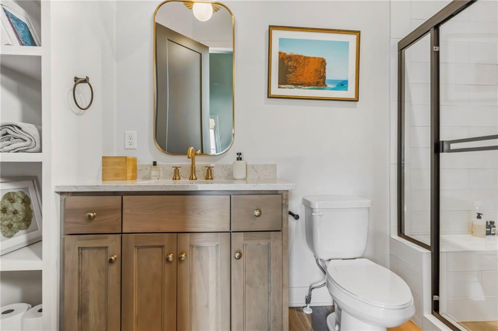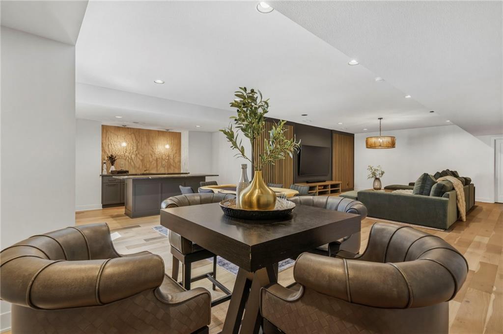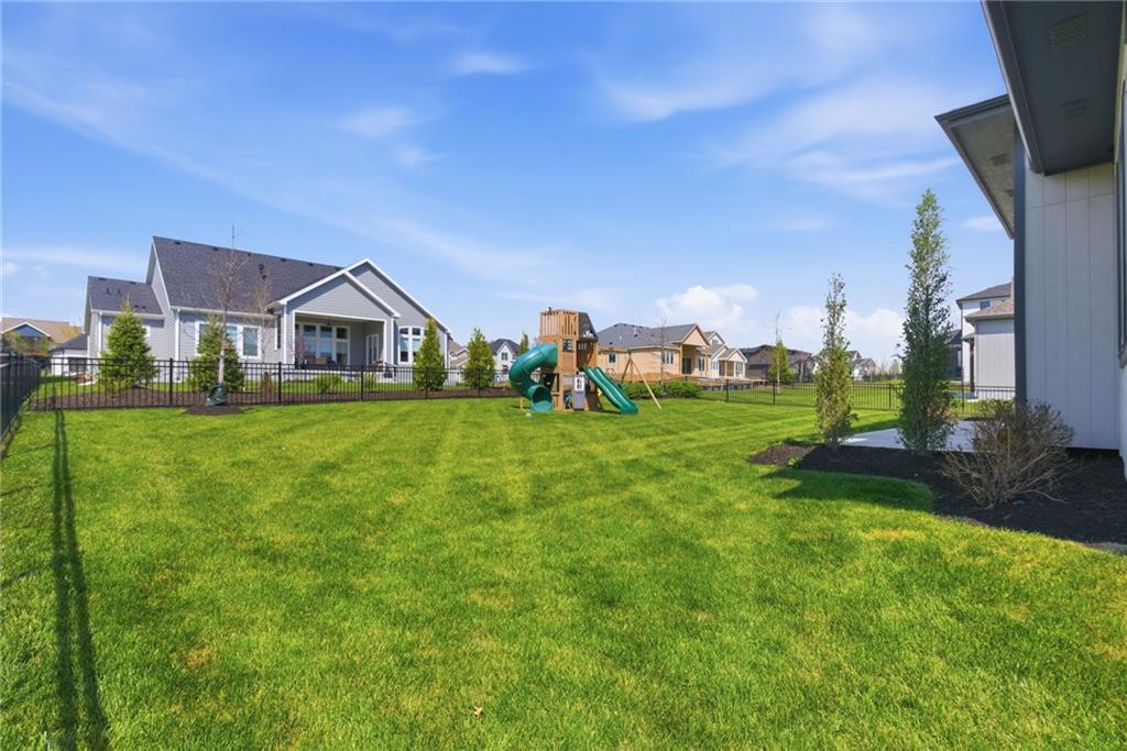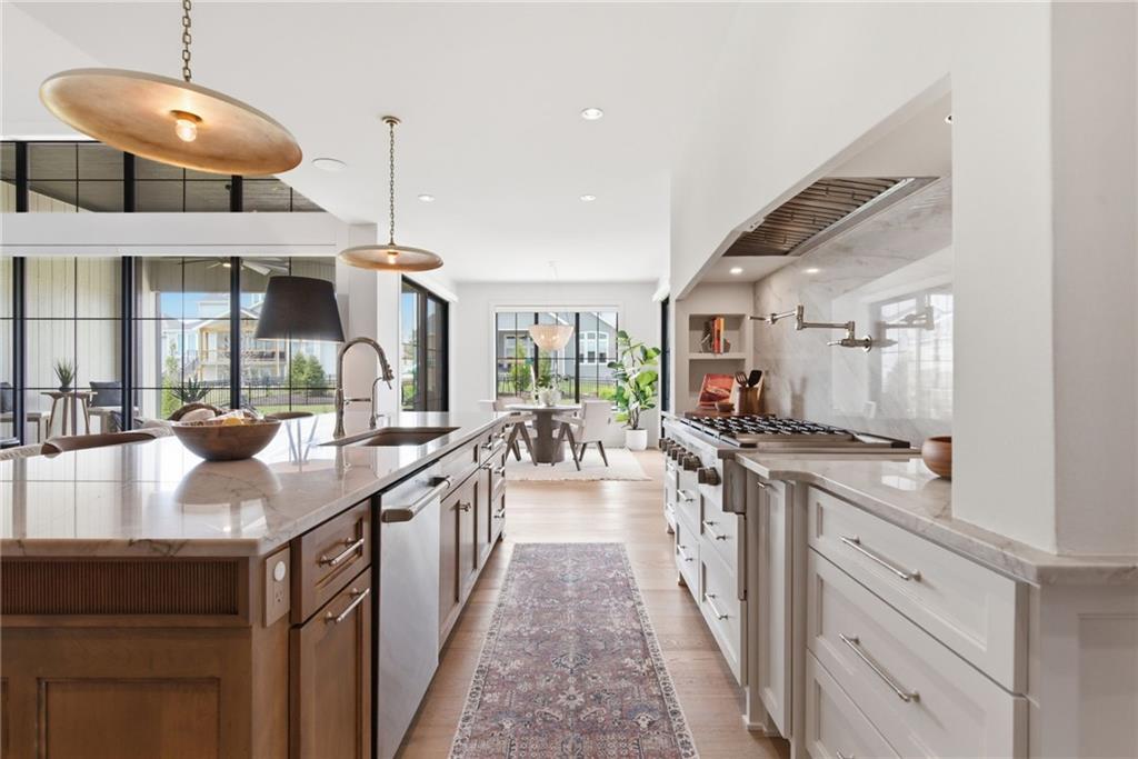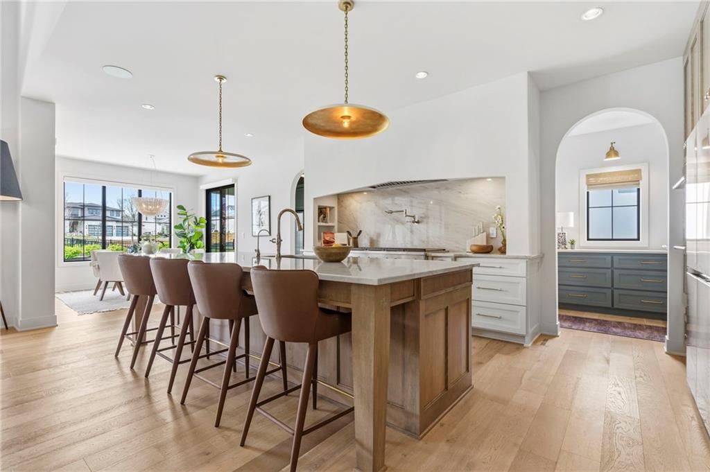 The kind of home where the design speaks for itself from the start. Originally built as the Bickimer Roosevelt 1.5-story model for the Parade of Homes, it carries a level of detail and intention that stands apart. Natural light, tall ceilings, and a striking great room with a cast stone fireplace and wood beam ceiling set the tone, while oversized glass doors create a strong sense of arrival. The kitchen is equally considered, featuring Taj Mahal quartzite, a statement plaster hood, reeded cabinetry, and a full butler’s pantry tucked just behind. Arched openings, custom millwork, and a bold sage mud hall bring depth and character throughout. This home goes beyond what is typically seen, with added upgrades including automatic window coverings throughout, a fully fenced backyard, epoxy garage floors, and elevated selections carried across every space! The main-level primary suite offers a quiet, retreat-like feel, while upstairs includes a loft and reading nook. The finished lower level is designed for entertaining with a bar, media space, full bath, and sauna. Set in Century Farms in the Blue Valley School District, the neighborhood offers a clubhouse, fitness center, resort-style pool, pickleball, and more, all just minutes from Bluehawk, parks, specialty grocers, dining, and everyday amenities!