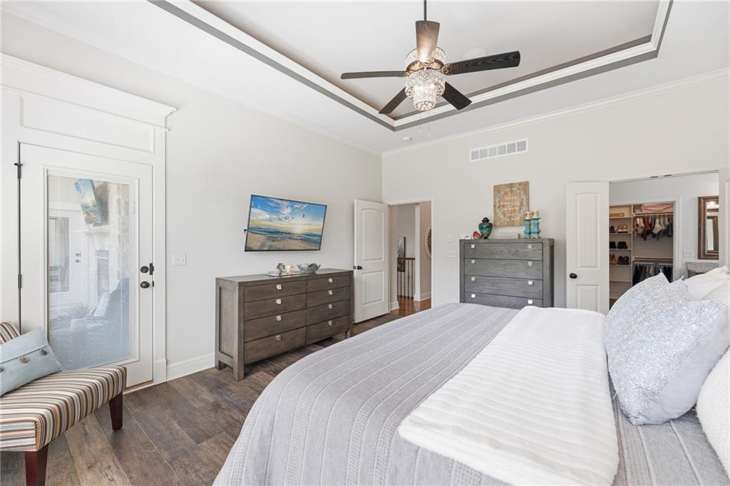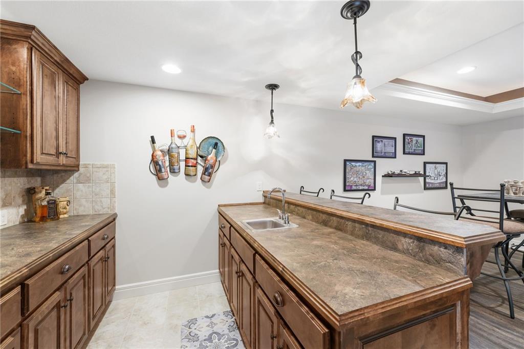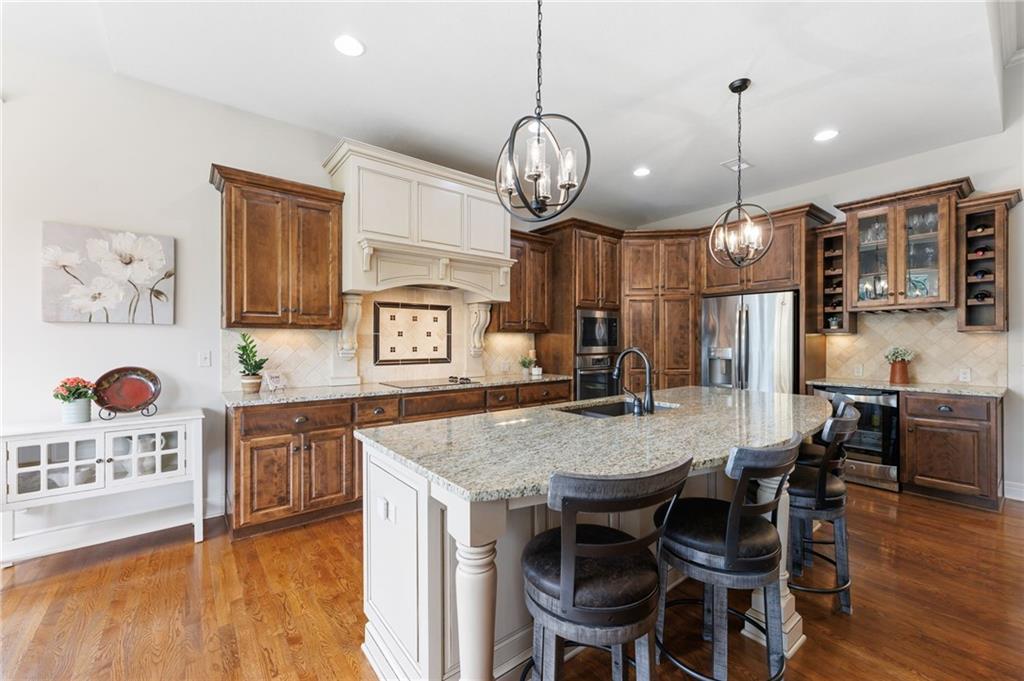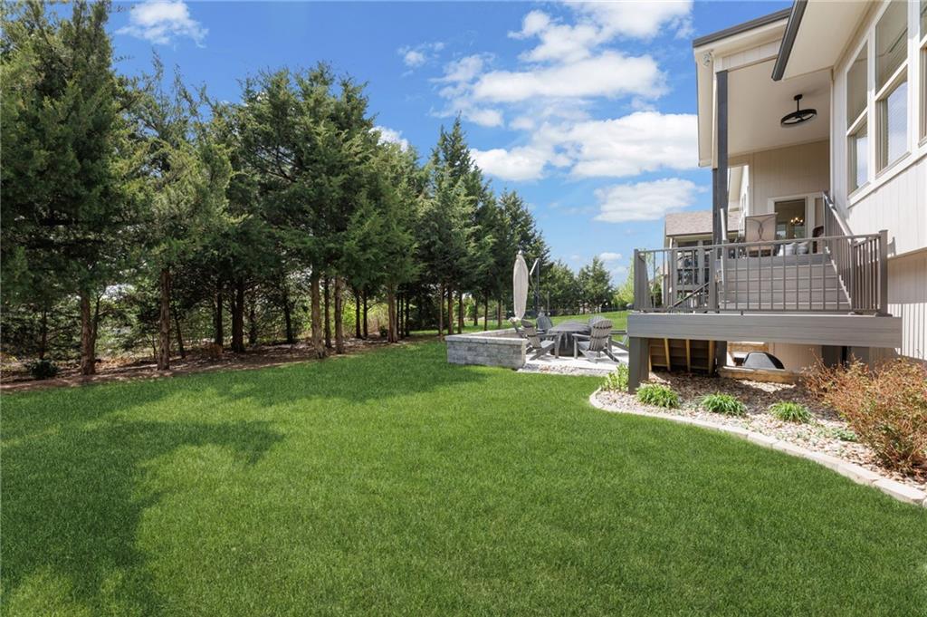 Welcome to this stunning former model home by James Engle Homes, showcasing the highly sought-after Emery reverse floor plan and loaded with gorgeous upgrades throughout. This beautifully designed 4-bedroom home offers the perfect blend of luxury and functionality. The main level features a spacious, light-filled great room with rich wood flooring and a striking see-through stone fireplace that extends to the covered, maintenance-free deck—creating a warm and inviting atmosphere both indoors and out. The gourmet kitchen is equally impressive, complete with granite countertops, double ovens, and a generous walk-in pantry, making it perfect for everyday living and entertaining. The luxurious primary suite offers a private retreat with dual vanities and a custom-tiled walk-in shower. The finished walkout/walkup lower level expands your living space with a large rec room, wet bar, two additional bedrooms, and a full bath—ideal for guests or entertaining. Step outside to enjoy exceptional outdoor living, including the covered deck with fireplace access and a beautifully designed stone patio with a fire pit, all backing to a serene tree line for added privacy. Additional highlights include a newer roof (just 2 years old) and access to fantastic neighborhood amenities, including a community pool. This home truly offers comfort, style, and convenience—don’t miss your opportunity to make it yours!