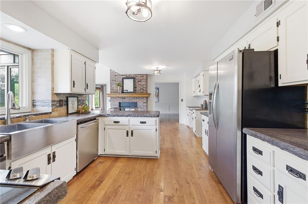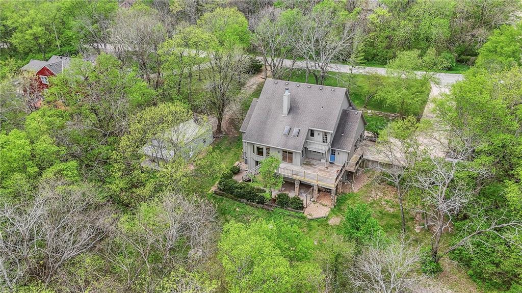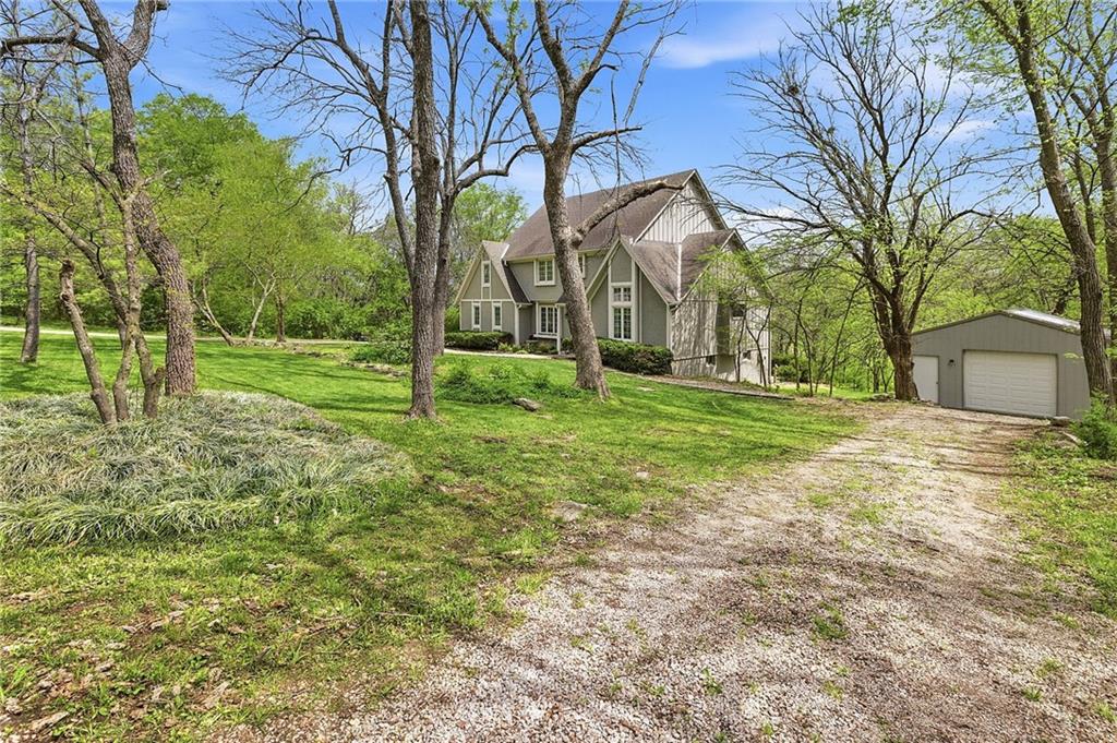 Nestled on a sprawling 1.24 acre wooded lot this stunning 1.5-story home offers the perfect blend of natural serenity, wildlife and sophisticated living. The main level is a host’s dream, featuring a formal dining room, a sunny breakfast area for casual mornings, a cozy hearth room, and large great room all flow together to create the perfect environment for entertaining. Imagine cozy evenings anchored by the fireplace or mornings on your private deck overlooking a peaceful creek and mature trees. The home features a spacious main floor primary suite, while the second level is thoughtfully designed with three large bedrooms, including one complete with its own private bath and walk-in closets. To maximize productivity and versatility, the upper level also includes a dedicated office space, offering an ideal setup for working from home or a quiet study library.The living space extends into a massive walk-out finished basement, providing the perfect footprint for a media room or recreation hub. Beyond the main home, the property is a dream for the hobbyist, featuring a large pole barn perfect for a workshop or additional storage. Located in the award-winning Blue Valley School District, this is a rare opportunity to own a private acreage retreat that perfectly balances grand entertaining with a peaceful, wooded escape. Welcome Home! Taxes and SqFt per county record. Room sizes approx. No preferences or limitations or discrimination because of any of the protected classes under Fair Housing.