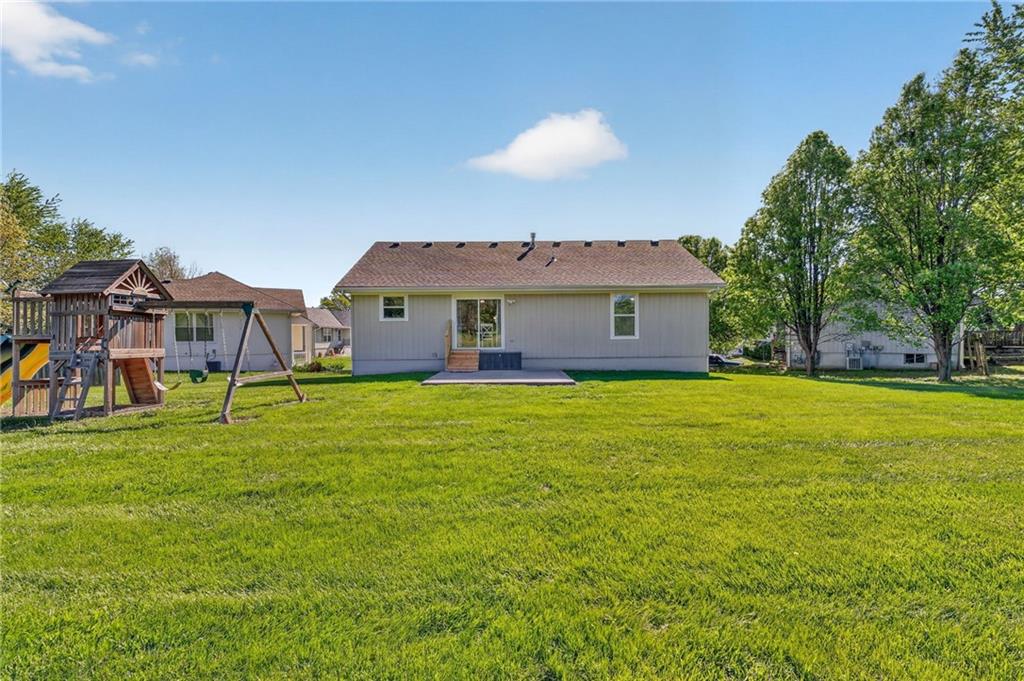 DARLING split level in COVETED MISSION RIDGE subdivision, Kearney schools!! CUL-DE-SAC LOT w/ HUGE, PRIVATE BACK YARD backing to church property! NEW CARPET & PAINT THROUGHOUT! MAIN LEVEL LIVING features PRIMARY SUITE, secondary beds/bath, kitchen & great room. 5 year roof, ALL APPLIANCES including refrigerator & washer/dryer stay! LL is finished w/ REC ROOM for extra living space & half bath for guests. Close to schools, highways & retail districts. Nest Thermostat, ADT Security System, Ring Doorbell, Ring Floodlight, Smart Garage Door Openers, Smart Appliances all stay! HURRY!