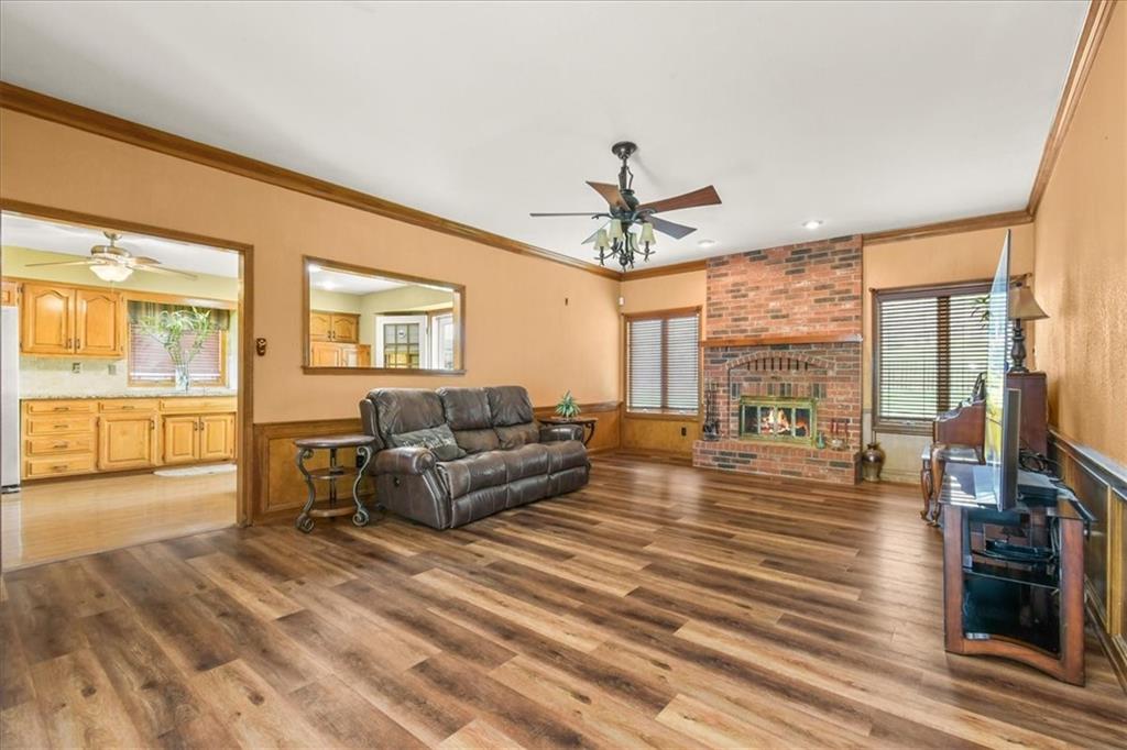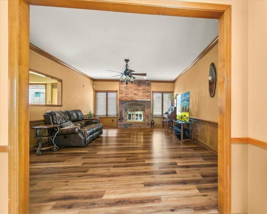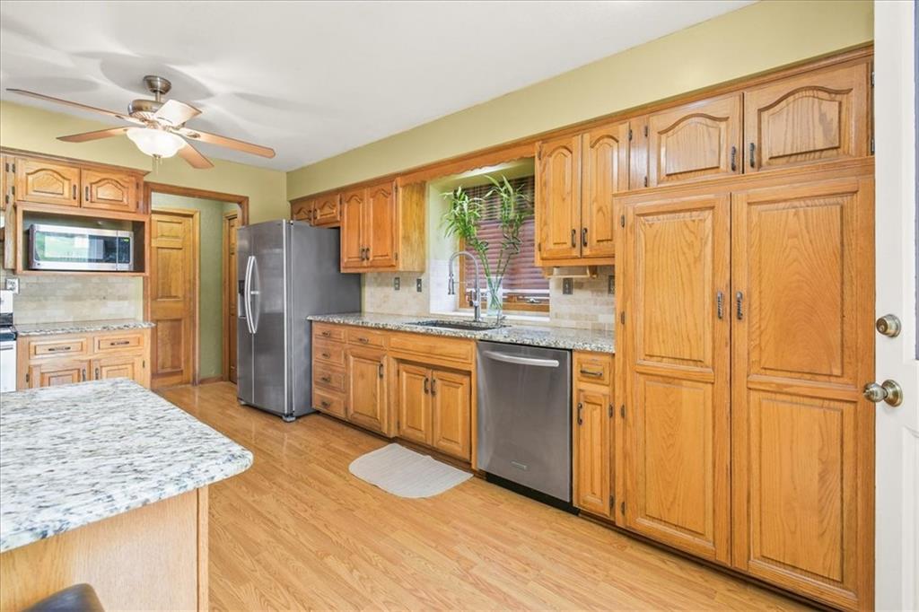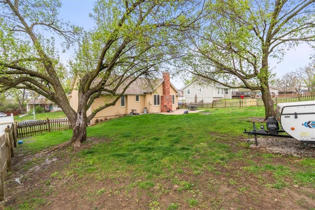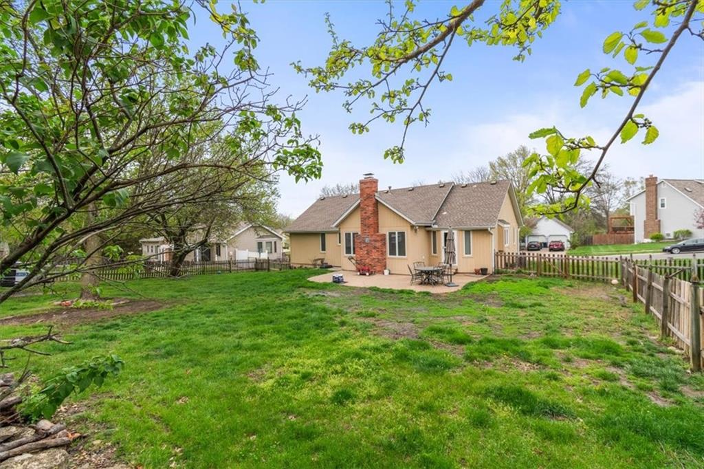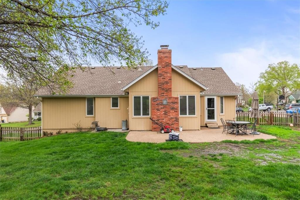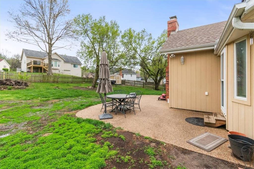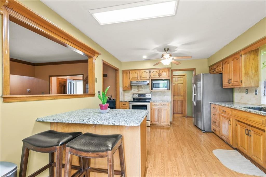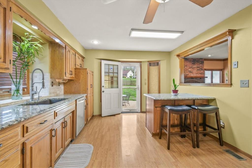 This charming raised ranch in Kansas City offers a perfect blend of classic character and functional space, making it a standout choice for modern living. The curb appeal is immediately inviting with a mix of timeless brick and siding, complemented by a tiered front walkway. Step inside to discover a bright and airy living room anchored by a stunning floor-to-ceiling brick fireplace and rich wood-style flooring that flows throughout the main level. The heart of the home is the updated eat-in kitchen, featuring sleek granite countertops, a tiled backsplash, and stainless steel appliances. A convenient pass-through window connects the kitchen to a versatile dining or breakfast nook, ideal for entertaining. The primary suite is a true retreat, boasting a beautiful tray ceiling and ample natural light. Additional bedrooms provide flexibility for a growing family or a dedicated home office. Downstairs, the finished basement expands your living options with a spacious family room/media area, and a large non-conforming additional bedroom that is perfect for guests or a private hobby space. Storage is never an issue thanks to the attached two-car garage with internal access. Outdoor enthusiasts will love the expansive, fully fenced backyard. A large stone patio offers the perfect setting for summer BBQs and morning coffee. Located in a quiet, established neighborhood with easy access to local amenities and highways, this home combines comfort with convenience. Whether you are hosting a gathering in the open-concept main floor or enjoying a quiet movie night in the lower-level rec room, this property is designed to accommodate every lifestyle. Do not miss your chance to own this home that truly has it all.