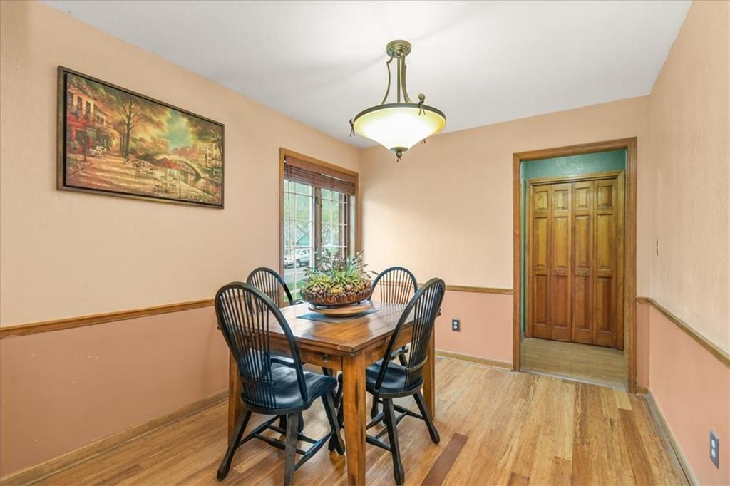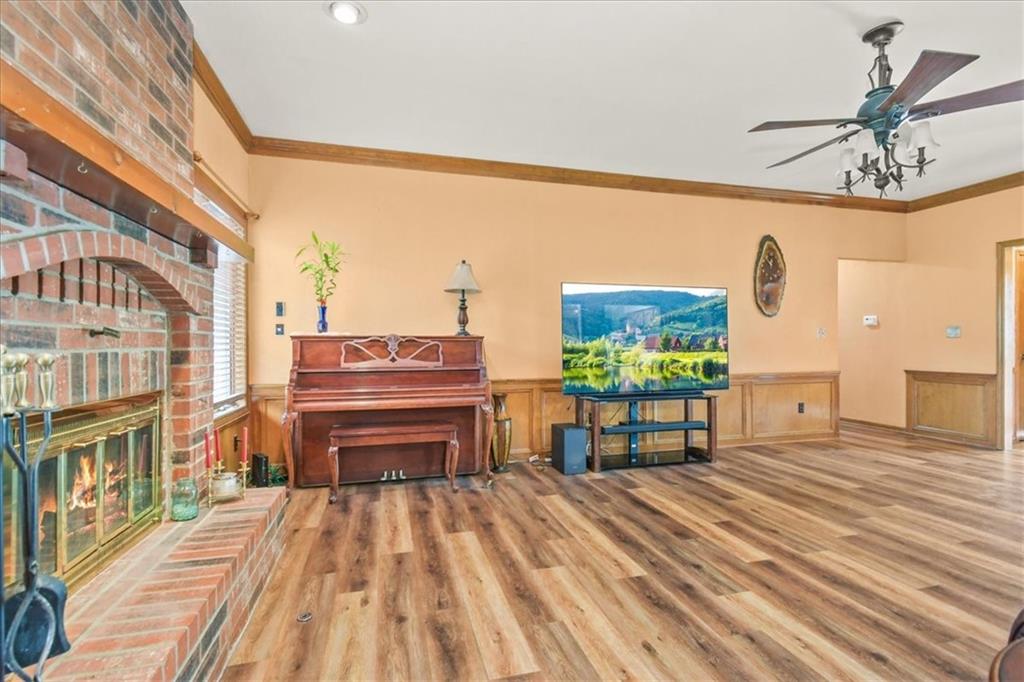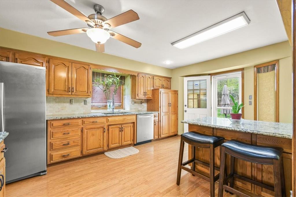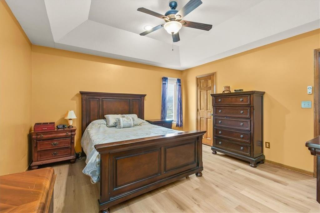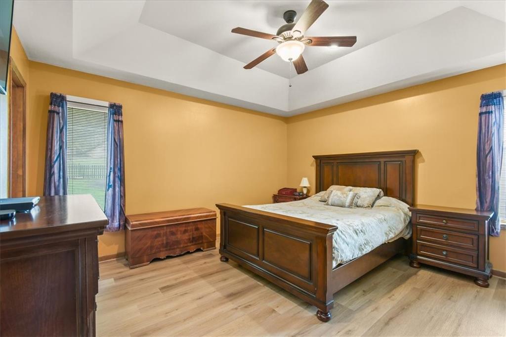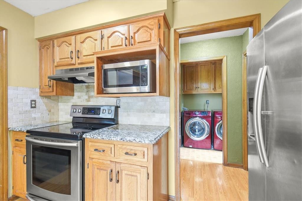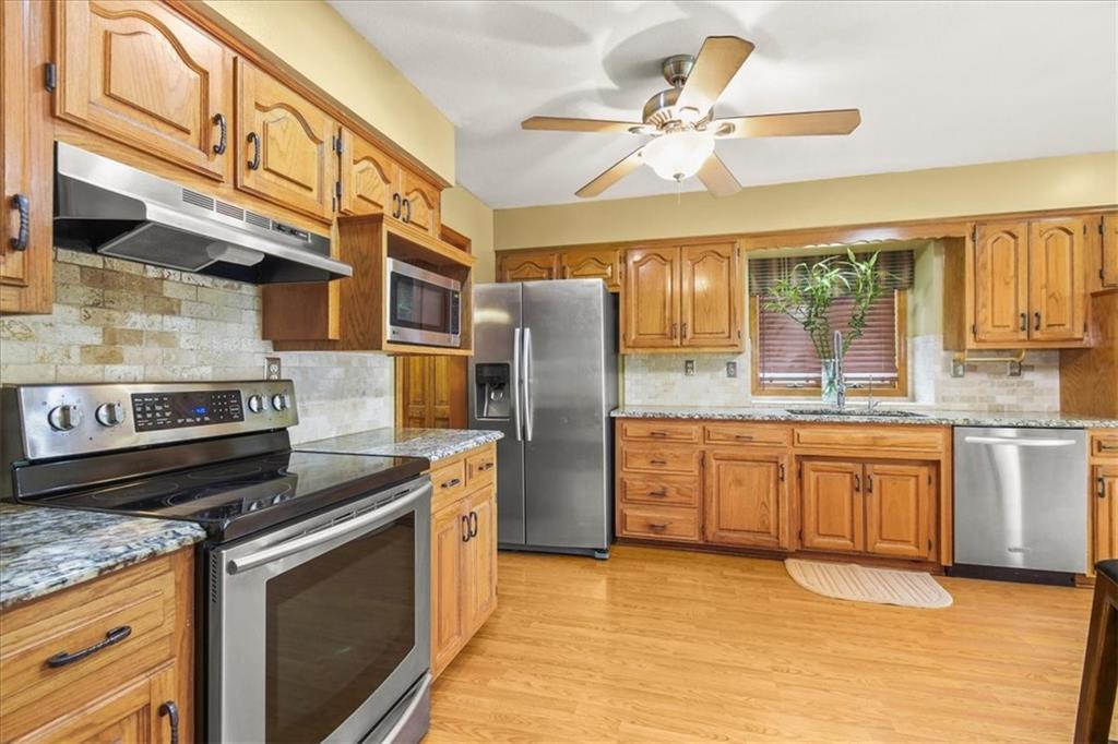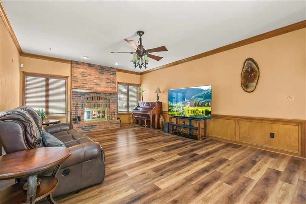 This charming raised ranch in Kansas City offers a perfect blend of classic character and functional space, making it a standout choice for modern living. The curb appeal is immediately inviting with a mix of timeless brick and siding, complemented by a tiered front walkway. Step inside to discover a bright and airy living room anchored by a stunning floor-to-ceiling brick fireplace and rich wood-style flooring that flows throughout the main level. The heart of the home is the updated eat-in kitchen, featuring sleek granite countertops, a tiled backsplash, and stainless steel appliances. A convenient pass-through window connects the kitchen to a versatile dining or breakfast nook, ideal for entertaining. The primary suite is a true retreat, boasting a beautiful tray ceiling and ample natural light. Additional bedrooms provide flexibility for a growing family or a dedicated home office. Downstairs, the finished basement expands your living options with a spacious family room/media area, and a large non-conforming additional bedroom that is perfect for guests or a private hobby space. Storage is never an issue thanks to the attached two-car garage with internal access. Outdoor enthusiasts will love the expansive, fully fenced backyard. A large stone patio offers the perfect setting for summer BBQs and morning coffee. Located in a quiet, established neighborhood with easy access to local amenities and highways, this home combines comfort with convenience. Whether you are hosting a gathering in the open-concept main floor or enjoying a quiet movie night in the lower-level rec room, this property is designed to accommodate every lifestyle. Do not miss your chance to own this home that truly has it all.