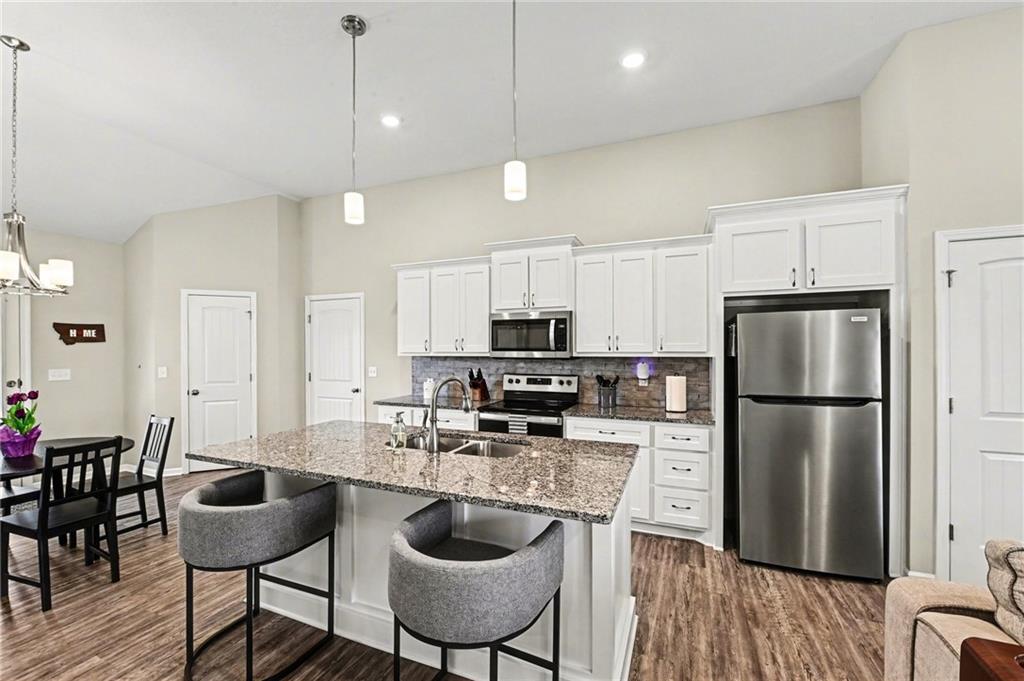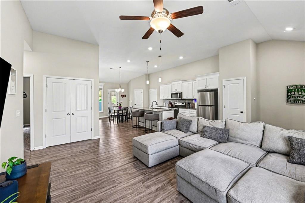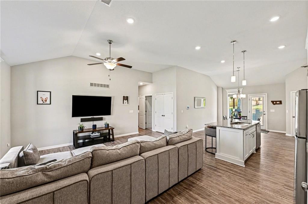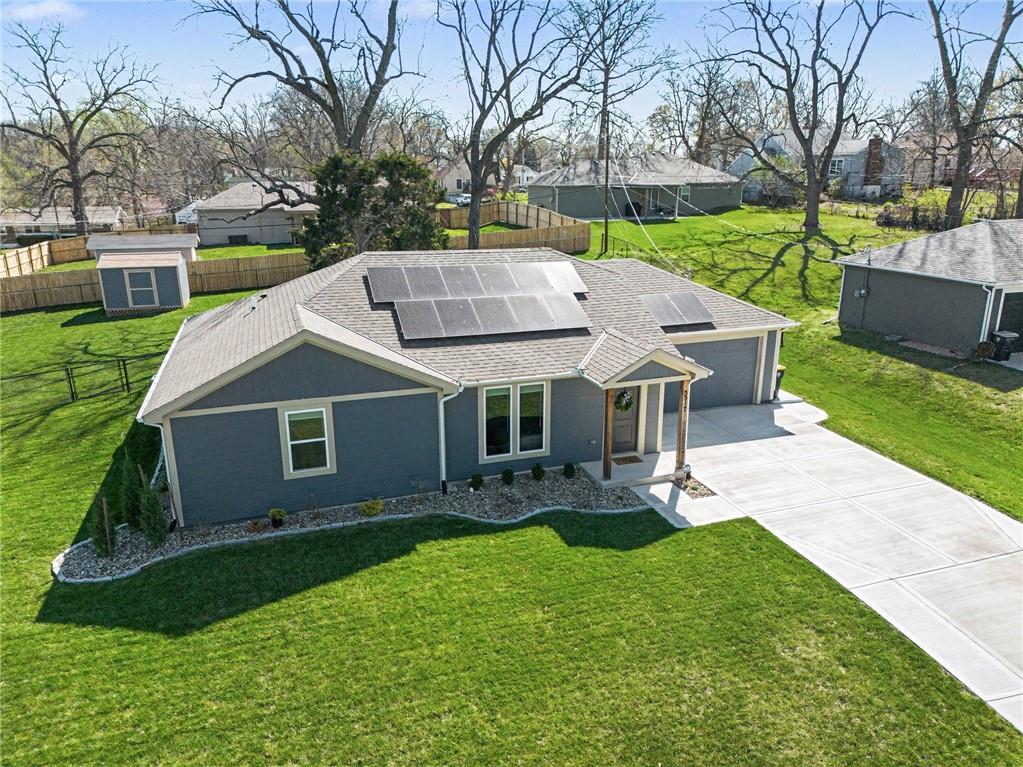 This charming home offers great curb appeal with beautifully landscaped front yard. When you step inside, you are welcomed by a spacious layout featuring vaulted ceilings and LVP flooring that immediately make the home feel open and inviting. The kitchen boasts crisp white cabinetry, stainless steel appliances, a walk in pantry, and a dining area just off to the side. This open concept space flows nicely and provides plenty of room for everyday living and entertaining. The primary bedroom features vaulted ceilings, a private full bathroom, and a walk in closet. Two additional bedrooms are located on the main floor, along with another full bathroom, a convenient laundry room, and a versatile bonus room that could be used as an office, playroom, or hobby space. Additional highlights include a two car garage and solar panels for added efficiency. Step outside to a large, fully fenced backyard with mature trees and a storage shed, offering plenty of space to relax or entertain.