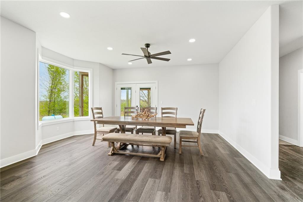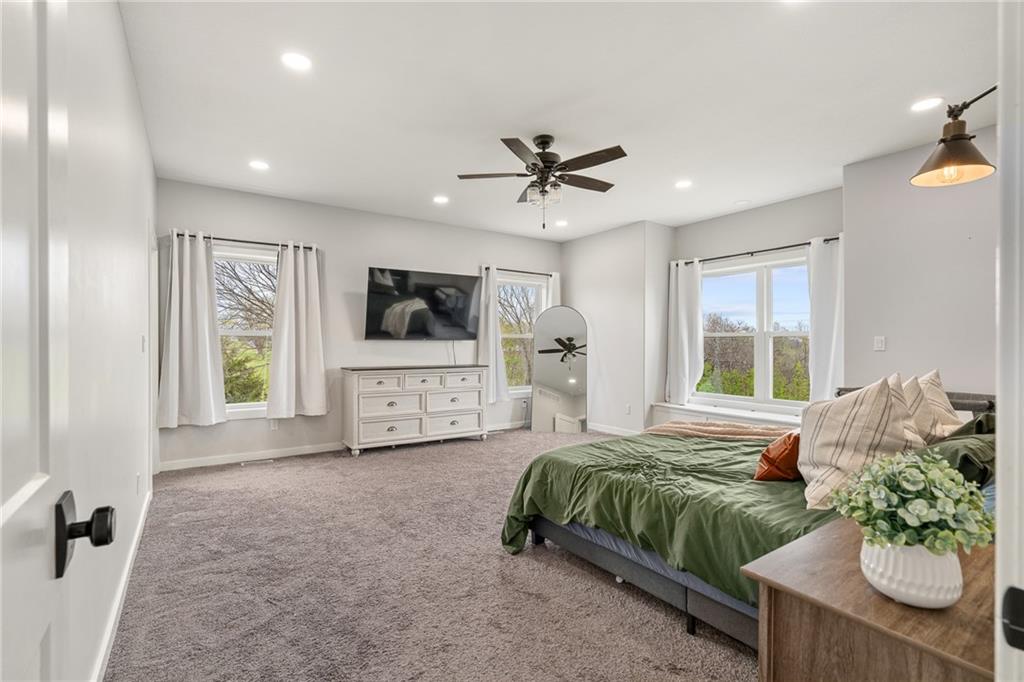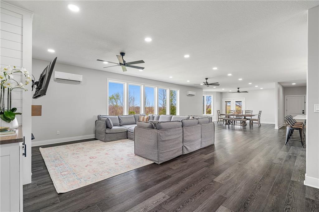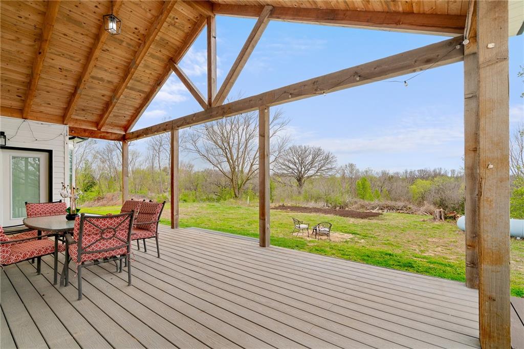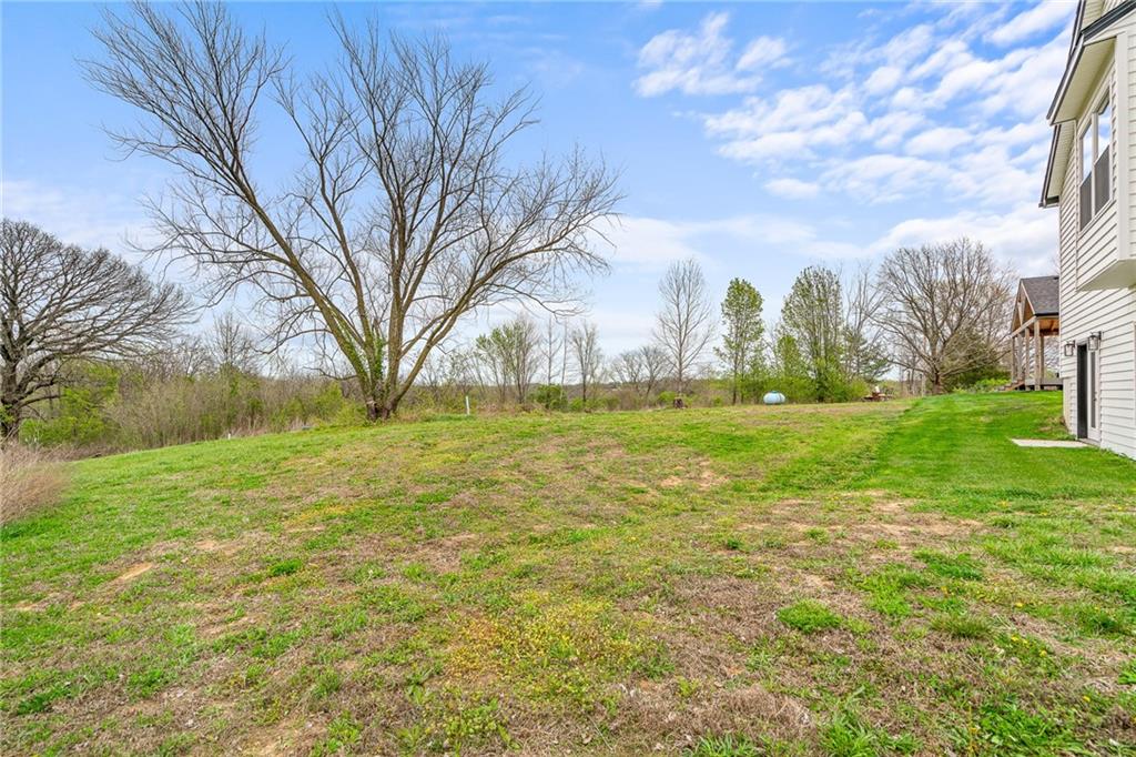 Start your mornings on the expansive 48-foot covered front porch, coffee in hand, as the quiet of the countryside and sweeping views ease you into the day. Set on 4.84± acres, featuring a beautiful newer home, this property offers a rare sense of space and privacy—perfect for those craving a slower pace without giving up convenience. Inside, thoughtful design meets everyday luxury. The open-concept floor plan is both inviting and functional, centered around a gourmet kitchen featuring custom white oak cabinetry, quartz countertops, double ovens, a Butler’s pantry, appliance lift, and an impressive 10-foot island—perfect for gathering. The adjoining family room is filled with natural light and anchored by a cozy gas fireplace. Upstairs, you’ll find generously sized bedrooms, including a serene primary suite retreat with a spa-inspired bath showcasing a 10-foot dual-head shower. Tucked beyond the expansive primary closet is a hidden office or flex space—ideal for working from home or a private escape. The finished walkout lower level offers even more room to live and entertain with 9-foot ceilings, two additional bedrooms, a full bath, and a large rec room. A substantial 8-foot concrete storm shelter provides peace of mind, while abundant storage keeps everything organized-1,600 square feet of unfinished endless potential. Car enthusiasts and pet lovers alike will appreciate the extended three-car garage with built-in dog wash. Out back, the elevated deck overlooks your acreage, with a concrete pad below already in place for a future hot tub—just imagine the evenings. With fiber internet, wide-open space, and endless possibilities, this property delivers the best of both worlds: modern comfort and the freedom of country living. Located 30 minutes to the Kansas City International airport and 35-40 minutes to downtown Kansas City. A rare opportunity to own acreage without compromise—offering endless potential to make it truly your own.