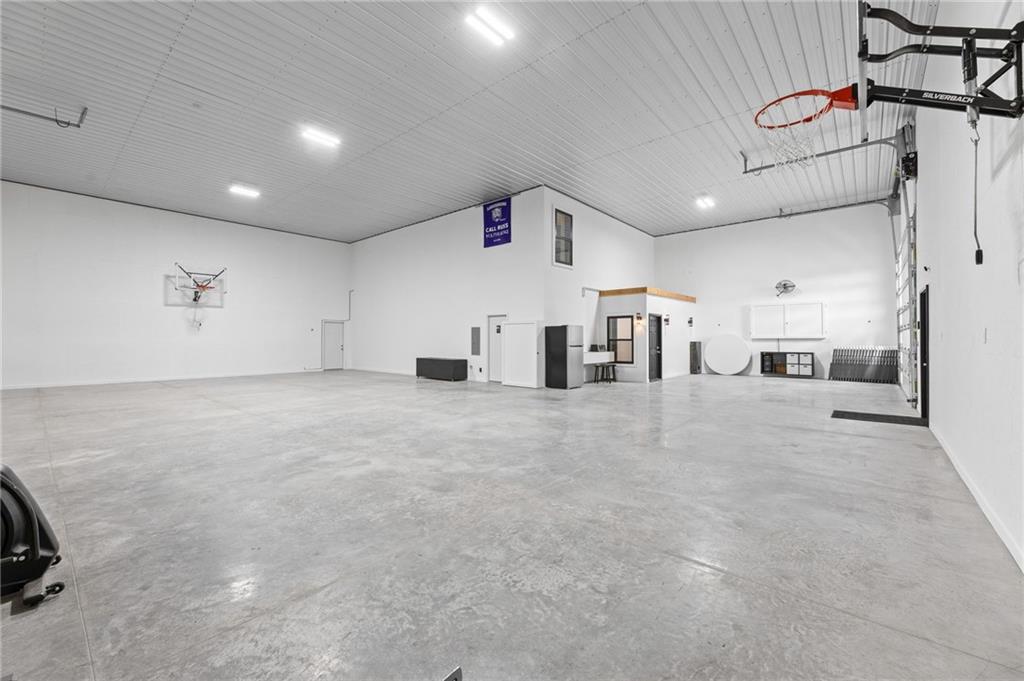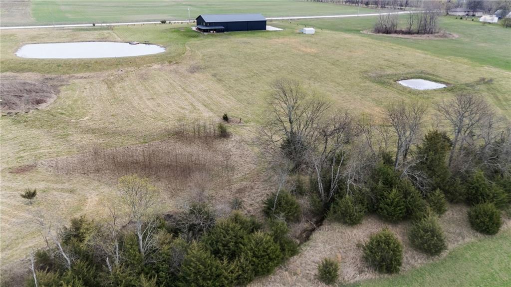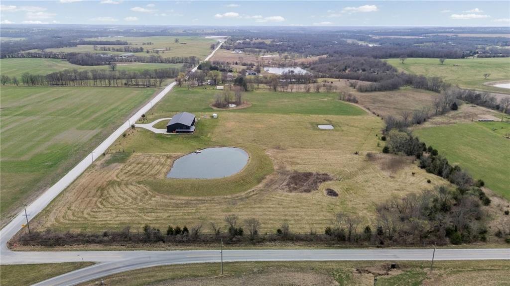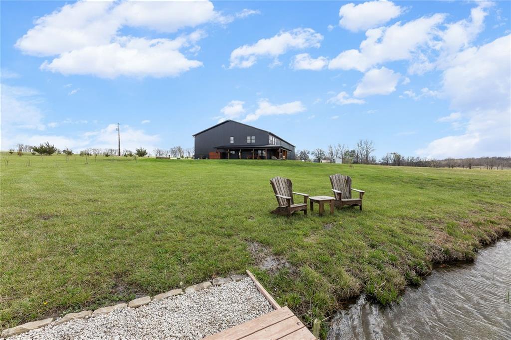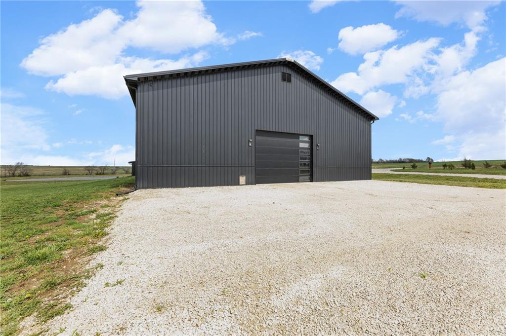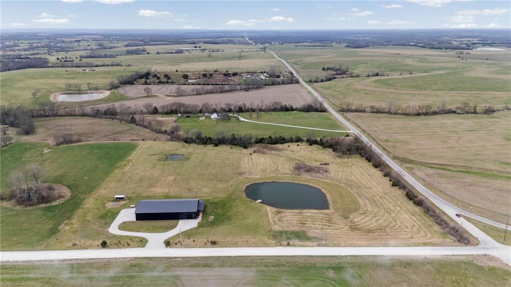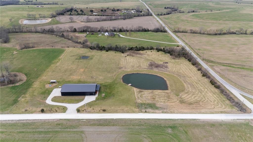 Experience function, flexibility, and country living with this custom-built barndominium on 14± scenic acres in Northern Miami County, located in the highly sought-after Louisburg School District. This impressive 60x125 structure with 18-foot sidewalls offers 1,600 square feet of thoughtfully designed living space alongside an expansive, multi-use shop. The 1.5-story home features an open, minimalist layout with 3 bedrooms (including one non-conforming), 2.5 bathrooms, and a main-level primary suite. Plumbing for radiant heat is installed in the concrete floors, and the living quarters is all-electric for efficient, comfortable living. Step outside and enjoy the 10-foot wraparound covered porch overlooking a picturesque setting complete with a professionally stocked, spring-fed pond, a creek, mature trees, and open pasture—ideal for both relaxation and recreation. The shop space is truly one-of-a-kind. Half is fully finished, heated, and insulated with a concrete floor, featuring a kitchenette, half bath, full RV hookups, basketball goals, and a large TV setup—perfect for entertaining or hosting game days. With ample space, you’ll have room to park multiple vehicles, equipment, or recreational toys indoors. The remaining half features a sand base, offering incredible versatility—ideal for an indoor riding area to keep horses conditioned year-round, equipment storage, or additional workspace tailored to your needs. Whether you’re looking for a hobby farm, entertainment hub, or a unique live/work property, this one delivers unmatched versatility in a beautiful rural setting.