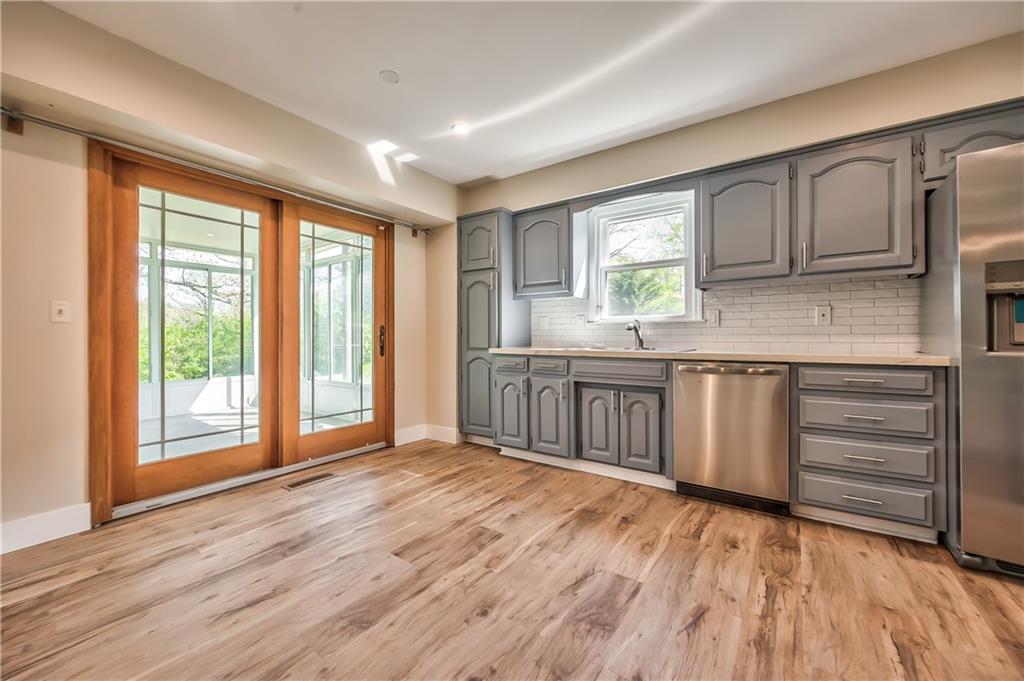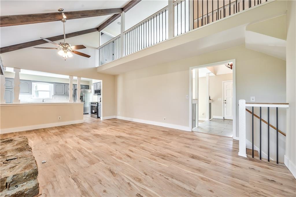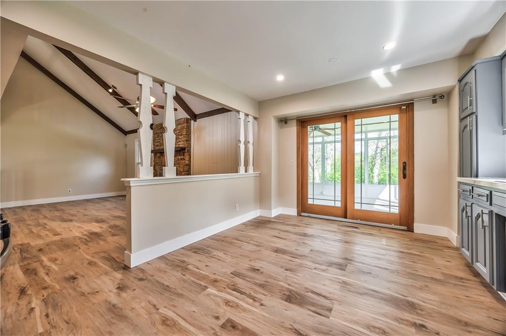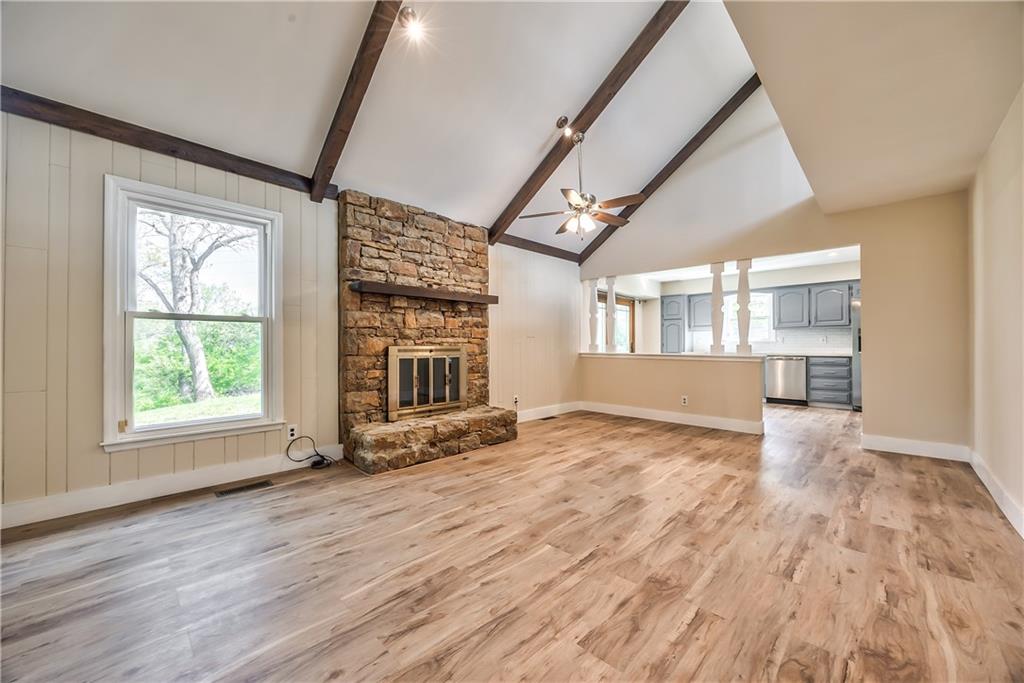 Welcome to this completely remodeled home in Shawnee. As you enter, you are greeted by a tiled entryway which leads into the sunken formal living room and adjacent formal dining room. Elegant luxury vinyl plank flooring flows seamlessly throughout most of the home, creating a cohesive and inviting atmosphere. The family room is an entertainer's dream, boasting soaring ceilings with striking wood beams and a timeless stone fireplace as the focal point. The kitchen is a chef’s delight, featuring pristine quartz countertops, freshly painted cabinets, a stylish subway tile backsplash, and brand-new stainless-steel appliances, including a refrigerator. Step into the sun room, offering an additional 204 square feet of space, perfect for relaxing or hosting gatherings with family and friends. The spacious master suite includes a private bath with a shower and a walk-in closet. A light-filled loft overlooks the family room and the entry. The generously sized secondary bedrooms are complemented by a second full bath with dual vanities. Fresh interior and exterior paint ensures a move-in-ready experience. The expansive bonus room on the lower level provides ample space for your imagination perfect as an office, craft room, or workout area. A large unfinished basement presents a wonderful opportunity to expand and design the living space of your dreams. Enjoy outdoor living at its finest in the backyard, where mature trees create a serene environment—ideal for entertaining or simply enjoying the peaceful surroundings.