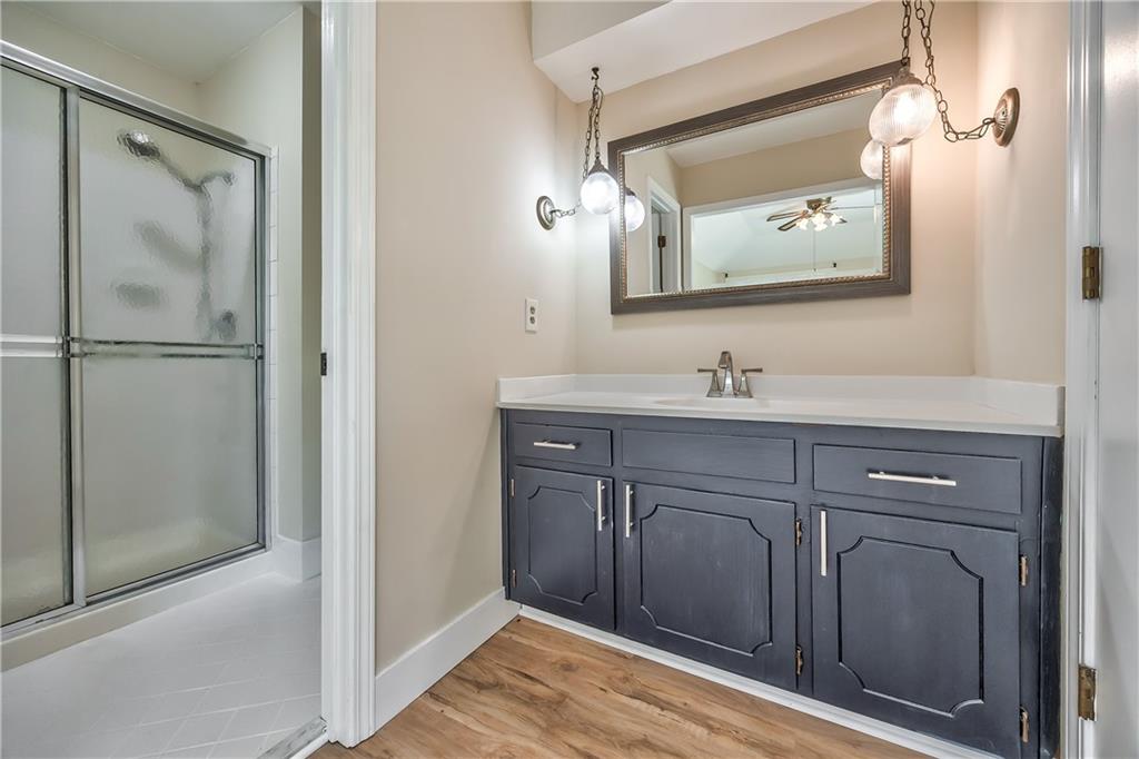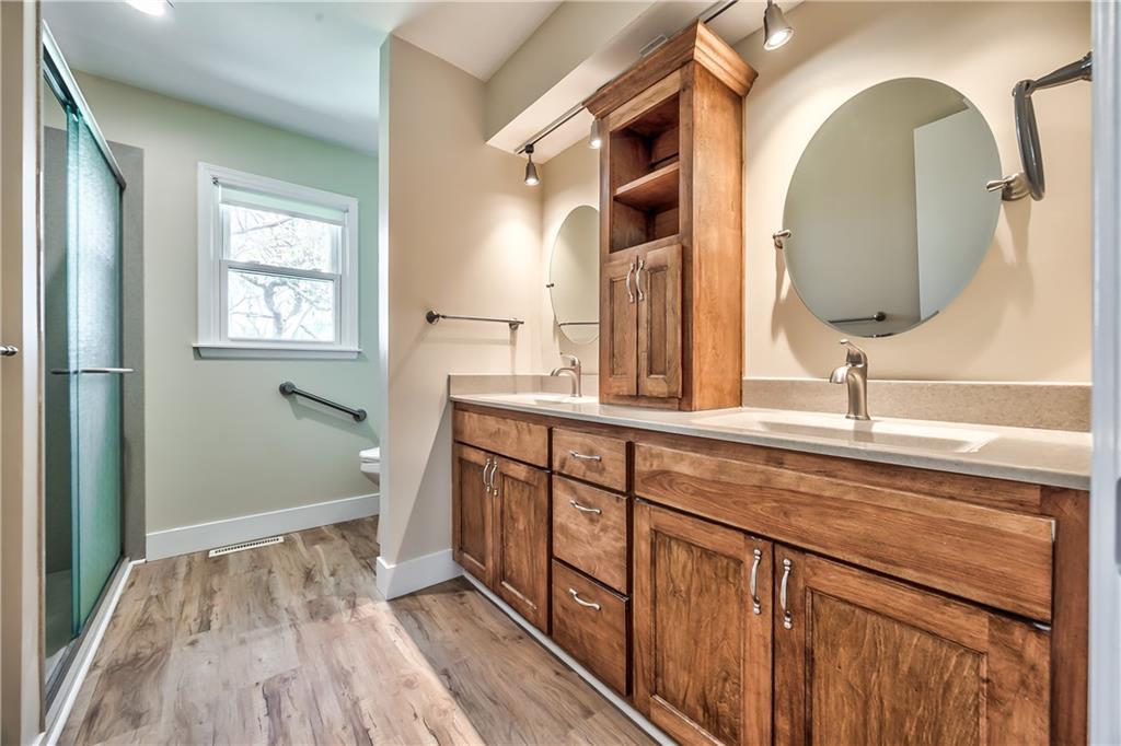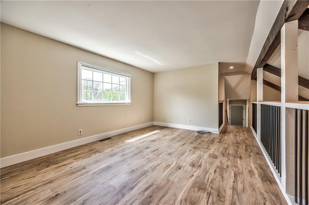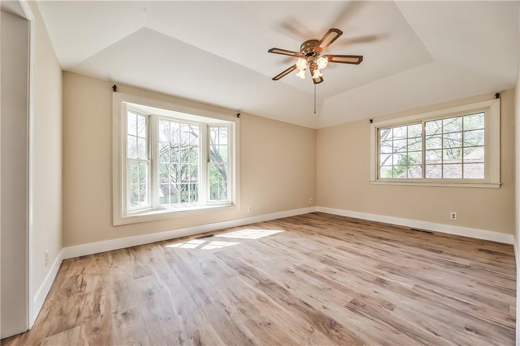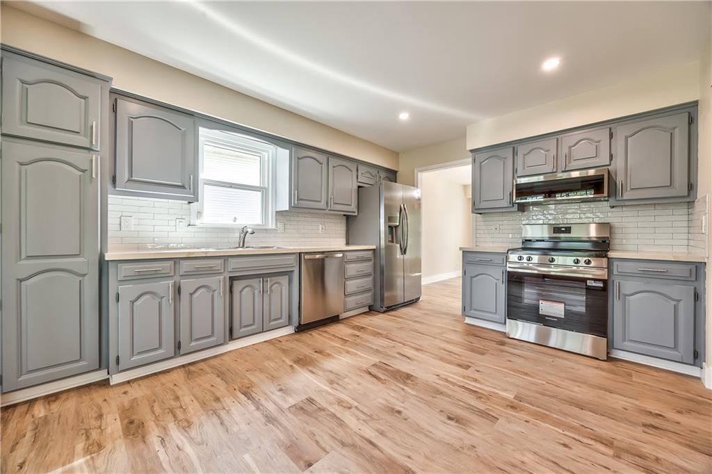 Welcome to this completely remodeled home in Shawnee. As you enter, you are greeted by a tiled entryway which leads into the sunken formal living room and adjacent formal dining room. Elegant luxury vinyl plank flooring flows seamlessly throughout most of the home, creating a cohesive and inviting atmosphere. The family room is an entertainer's dream, boasting soaring ceilings with striking wood beams and a timeless stone fireplace as the focal point. The kitchen is a chef’s delight, featuring pristine quartz countertops, freshly painted cabinets, a stylish subway tile backsplash, and brand-new stainless-steel appliances, including a refrigerator. Step into the sun room, offering an additional 204 square feet of space, perfect for relaxing or hosting gatherings with family and friends. The spacious master suite includes a private bath with a shower and a walk-in closet. A light-filled loft overlooks the family room and the entry. The generously sized secondary bedrooms are complemented by a second full bath with dual vanities. Fresh interior and exterior paint ensures a move-in-ready experience. The expansive bonus room on the lower level provides ample space for your imagination perfect as an office, craft room, or workout area. A large unfinished basement presents a wonderful opportunity to expand and design the living space of your dreams. Enjoy outdoor living at its finest in the backyard, where mature trees create a serene environment—ideal for entertaining or simply enjoying the peaceful surroundings.