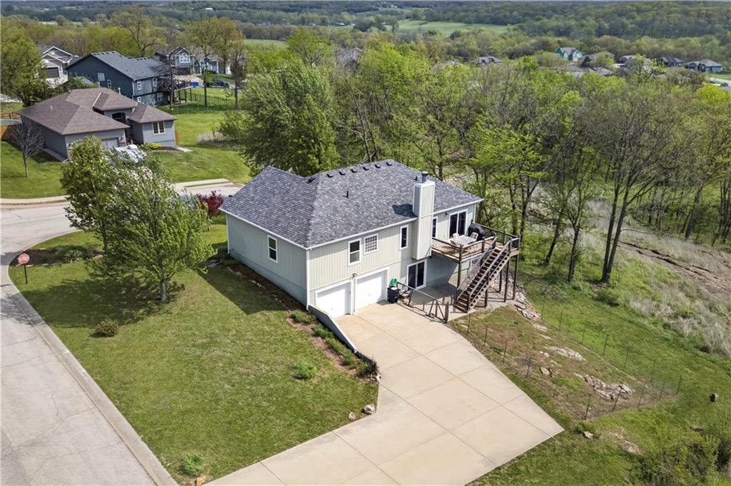 Welcome to Whispering Hills Estates, where this beautifully maintained home sits on a spacious corner lot surrounded by mature trees and peaceful views of nature and wildlife. Offering both privacy and a serene setting, this property is ideal for those seeking a quiet retreat while still being conveniently located near local amenities. Inside, you will find a functional and inviting layout with an oversized great room filled with natural light and anchored by a wood-burning fireplace, ready to create a warm and cozy atmosphere. The kitchen and dining area flow seamlessly and lead directly to the back deck, the perfect place to enjoy stunning sunrise and sunset views. The spacious primary suite offers a relaxing escape with double vanities and a jetted tub designed for unwinding at the end of the day. Additional features include an unfinished daylight walkout basement already stubbed for a full bathroom, providing endless potential for future living space, storage, or customization to fit your needs. A storm shelter adds an extra layer of peace of mind. The oversized garage offers ample space for vehicles, a workshop, or additional storage, making it as practical as it is functional. With its scenic setting, flexible living space, and opportunity to make it your own, this home stands out in the Lone Jack real estate market and is ready for its next chapter.