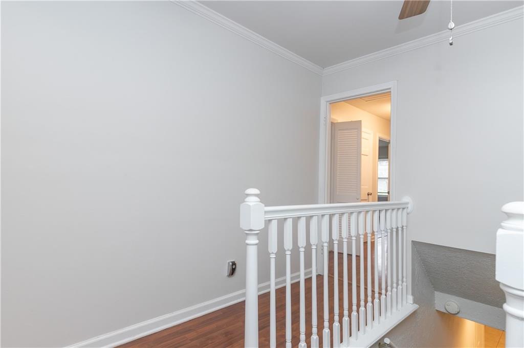 Stairs with Rail in Living room leads to basement & Hall to the left leads to 2 bedrooms on main level