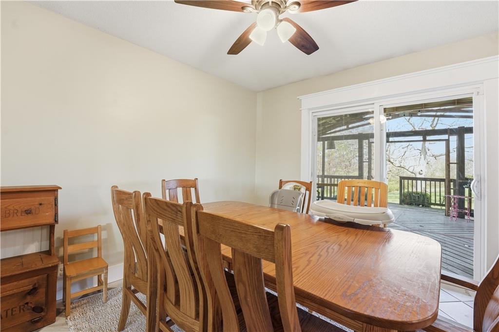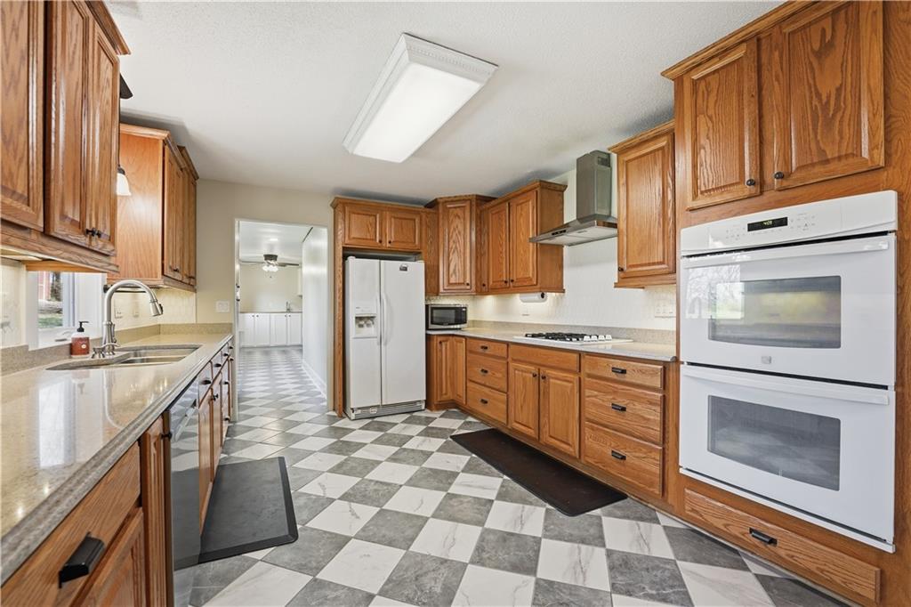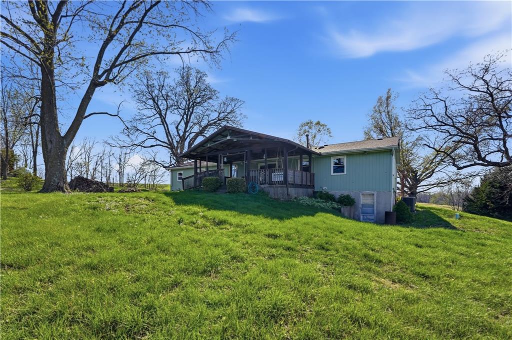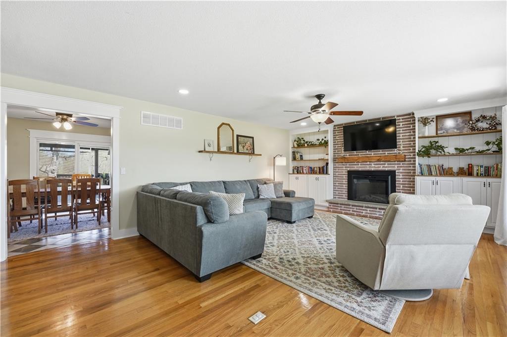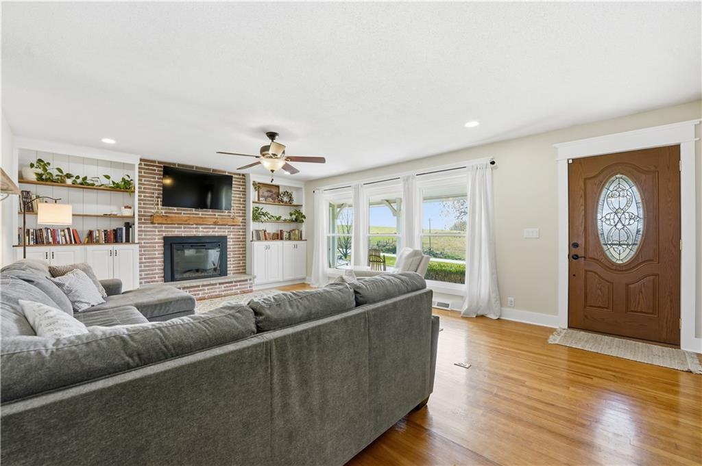 Welcome to this beautifully updated home in the Burns Addition subdivision of Edgerton, Missouri. From the moment you walk in, you’ll love the warm hardwood floors, stunning brick fireplace and custom built-ins that create a cozy and inviting living space. A wall of windows fills the home with natural light, making every room feel bright and open. The updated kitchen offers an abundance of cabinet and counter space, featuring Corian countertops, a gas cooktop with stainless steel hood vent, tile flooring, and a built-in pantry—perfect for everyday living and entertaining. Just off the kitchen, step out to the expansive covered deck overlooking a large, private lot with mature fruit trees, creating a peaceful outdoor retreat you’ll enjoy year-round. All three bedrooms are generously sized, and the primary bathroom has been fully updated with a fresh, modern feel. You’ll also appreciate the convenience of main-level laundry complete with built-in cabinets and a utility sink. The unfinished walkout lower level provides excellent storage or future finishing potential, and the attached two-car garage adds even more functionality. A small shed offers additional outdoor storage, and the serene setting provides privacy while still being conveniently located. This home truly combines comfort, space, and thoughtful updates—ready for you to move in and enjoy.