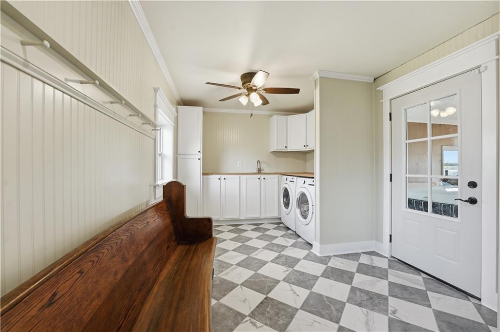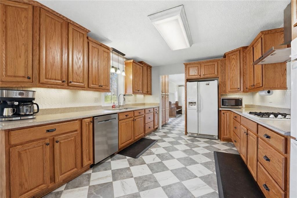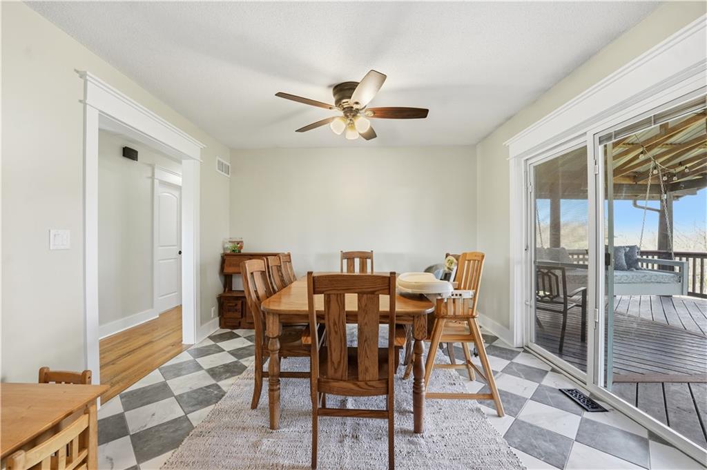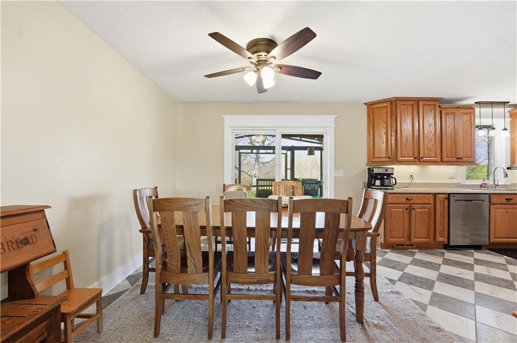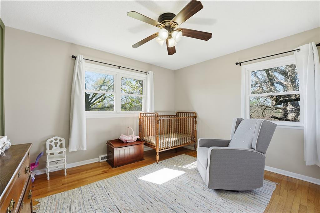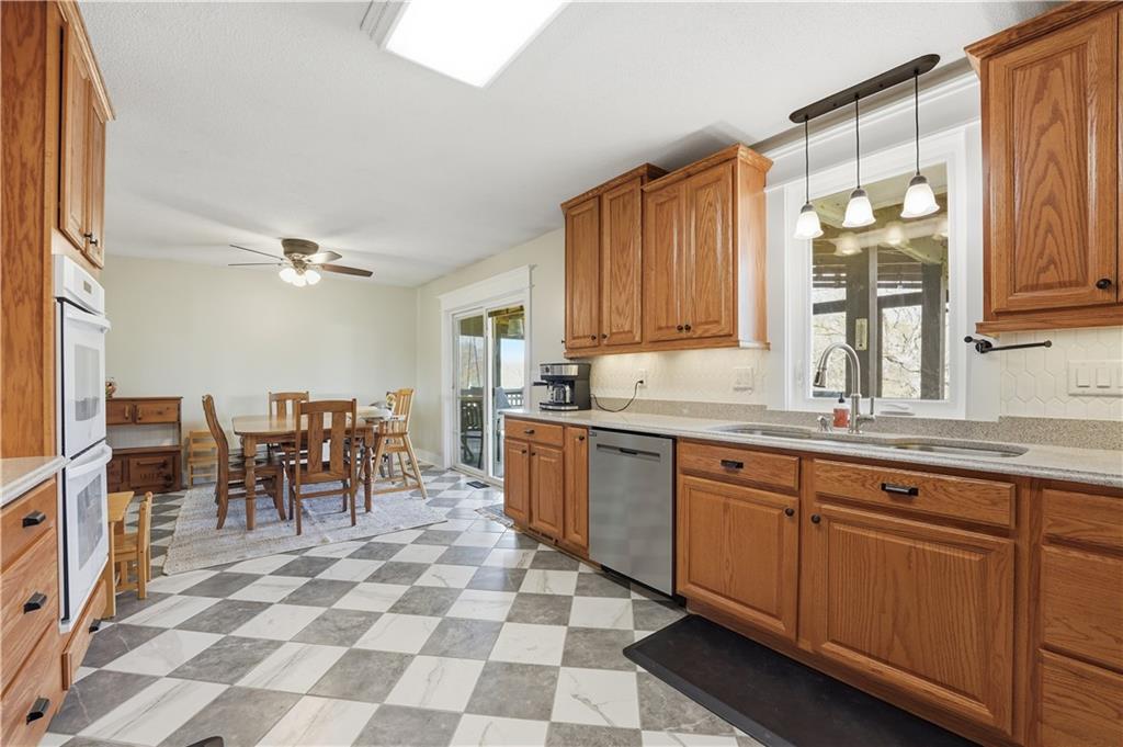 Welcome to this beautifully updated home in the Burns Addition subdivision of Edgerton, Missouri. From the moment you walk in, you’ll love the warm hardwood floors, stunning brick fireplace and custom built-ins that create a cozy and inviting living space. A wall of windows fills the home with natural light, making every room feel bright and open. The updated kitchen offers an abundance of cabinet and counter space, featuring Corian countertops, a gas cooktop with stainless steel hood vent, tile flooring, and a built-in pantry—perfect for everyday living and entertaining. Just off the kitchen, step out to the expansive covered deck overlooking a large, private lot with mature fruit trees, creating a peaceful outdoor retreat you’ll enjoy year-round. All three bedrooms are generously sized, and the primary bathroom has been fully updated with a fresh, modern feel. You’ll also appreciate the convenience of main-level laundry complete with built-in cabinets and a utility sink. The unfinished walkout lower level provides excellent storage or future finishing potential, and the attached two-car garage adds even more functionality. A small shed offers additional outdoor storage, and the serene setting provides privacy while still being conveniently located. This home truly combines comfort, space, and thoughtful updates—ready for you to move in and enjoy.