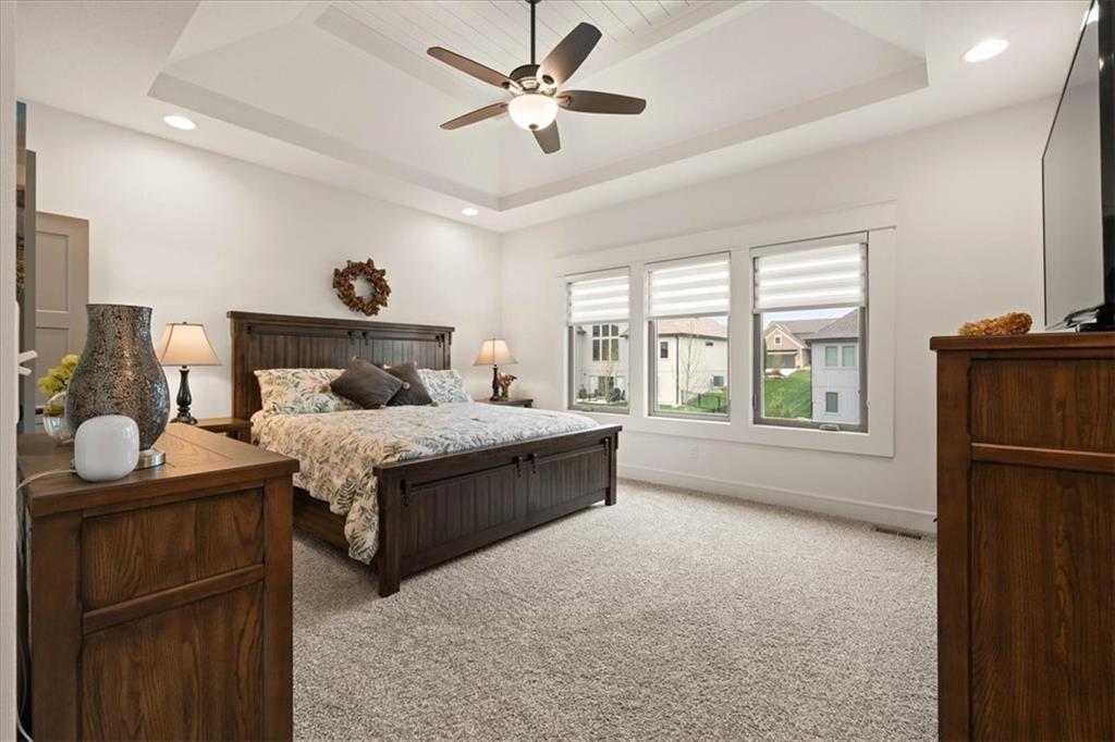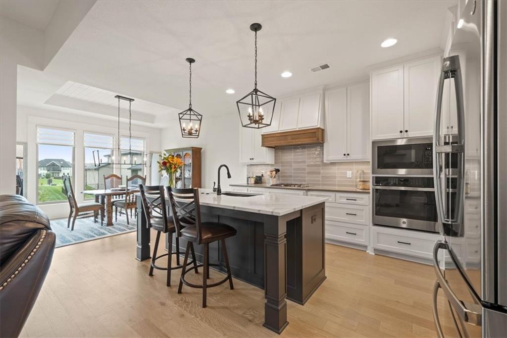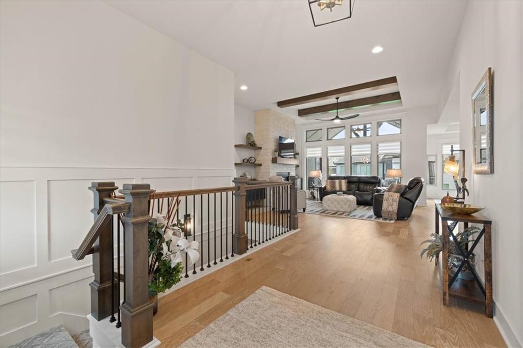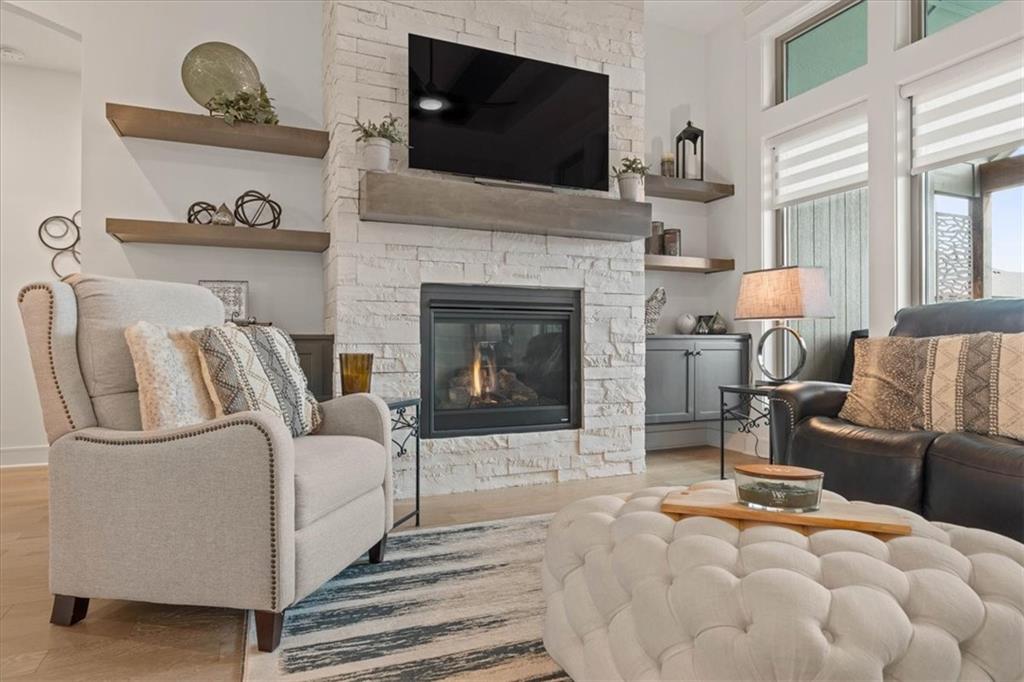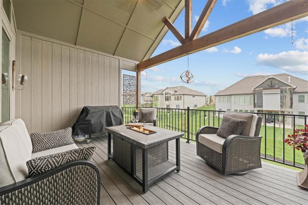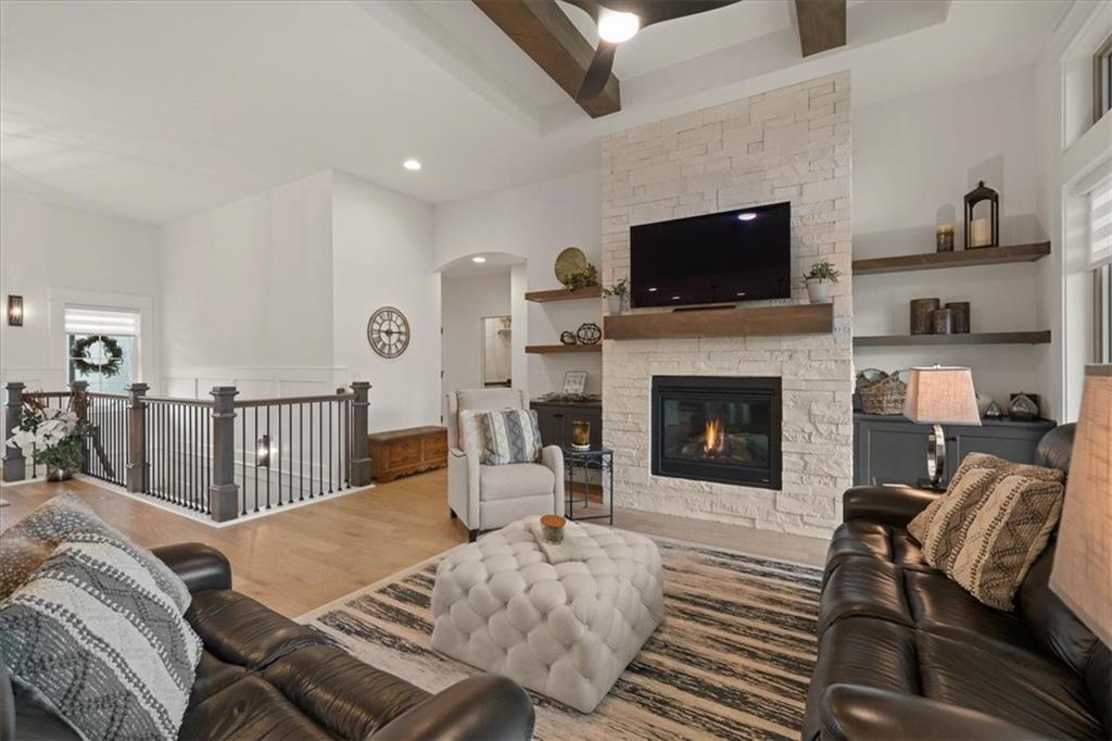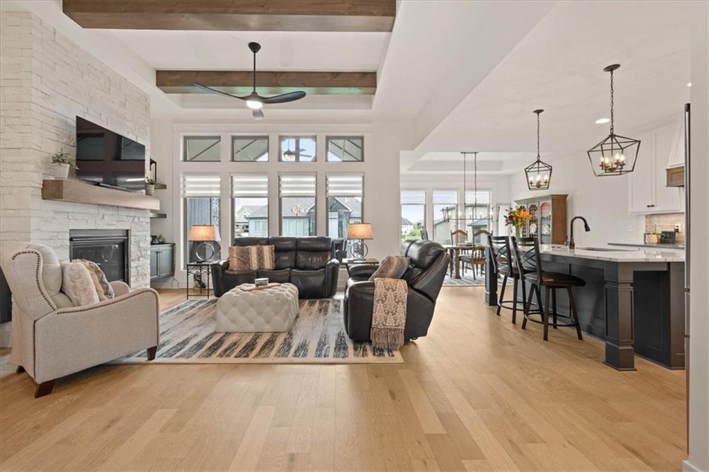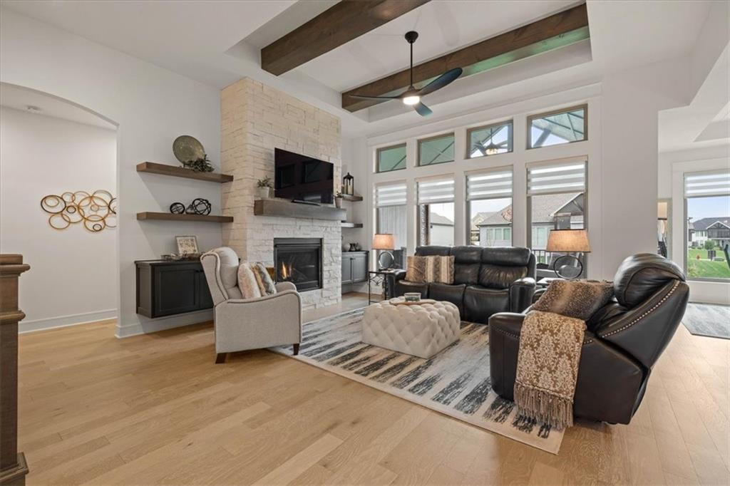Welcome to this stunning JFE custom-built home loaded with high-end finishes, thoughtful upgrades, and exceptional detail throughout in an excellent location. A charming front porch and grand double-door entry welcome you into a light-filled, open main level designed for both everyday living and entertaining. The spectacular kitchen is a true showpiece featuring abundant custom cabinetry, built-in trash storage, a massive quartz island, gas cooktop, and an oversized walk-in pantry. The kitchen flows seamlessly into the dining area and spacious living room highlighted by a dramatic floor-to-ceiling stone fireplace, flanked by built-in cabinetry and floating shelves. The luxurious primary suite is a true retreat with a spa-like ensuite bath offering a walk-in shower with dual shower heads, including a rain shower, and an incredible walk-in closet that connects directly to the laundry room. Every bedroom includes its own private bath, offering comfort and privacy for family and guests alike. The finished walkout lower level provides outstanding additional living space with a large rec room, stylish wet bar, two spacious bedrooms, two full baths, and still plenty of unfinished storage. Some of the many exceptional details include beautiful wood beams, inset tray ceilings with shiplap accents, Graber window treatments, extensive landscaping upgrades, an epoxy-coated garage floor and basement storage area, a 24-foot deep garage, an extended patio, and a covered composite deck perfect for relaxing or entertaining. Located in a vibrant amenity-rich community with miles of walking trails, a neighborhood pool, sand volleyball, a park and play area, several ponds (including one with a fishing dock), and easy access to James A. Reed Wildlife Area. This amazing home offers an exceptional lifestyle in one of the area’s most convenient and sought-after settings.