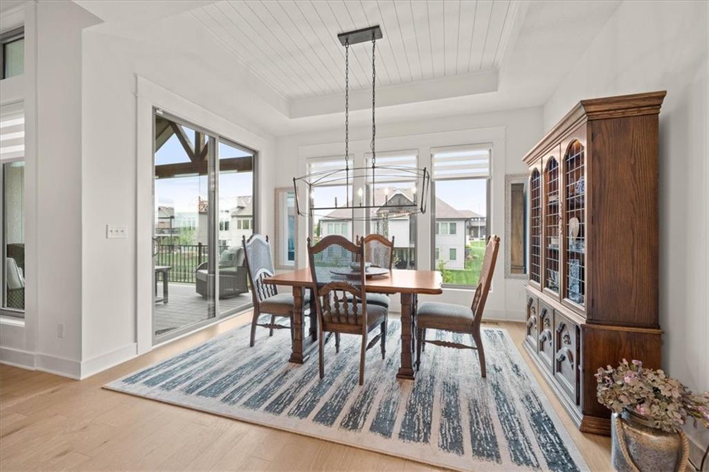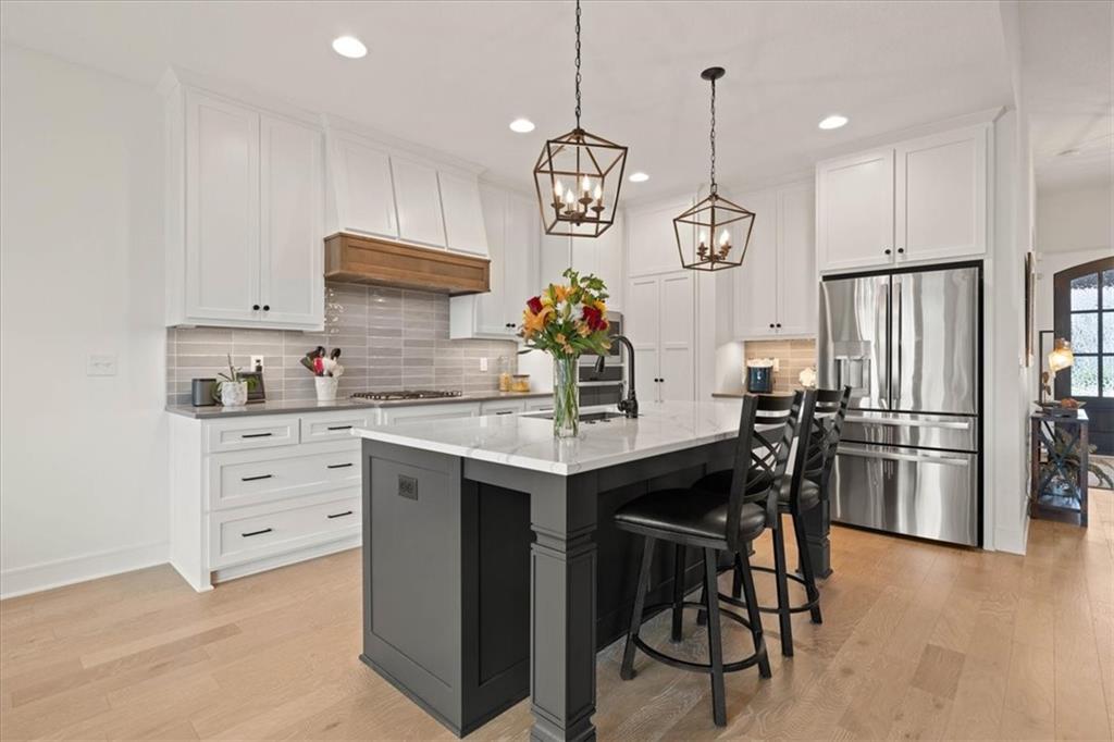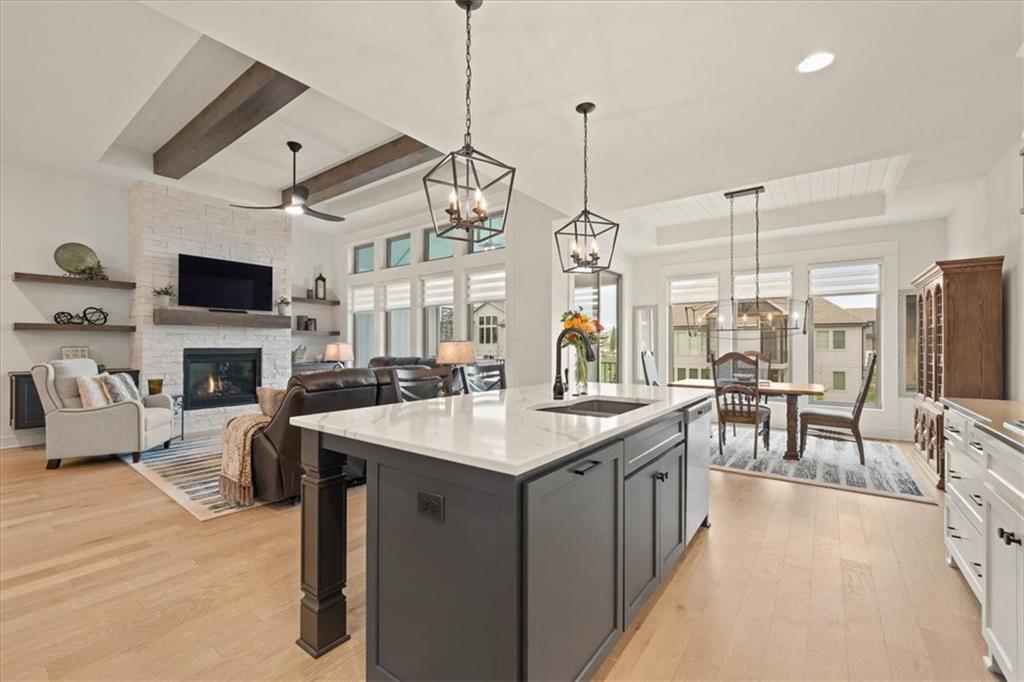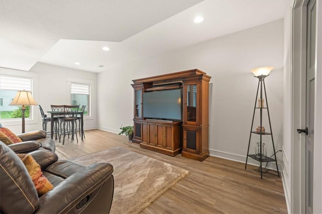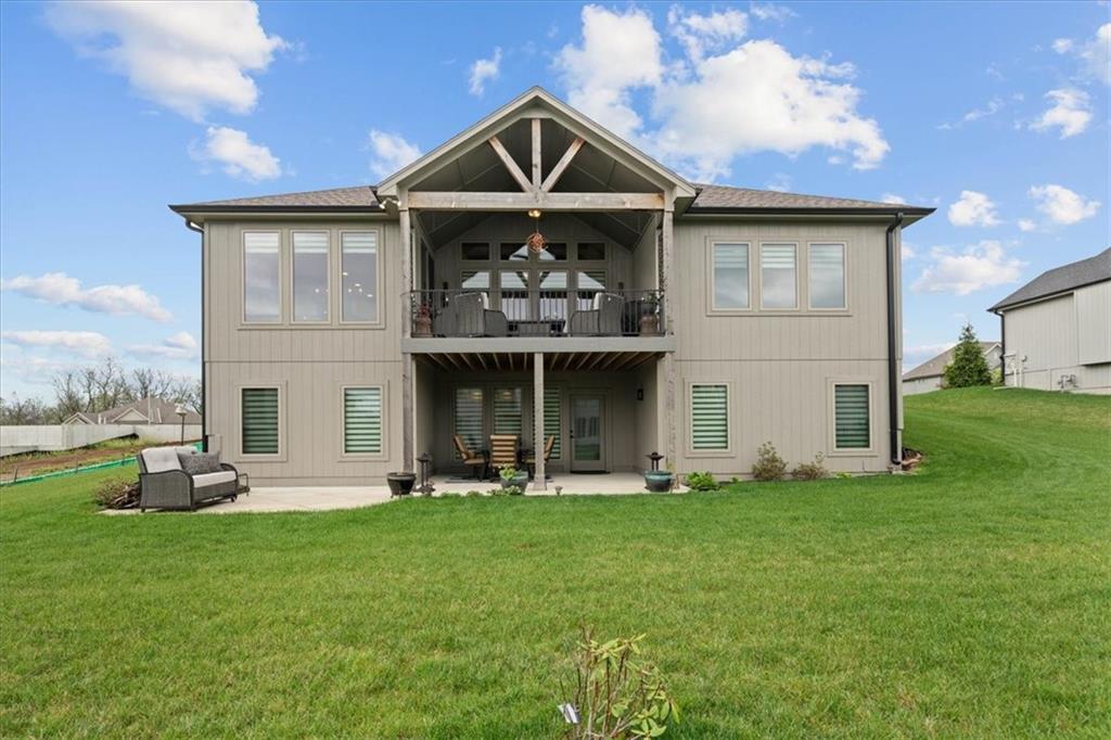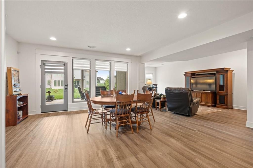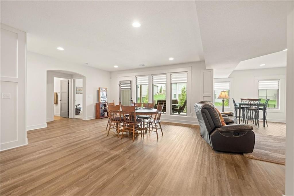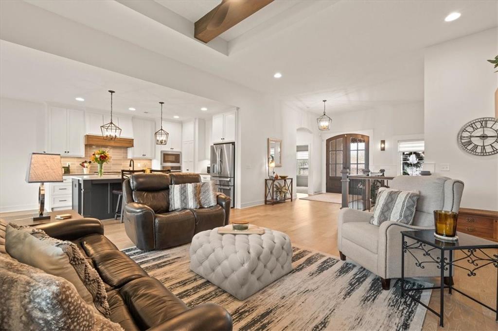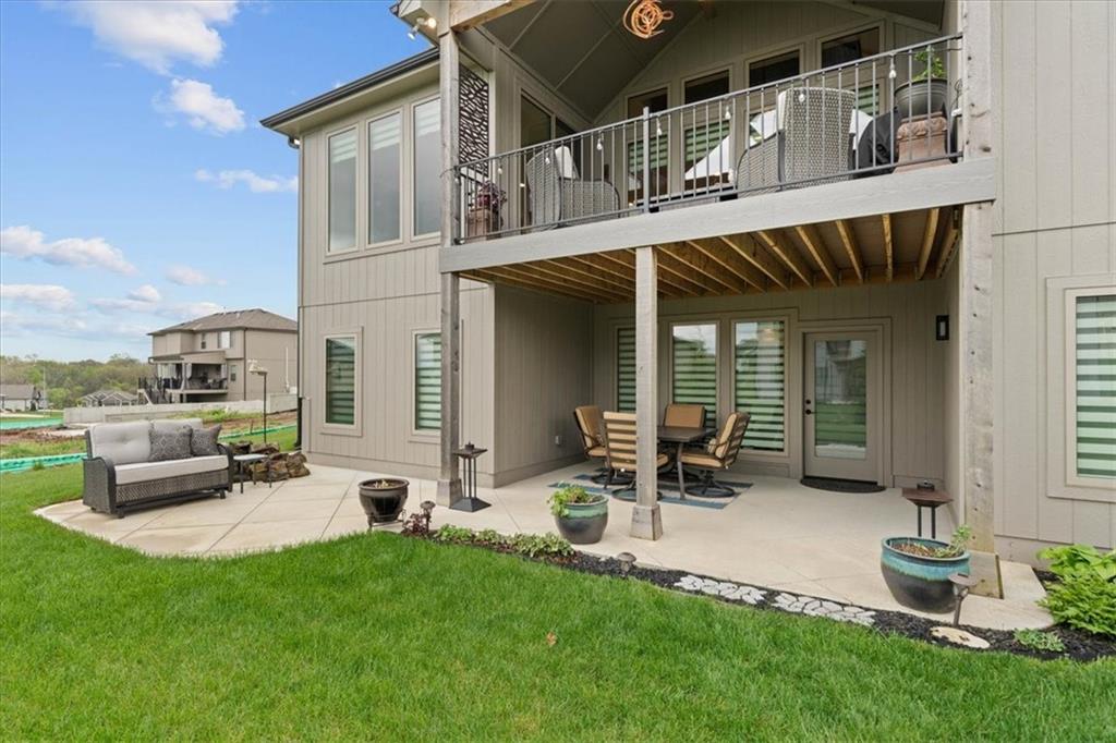 Welcome to this stunning JFE custom-built home loaded with high-end finishes, thoughtful upgrades, and exceptional detail throughout in an excellent location. A charming front porch and grand double-door entry welcome you into a light-filled, open main level designed for both everyday living and entertaining. The spectacular kitchen is a true showpiece featuring abundant custom cabinetry, built-in trash storage, a massive quartz island, gas cooktop, and an oversized walk-in pantry. The kitchen flows seamlessly into the dining area and spacious living room highlighted by a dramatic floor-to-ceiling stone fireplace, flanked by built-in cabinetry and floating shelves. The luxurious primary suite is a true retreat with a spa-like ensuite bath offering a walk-in shower with dual shower heads, including a rain shower, and an incredible walk-in closet that connects directly to the laundry room. Every bedroom includes its own private bath, offering comfort and privacy for family and guests alike. The finished walkout lower level provides outstanding additional living space with a large rec room, stylish wet bar, two spacious bedrooms, two full baths, and still plenty of unfinished storage. Some of the many exceptional details include beautiful wood beams, inset tray ceilings with shiplap accents, Graber window treatments, extensive landscaping upgrades, an epoxy-coated garage floor and basement storage area, a 24-foot deep garage, an extended patio, and a covered composite deck perfect for relaxing or entertaining. Located in a vibrant amenity-rich community with miles of walking trails, a neighborhood pool, sand volleyball, a park and play area, several ponds (including one with a fishing dock), and easy access to James A. Reed Wildlife Area. This amazing home offers an exceptional lifestyle in one of the area’s most convenient and sought-after settings.