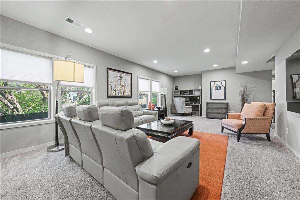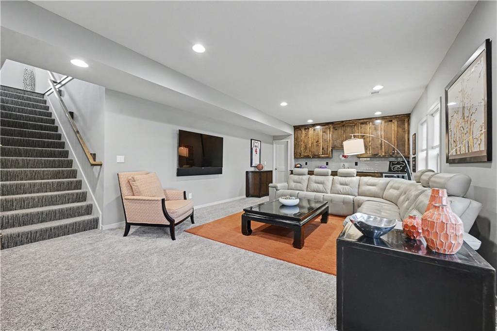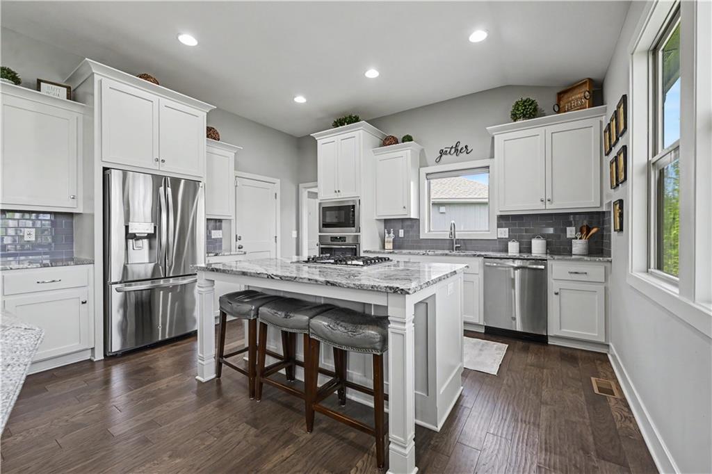 GORGEOUS reverse 1.5 story home on an amazing Cul De Sac in the heavily sought after Arbor Woods in Olathe with wonderful curb appeal! Beautiful gourmet kitchen with huge eat in granite island, with walk in pantry, hardwood floors, and stainless steel appliances. Lovely deck off conveniently located off kitchen - overlooking the beautiful treed view- great for grilling and entertaining! Spacious Master BR with ensuite with vaulted ceiling, carpet, shower, double vanities with granite tops, walk through closet, laundry and another bedroom/office all on main floor. Lower level has HUGE family room with wet bar, with third large bedroom with full bath, and large storage.