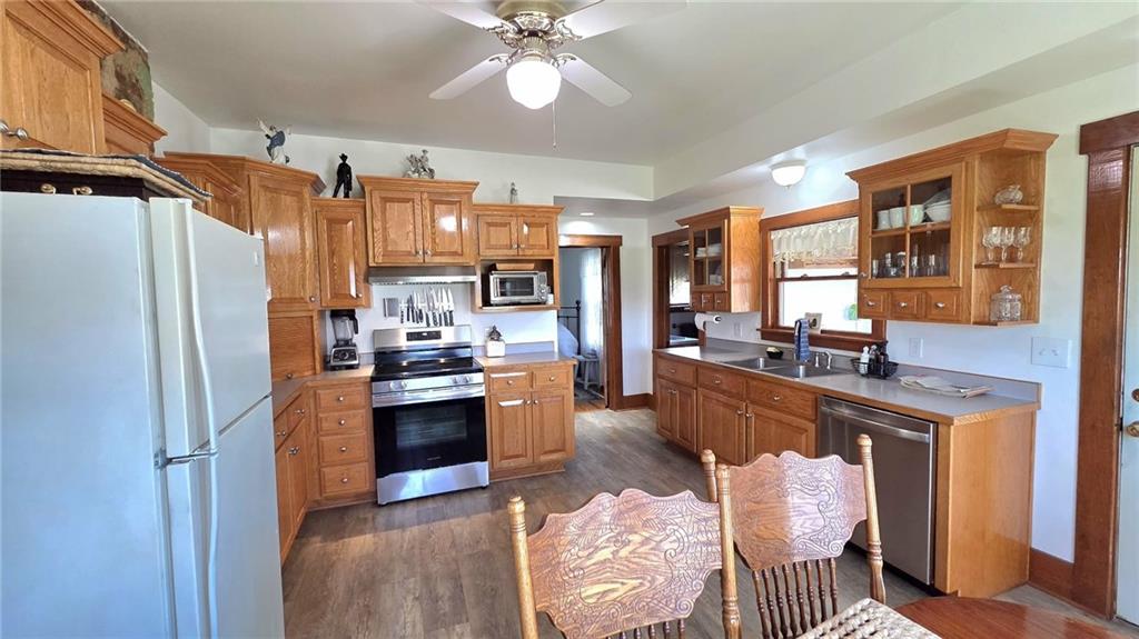 Dead End Road, Picture Perfect 35.02 Acre Mapleton, KS Homestead! This meticulously maintained 3-bed, 2-bath home is impressive from the moment you pull up. The home has been preserved, maintaining much of the beautiful woodwork throughout, while modern upgrades make this home inviting and comfortable. The home has received upgrades, including newer vinyl exterior windows, complete custom solid oak kitchen cabinetry & countertops. Just off the kitchen is a grand dining room featuring original French doors. Additionally, this home features a huge sunroom, multiple large closets, and an unfinished partial basement. As you enter the front door, you will be greeted by the beautiful, original staircase banister that leads you to 2 bedrooms and 1 bath, featuring a beautiful, primitive claw-foot tub. Need room for additional guests? This property features a detached guest quarters. This is nicely finished, featuring heating and cooling. Multiple storage sheds and parking places exist in the 2 detached garages and one turn-of-the-century impressive old school hay barn. The hay barn upstairs is in very nice condition and is currently used for storage. The land is equally impressive, featuring lush cool-season grasses, and barbed wire fencing for horses, 4 ponds throughout the property providing excellent year-round livestock water source, or the fishing enthusiast. The south side of the land rolls slightly downhill with thick brush and trees providing an excellent white-tailed hunting experience. This is a rate property as it has had all the work done. *Furnace is propane, propane is owned.