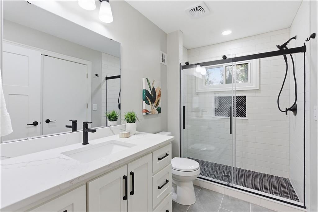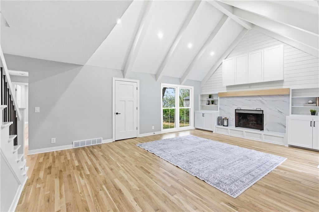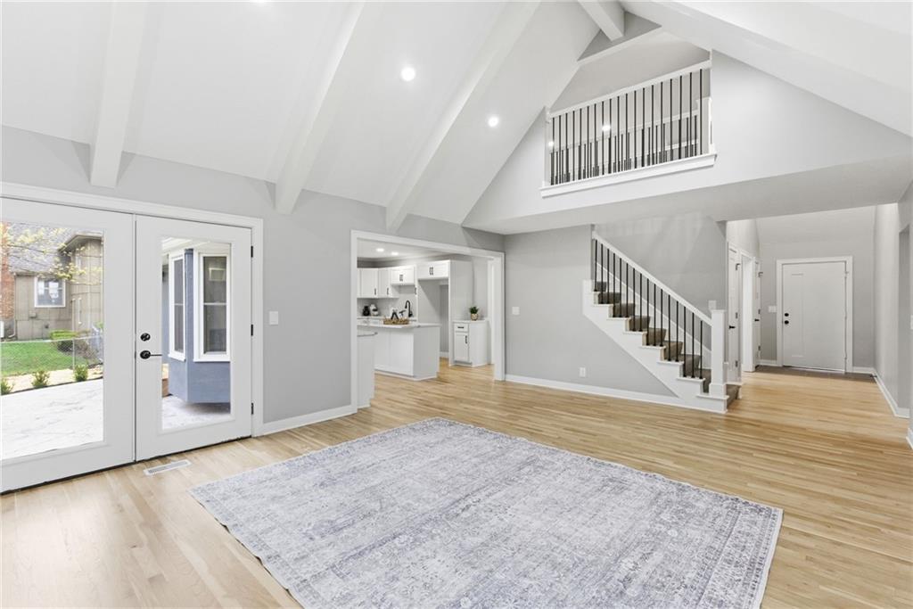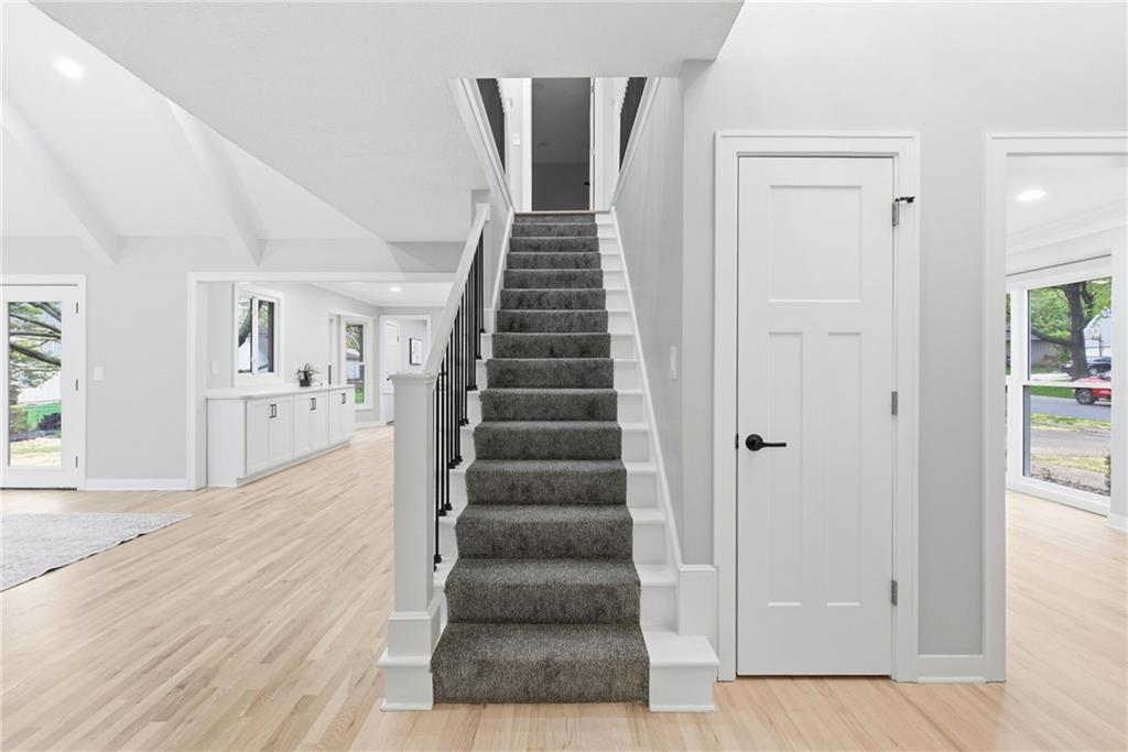 Welcome to your dream home in the heart of Leawood, ideally situated within the highly sought-after Blue Valley school district, ranked in the top 1% of school districts nationally. This exceptional home feeds into Leawood Elementary and Middle Schools, both just a short 10-minute walk or less than a 3-minute drive away. Blue Valley North High School is also conveniently located, only a 10-minute drive from your doorstep. This stunningly transformed home promises spacious living, making it an ideal retreat for larger families seeking both comfort and luxury. As you enter, you'll appreciate the thoughtfully designed open floor plan that harmonizes functionality with elegance. The chef's kitchen features custom craftsman-style cabinetry, quartz countertops, and stainless steel appliances—all overlooking a bright and airy hearth room with soaring vaulted ceilings. The main level also boasts a formal living room and dining room, perfect for hosting gatherings and family meals. In addition, the main level includes a luxurious primary ensuite bedroom. A 2nd bedroom and full bath cater to guests or family, while the newly designed mudroom offers convenient access from both the garage and the expansive stamped concrete back patio. Recent updates include a new roof and HVAC system, both less than a year old. Venture upstairs to discover two additional bedrooms, a full bath, and a huge loft living space, ideal for family game nights or a children's play area. The lower level features yet another ensuite bedroom, an additional bedroom and bath, a rec room complete with a wet bar, and a private office space for remote work or study. The exterior of the home boasts beautiful new lap siding on the front enhancing its curb appeal, while the remaining three sides feature elegant stucco. The property has also been meticulously updated with new landscaping and freshly applied seed & fertilizer, ensuring a lush green space for children to play and family barbecues to enjoy.