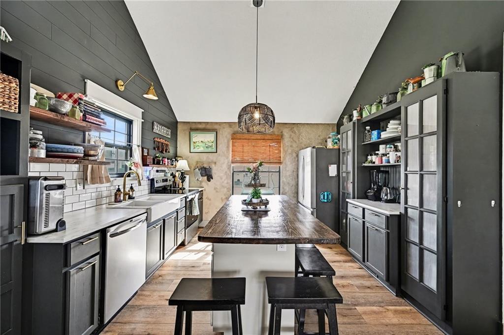 Tucked at the end of the street, this split-entry offers an open main level with living, dining, and kitchen space, vaulted ceilings, great natural light, and a cozy sitting nook. Fireplace with built-in shelving creates a warm focal point in the living area. Kitchen includes a farmhouse sink, stainless steel appliances, and charming accents throughout. Bedrooms and baths are well laid out for everyday living. Finished lower level adds additional living space—ideal for a second living area, rec room, or flex space, plus a tucked-away nook under the stairs currently used as a kids’ play area. Large garage offers extra room for storage, hobbies, or workspace. Situated on a generous lot with room to spread out, including a fire pit area. Roof approximately 10 years old; HVAC serviced in 2025.